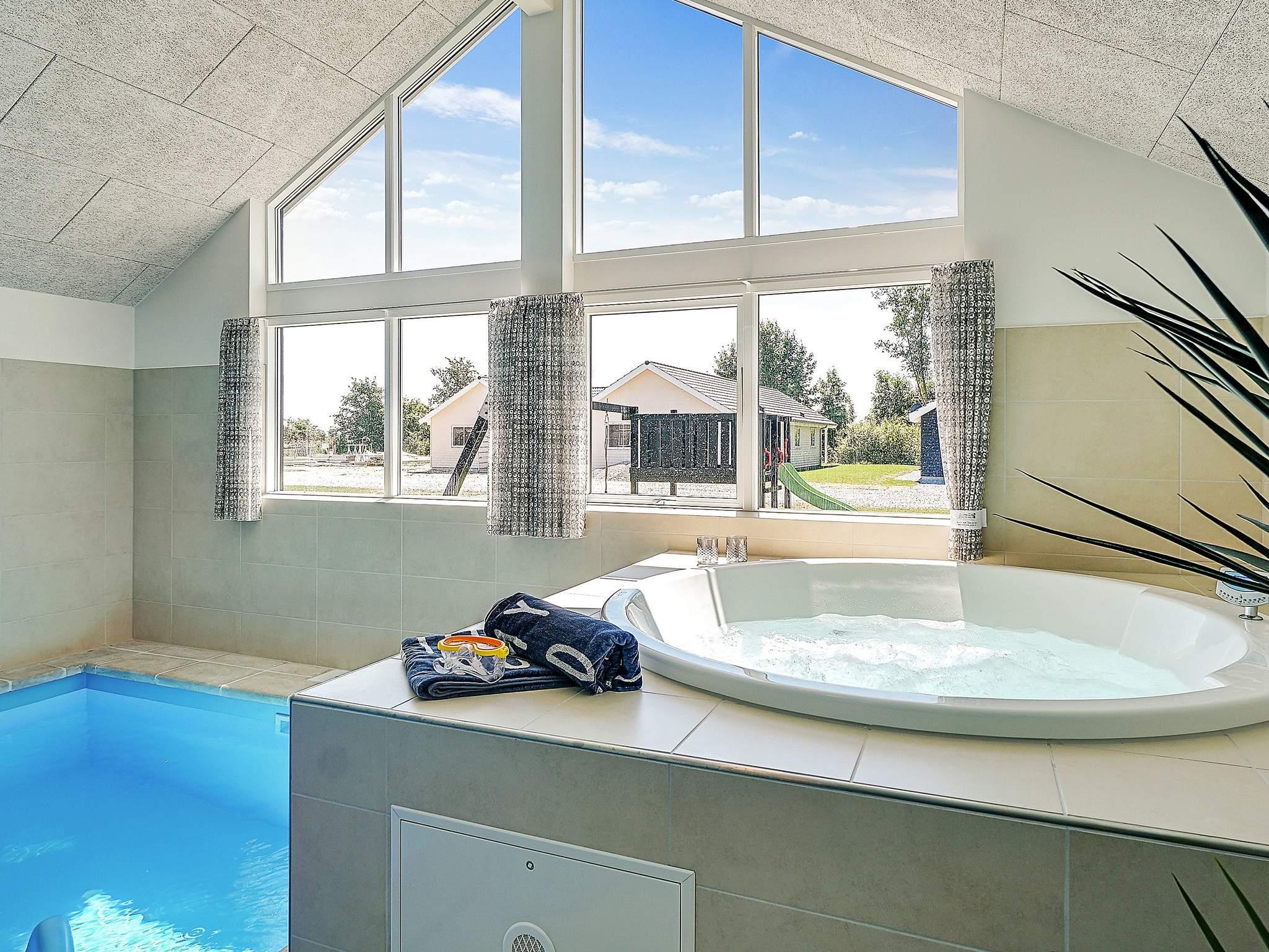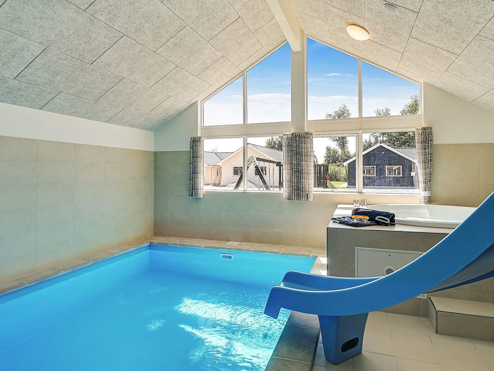 I dette aktivitets og wellness-sommerhus kan I nyde den 18 m2 store swimmingpool med modstrømsanlæg og vandrutschebane lige fra morgenstunden. Bagefter kan I slappe af i spabadet og saunaen og lade kroppen op. Klar til dagens udfordringer kan I spise morgenmad i det veludstyrede køkken med det store spisebord med plads til hele familien. Brændeovnen sørger for behagelig varme på kølige dage. Den kan I naturligvis også nyde i sofahjørnet foran fjernsynet. Ved siden af køkken-opholdsrummet finder I aktivitetsrummet med billardbord, bordfodbold, bordtennis, dartskive og PlayStation4, som både store og små kan fornøje sig med. I forlængelse af aktivitetsrummet, som også er udstyret med bar med køleskab, finder I tre soveværelser samt et badeværelse. De andre tre soveværelser samt et badeværelser ligger ved entreen og så er der et ekstra badeværelse i poolrummet. Enkeltsengene kan skubbes sammen til en dobbeltseng. Hemsen med fire madrasser og tv vil specielt de større børn nyde. På grunden, der omkranser huset, er der tænkt på de mindste gæster med gynge, rutsje og sandkasse. På grund af husets størrelse afviger prisen på dette Skanlux-sommerhus fra den normale listepris. Vær opmærksom på, at driften af poolen samt brugen af modstrømsanlægget, saunaen og spaen medfører et forhøjet forbrug af strøm og vand. Afhængigt af årstiden og brugen må der derfor påregnes forhøjede forbrugsomkostninger.