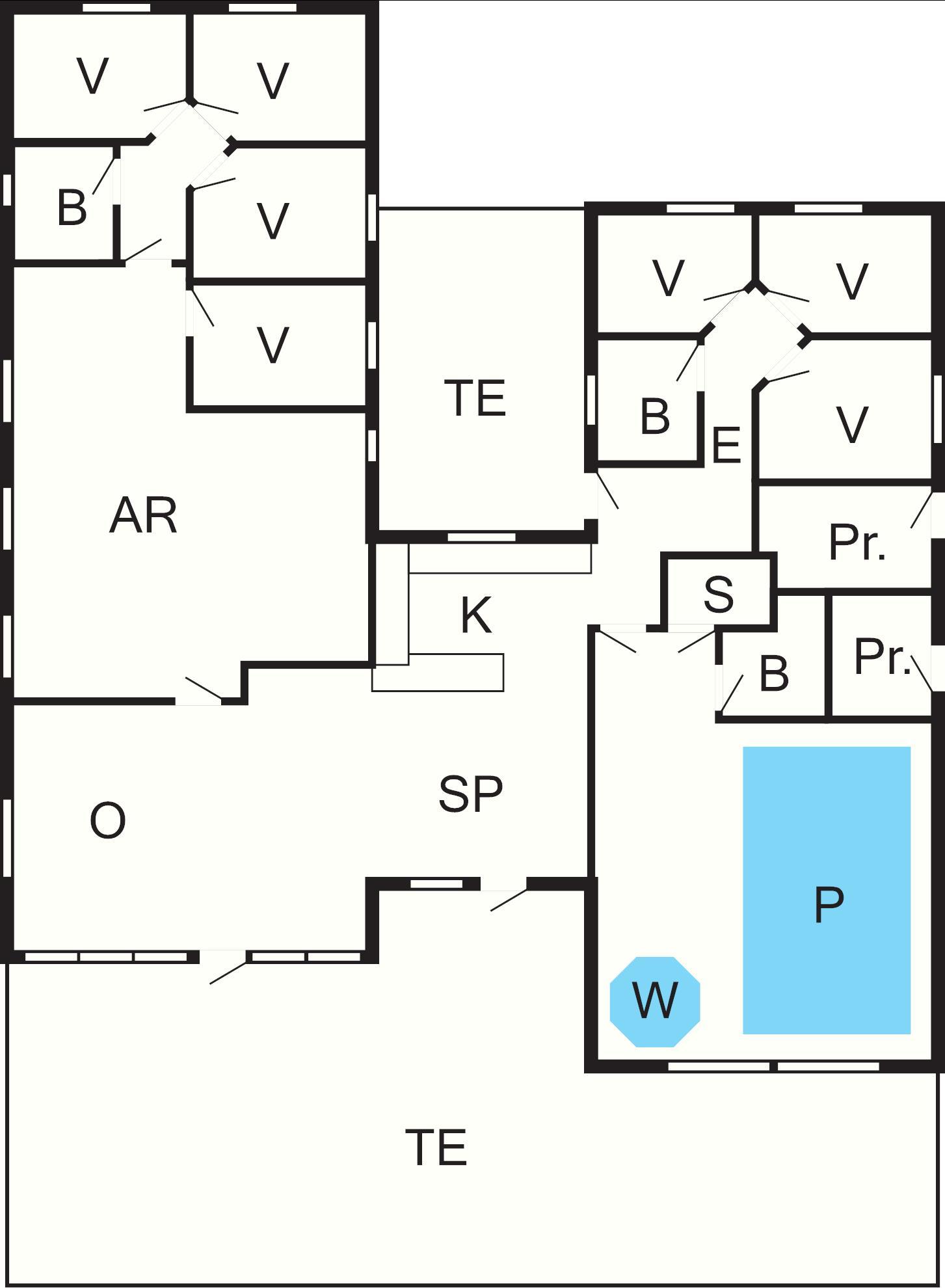 7 Soveværelser: (2S)+(2S)+(2S)+(2S)+(2S)+(2S)+(2S), barneseng