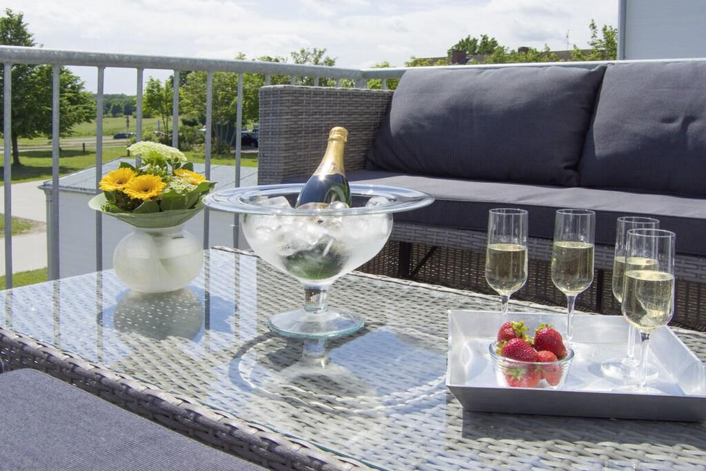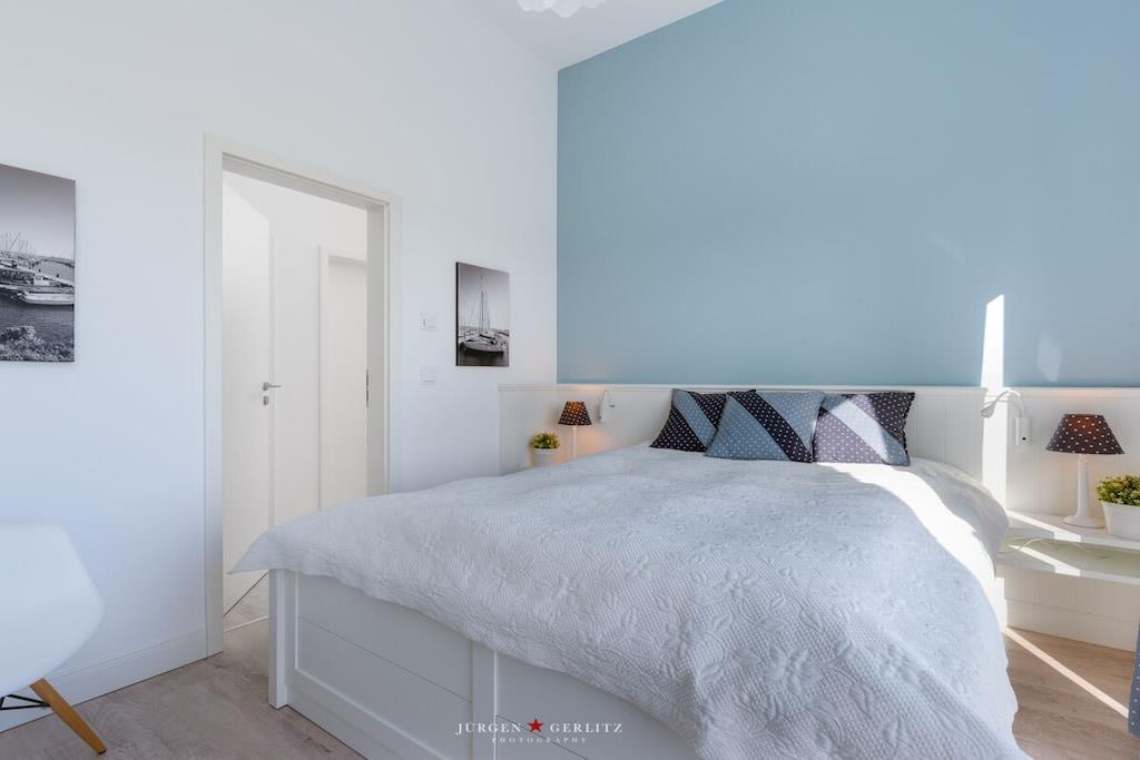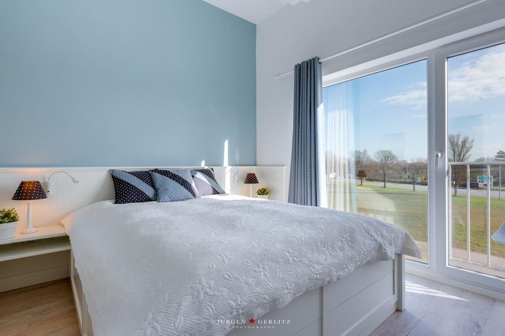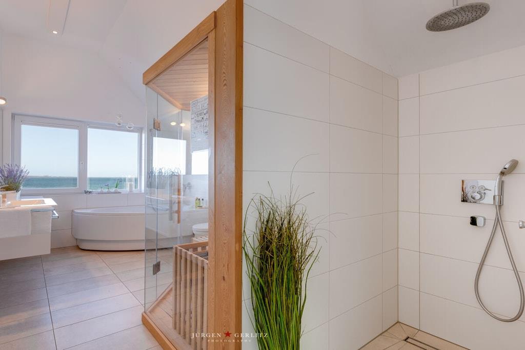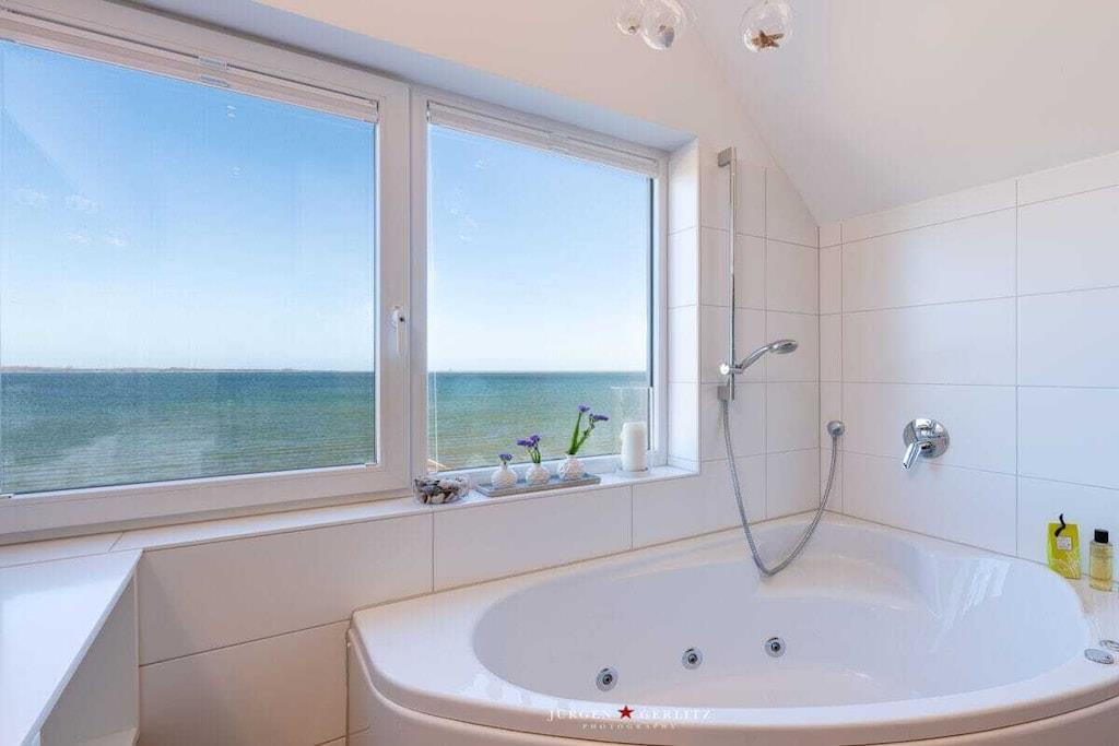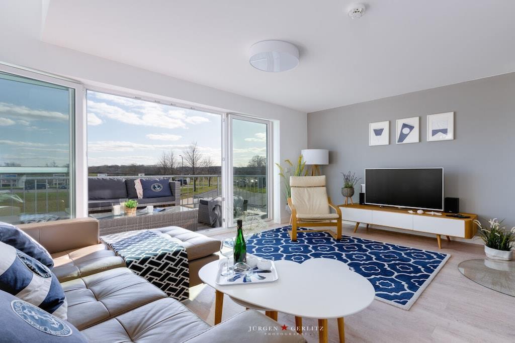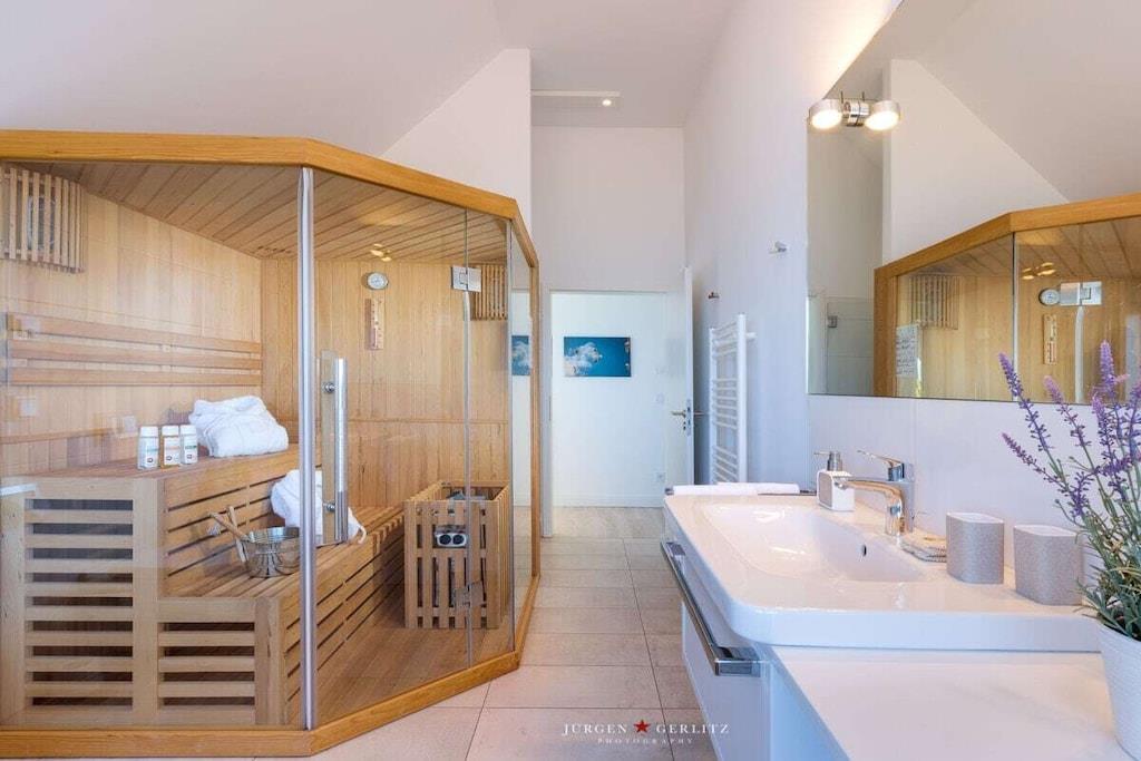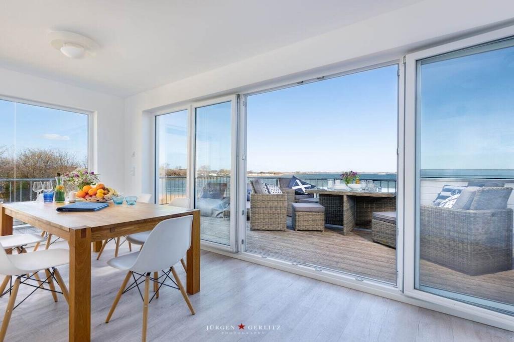 Welcome to this exclusive holiday apartment in the OstseeResort Olpenitz, just 20 meters from the water, right on the banks of the Schlei arm of the Baltic Sea. The apartment extends over two floors (1st and 2nd floor) and has been furnished with selected luxury furniture in Scandinavian style. As soon as you enter, you will be greeted by an inviting atmosphere. The panoramic windows in the dining area, the bedroom and the spacious bathroom offer you a breathtaking panoramic view of passing sailboats and the picturesque Schlei estuary. The great terrace offers the perfect place to relax and enjoy the view of the water. You can also experience the beauty of the surroundings from the panoramic windows in the living room. A fireplace not only gives the living area a cozy feel, but also creates a warm and inviting atmosphere. There is also a second balcony at your disposal, which offers a view of the greenery. The absolute highlight of this apartment awaits you on the top floor: a wellness bathroom that impresses with a whirlpool, rain shower and a private Finnish glass sauna with a view of the water. Here you can perfectly relax and leave everyday life behind you. The two bedrooms are also on the same floor and boast comfortable double beds, generous storage space and fantastic views of the water or the greenery. This stylish apartment can accommodate up to 4 people thanks to an extra bed.
