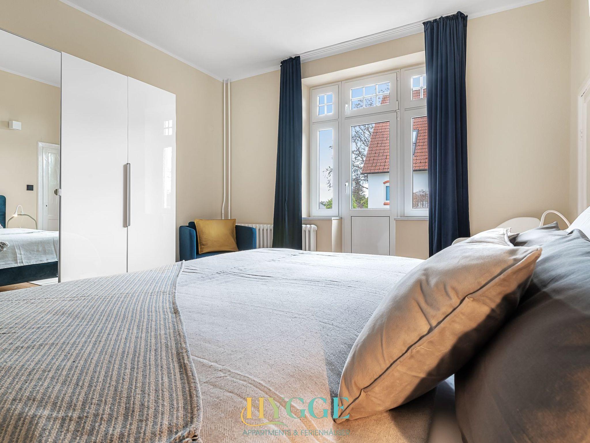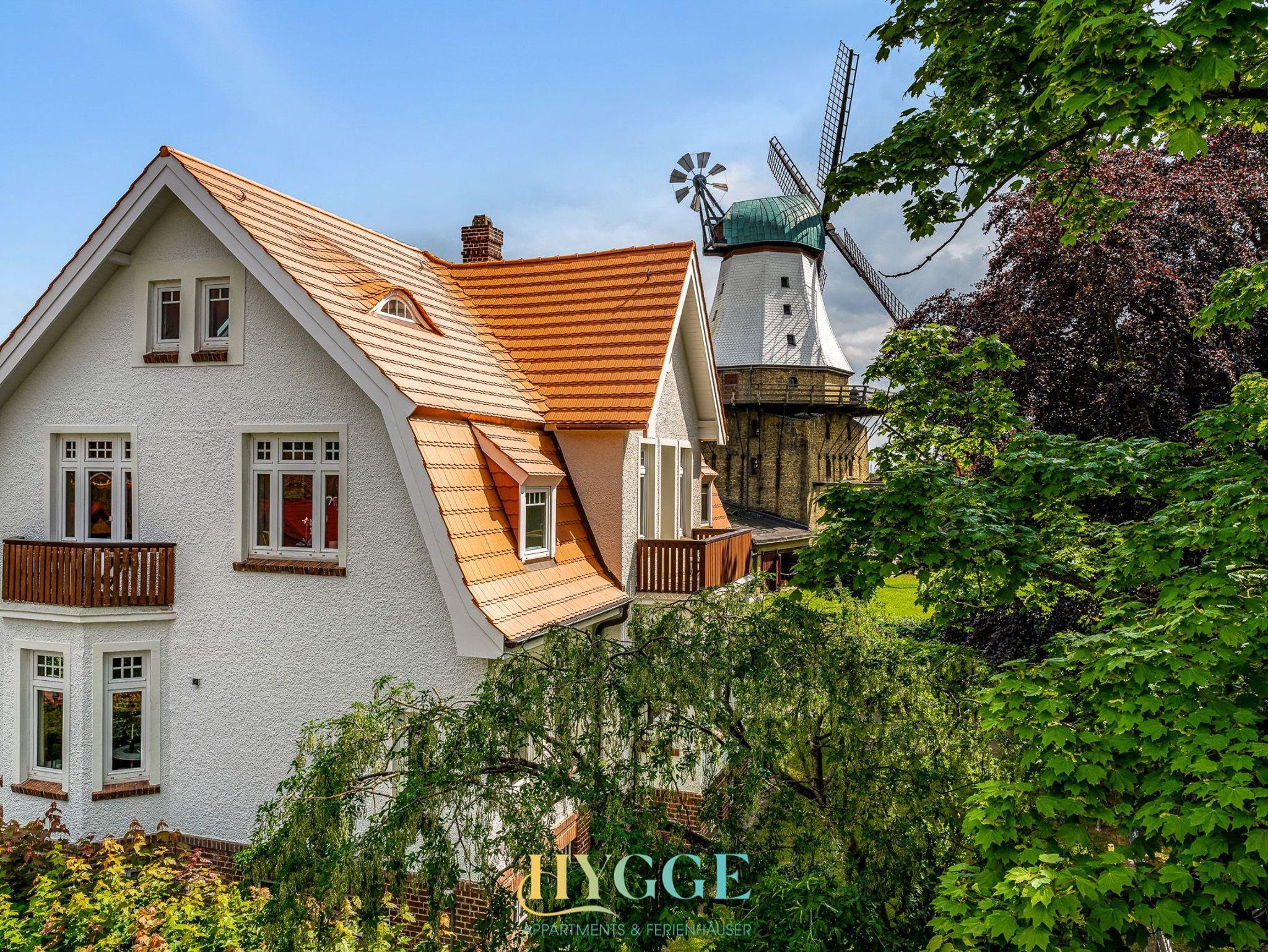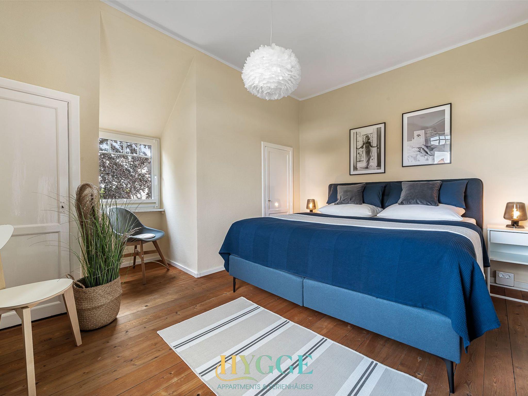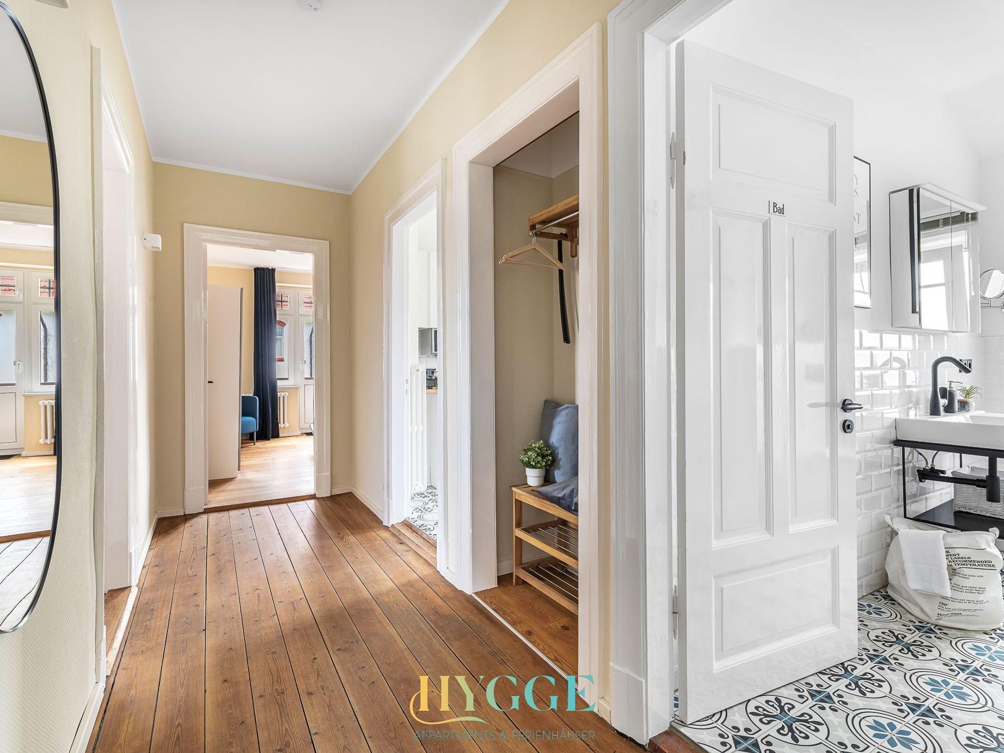 Diese schöne Altbauwohnung befindet sich im 1.OG der Villa Hygge mit Balkon im Wohnzimmer und Schlafzimmer. Alle Zimmer sind mit einem Flur verbunden. Die Wohnung ist mit historischem Holzfussboden ausgestattet. Schlafzimmer 1 hat ein großes Boxspringbett mit Blick auf den Mühle Amanda. Schlafzimmer 2 geht seitlich zum Objekt Richtung Westen raus. Das große Wohnzimmer hat ein angeschlossenes Esszimmer mit Platz für bis zu sechs Personen. Die Küche ist separat gegeüber des Wohnzimmers. Das Duschbad mit WC wurde komplett neu konzpiert und wie die gesamte Wohnung 2022 fertig gestellt.