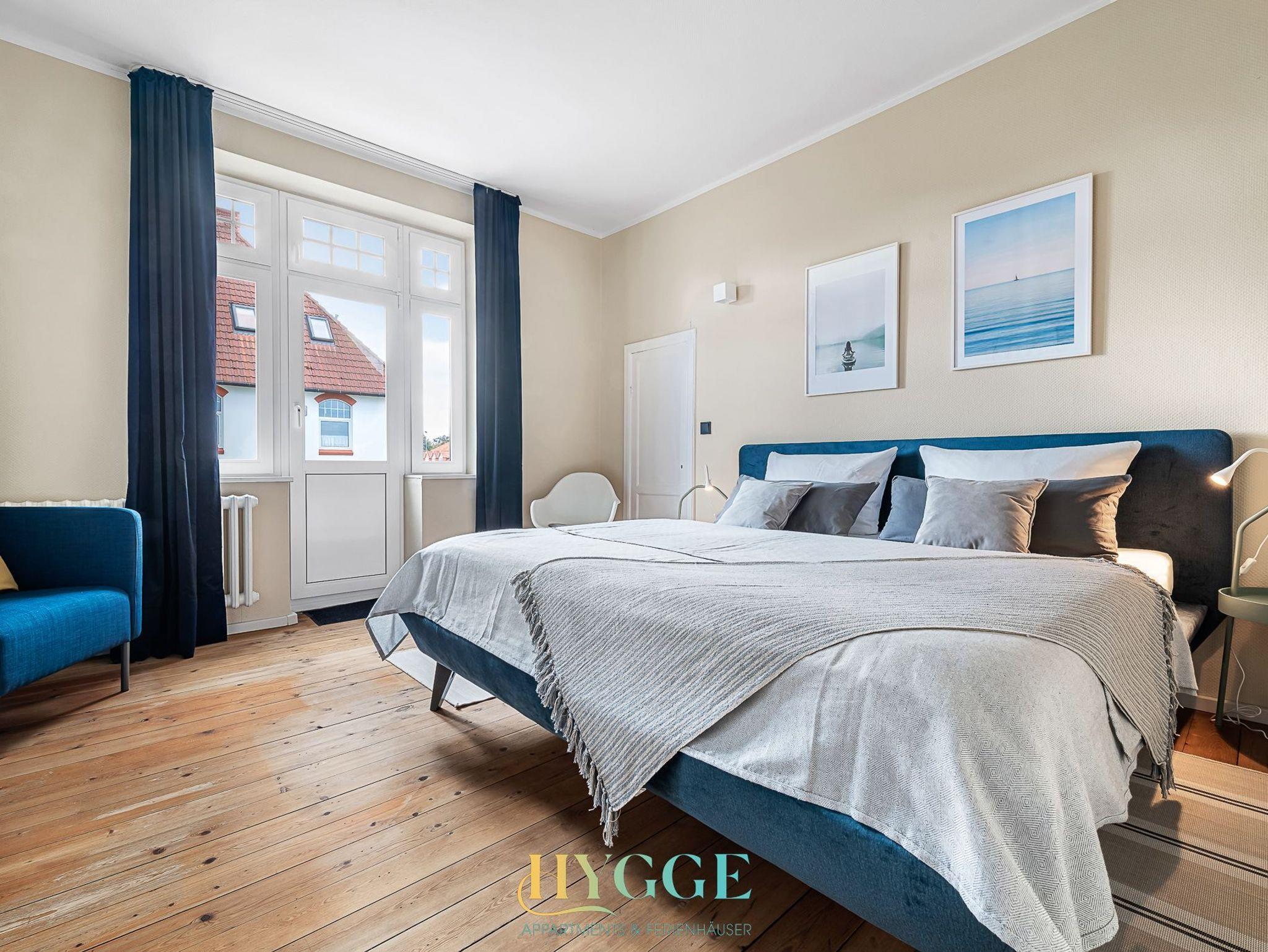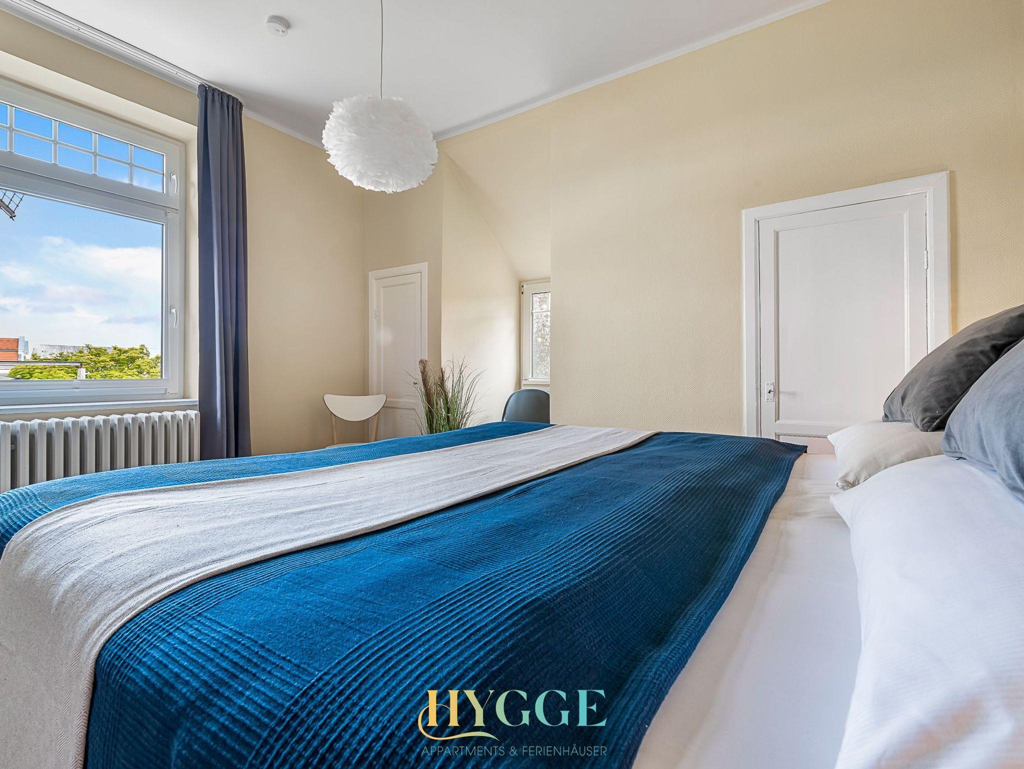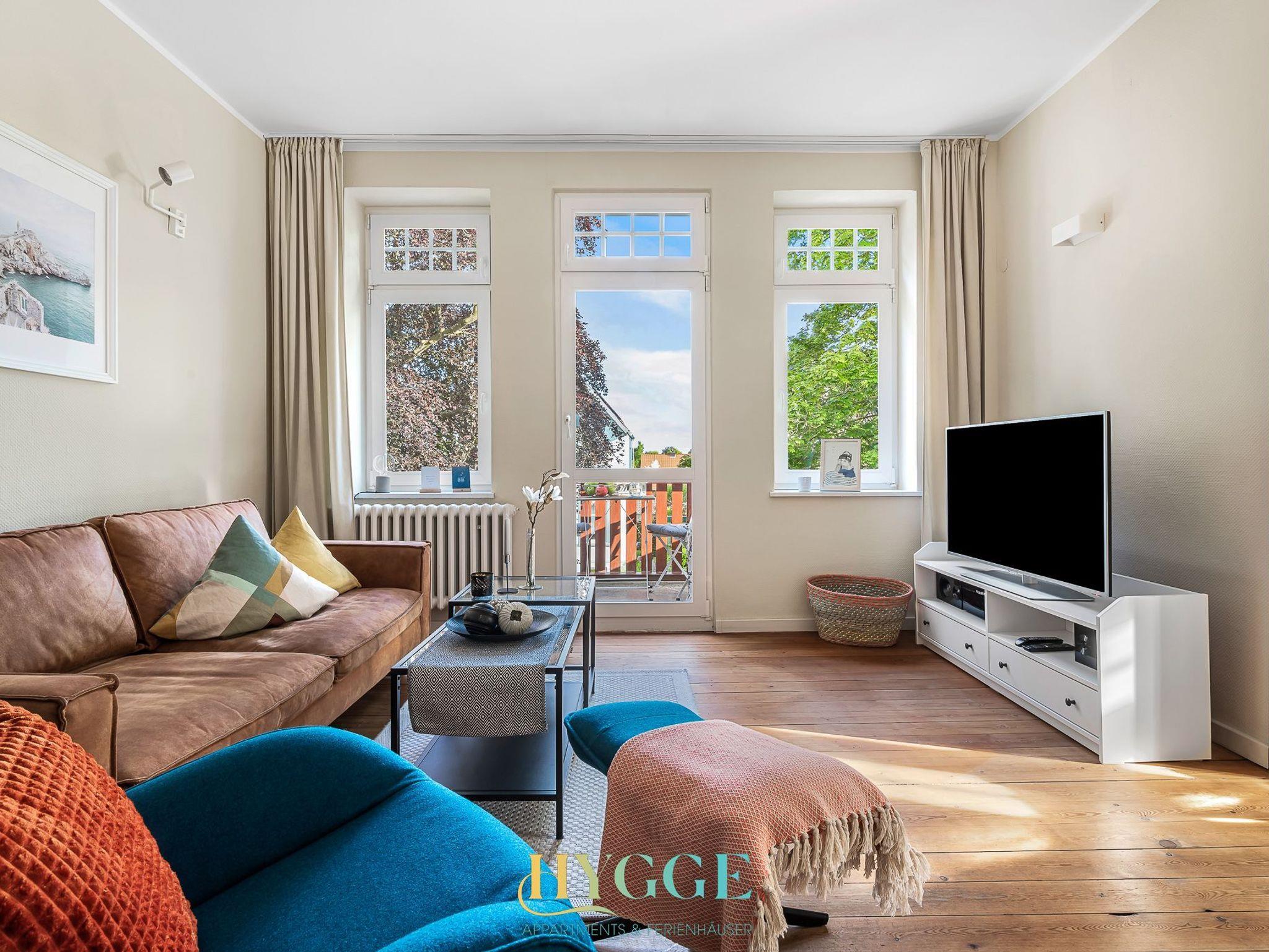 Diese schöne Altbauwohnung befindet sich im 1.OG der Villa Hygge mit Balkon im Wohnzimmer und Schlafzimmer. Alle Zimmer sind mit einem Flur verbunden. Die Wohnung ist mit historischem Holzfussboden ausgestattet. Schlafzimmer 1 hat ein großes Boxspringbett mit Blick auf den Mühle Amanda. Schlafzimmer 2 geht seitlich zum Objekt Richtung Westen raus. Das große Wohnzimmer hat ein angeschlossenes Esszimmer mit Platz für bis zu sechs Personen. Die Küche ist separat gegeüber des Wohnzimmers. Das Duschbad mit WC wurde komplett neu konzpiert und wie die gesamte Wohnung 2022 fertig gestellt.