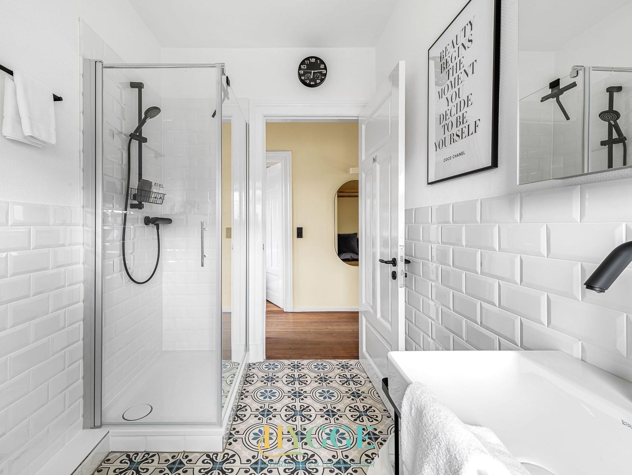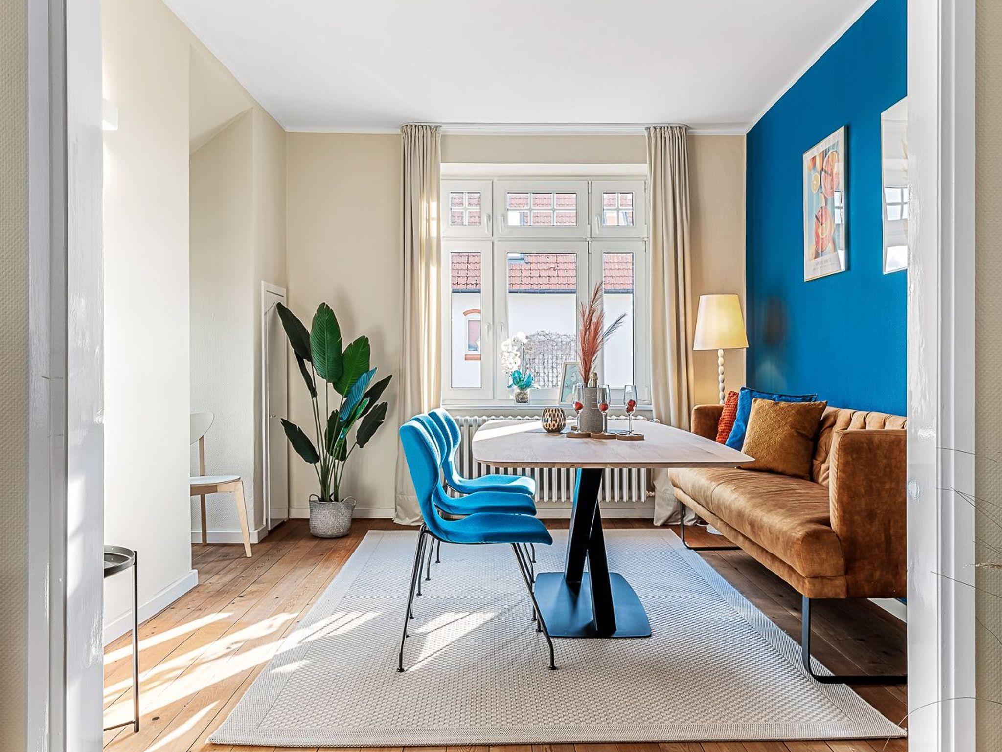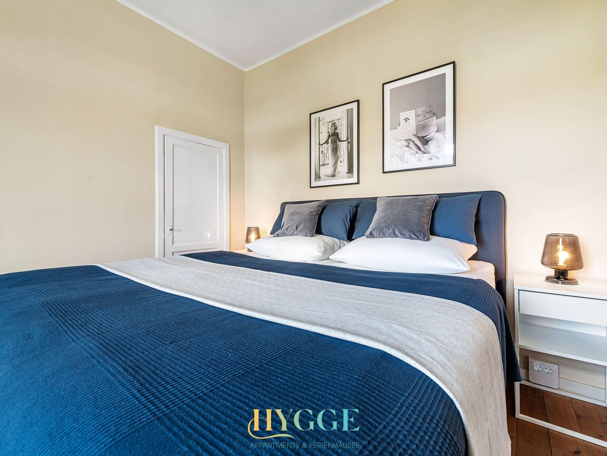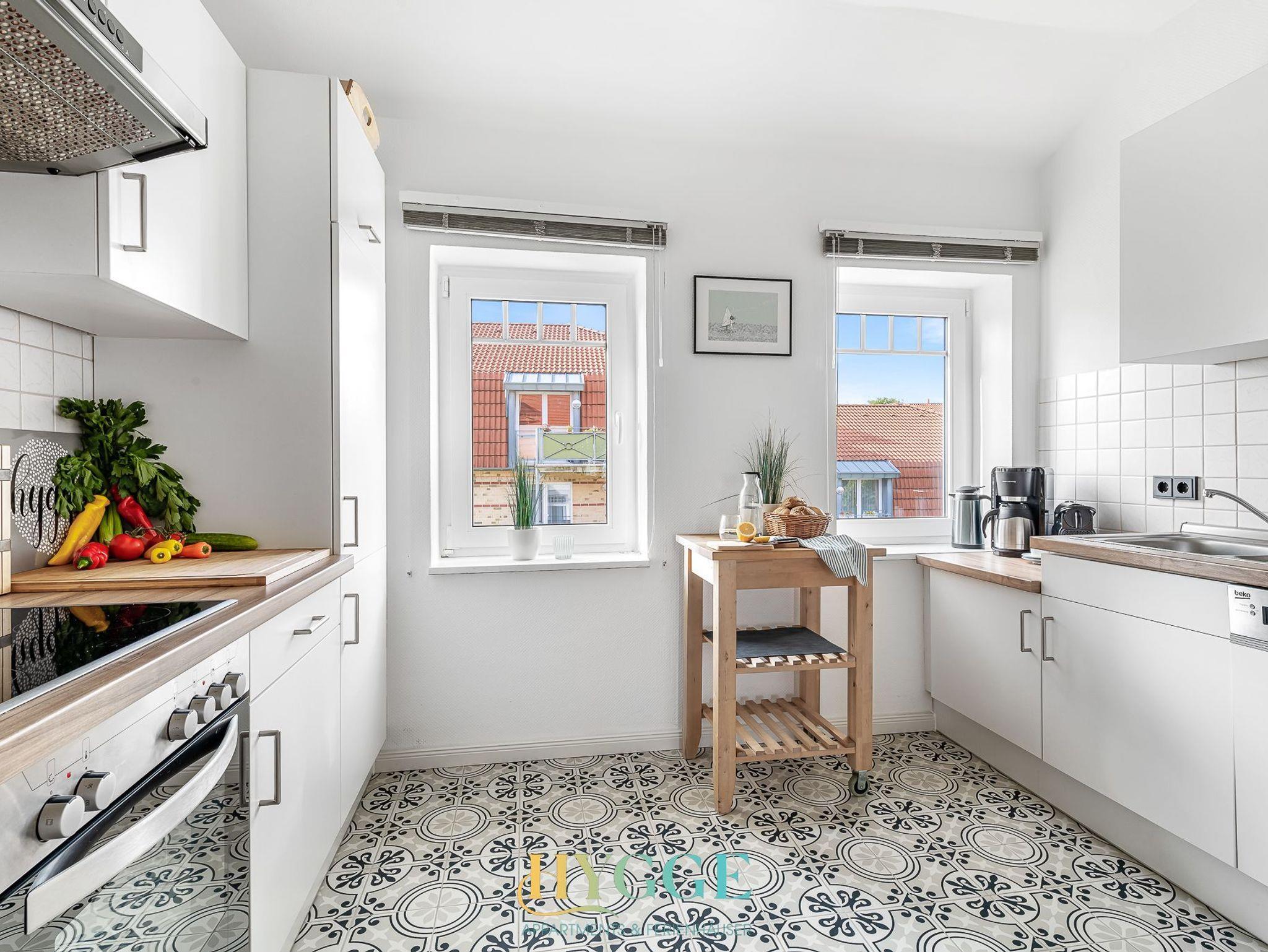 Diese schöne Altbauwohnung befindet sich im 1.OG der Villa Hygge mit Balkon im Wohnzimmer und Schlafzimmer. Alle Zimmer sind mit einem Flur verbunden. Die Wohnung ist mit historischem Holzfussboden ausgestattet. Schlafzimmer 1 hat ein großes Boxspringbett mit Blick auf den Mühle Amanda. Schlafzimmer 2 geht seitlich zum Objekt Richtung Westen raus. Das große Wohnzimmer hat ein angeschlossenes Esszimmer mit Platz für bis zu sechs Personen. Die Küche ist separat gegeüber des Wohnzimmers. Das Duschbad mit WC wurde komplett neu konzpiert und wie die gesamte Wohnung 2022 fertig gestellt.