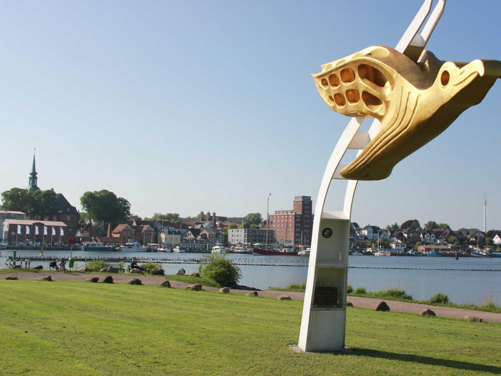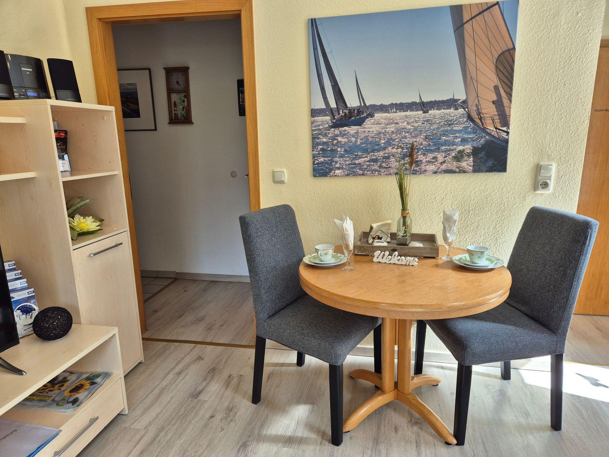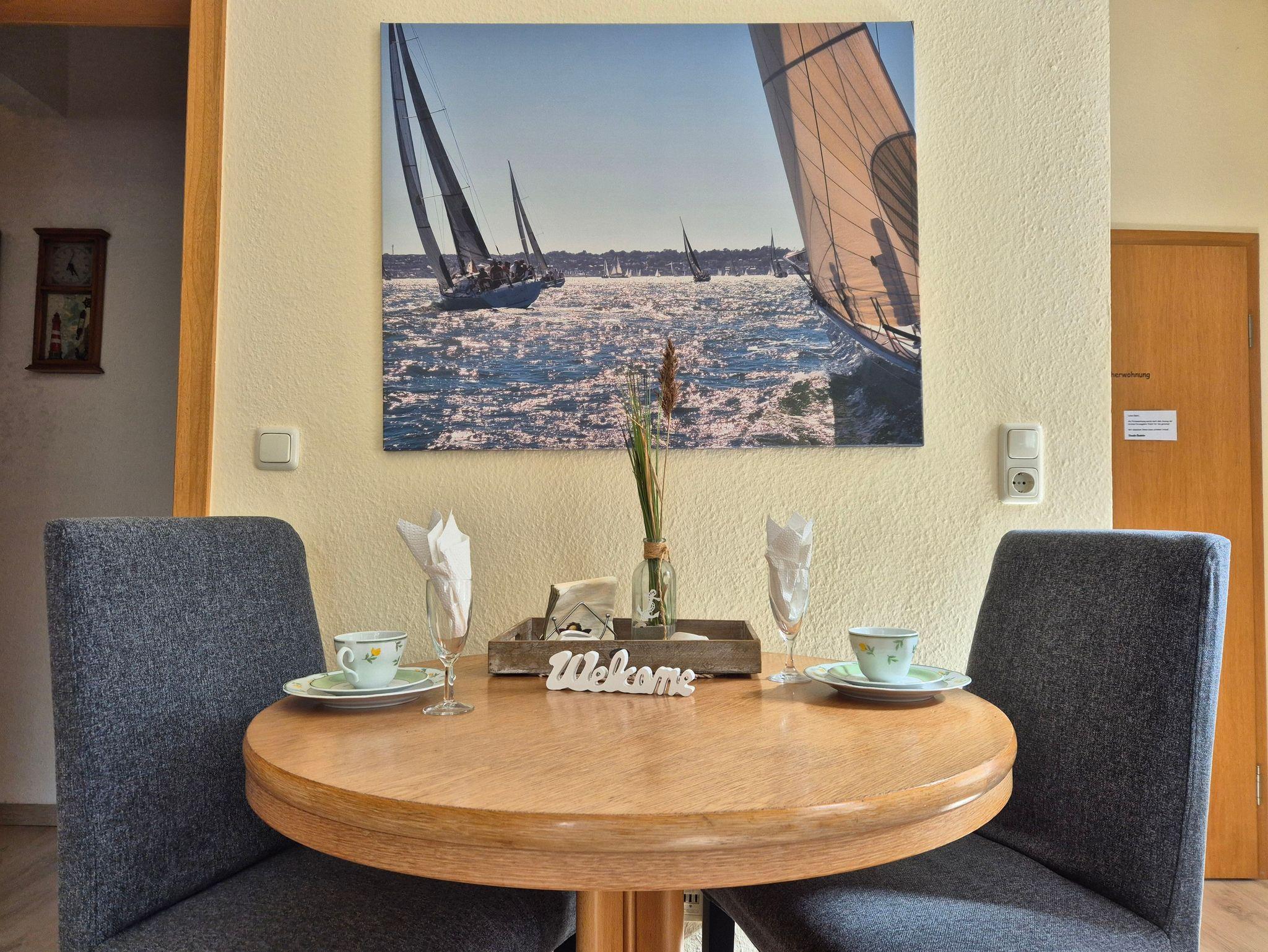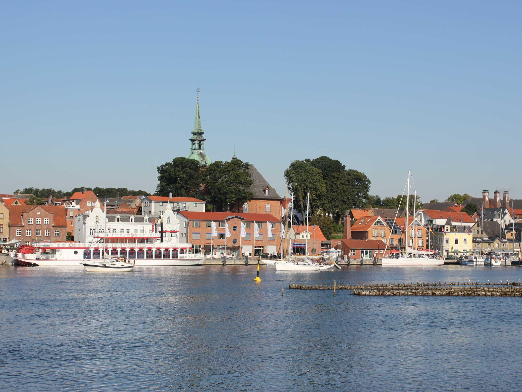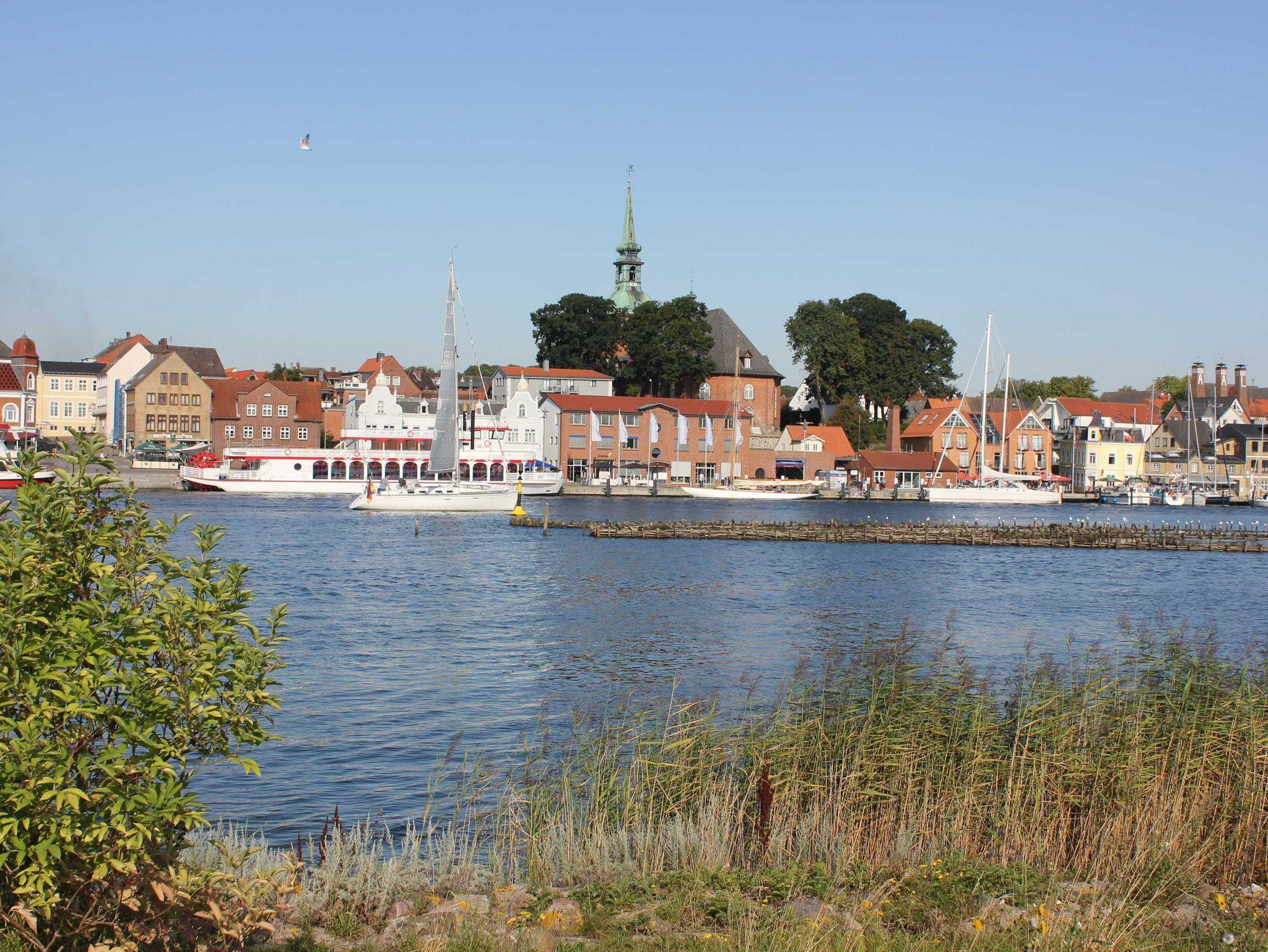 Gemütliche, liebevoll, helle eingerichtete Ferienwohnung im 1. OG mit seitlichem Schleiblick am Tagesliegerhafen und Blick auf die St. Nikolai-Kirche. Nichtraucherwohnung.