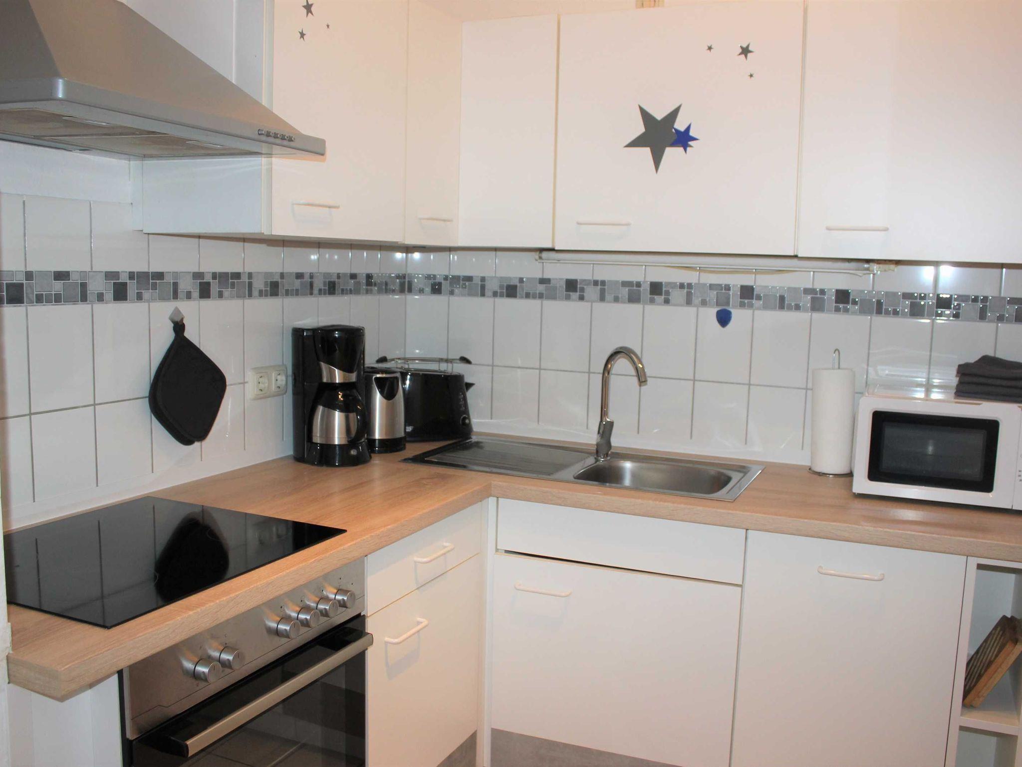 • komplett ausgestattete Einbauküche mit Cerankochfeld und Backofen, Geschirrspülmaschine, Kühl-/Gefrierschrank, Mikrowelle, Wasserkocher, Toaster, Kaffeemaschine