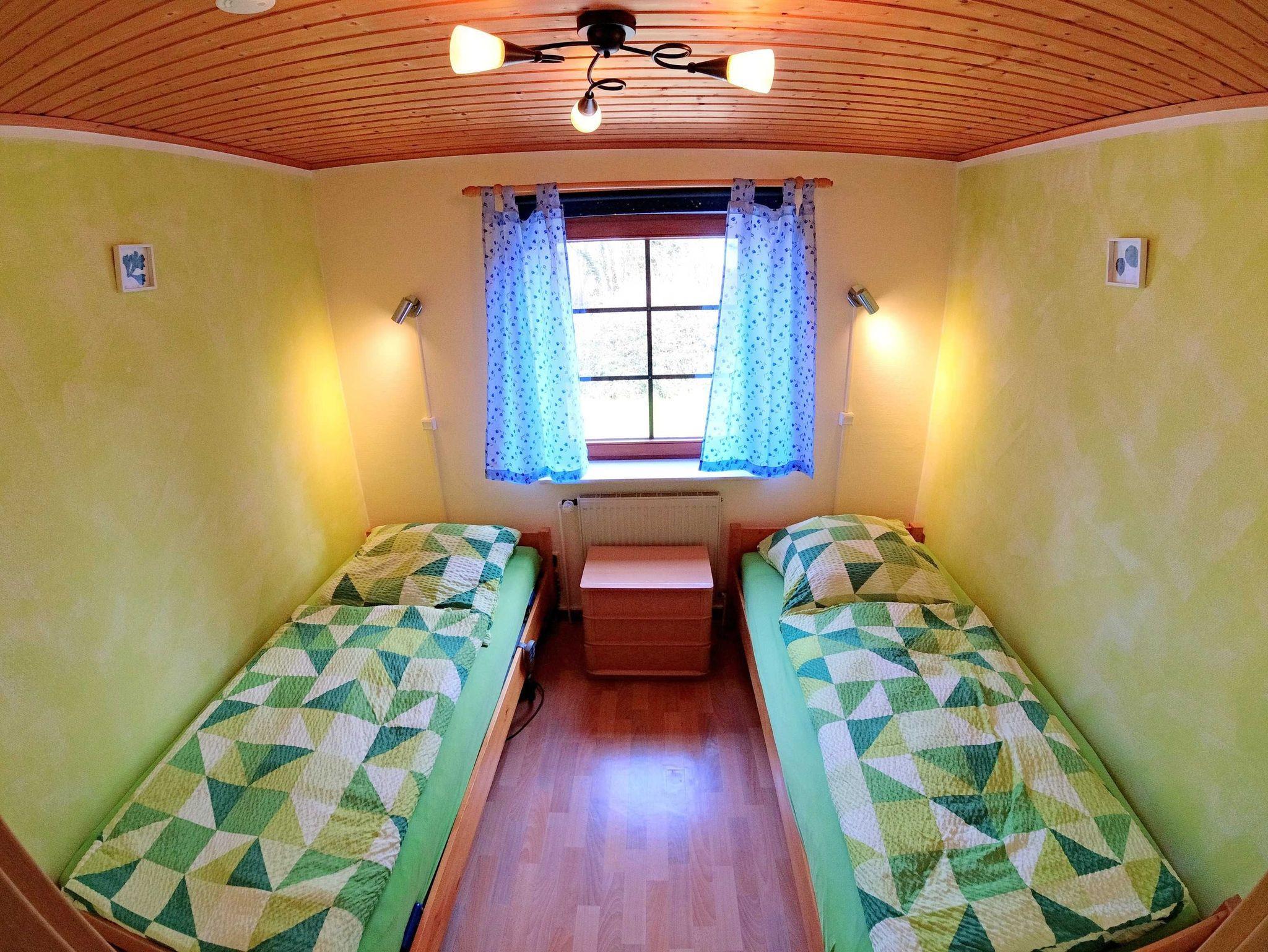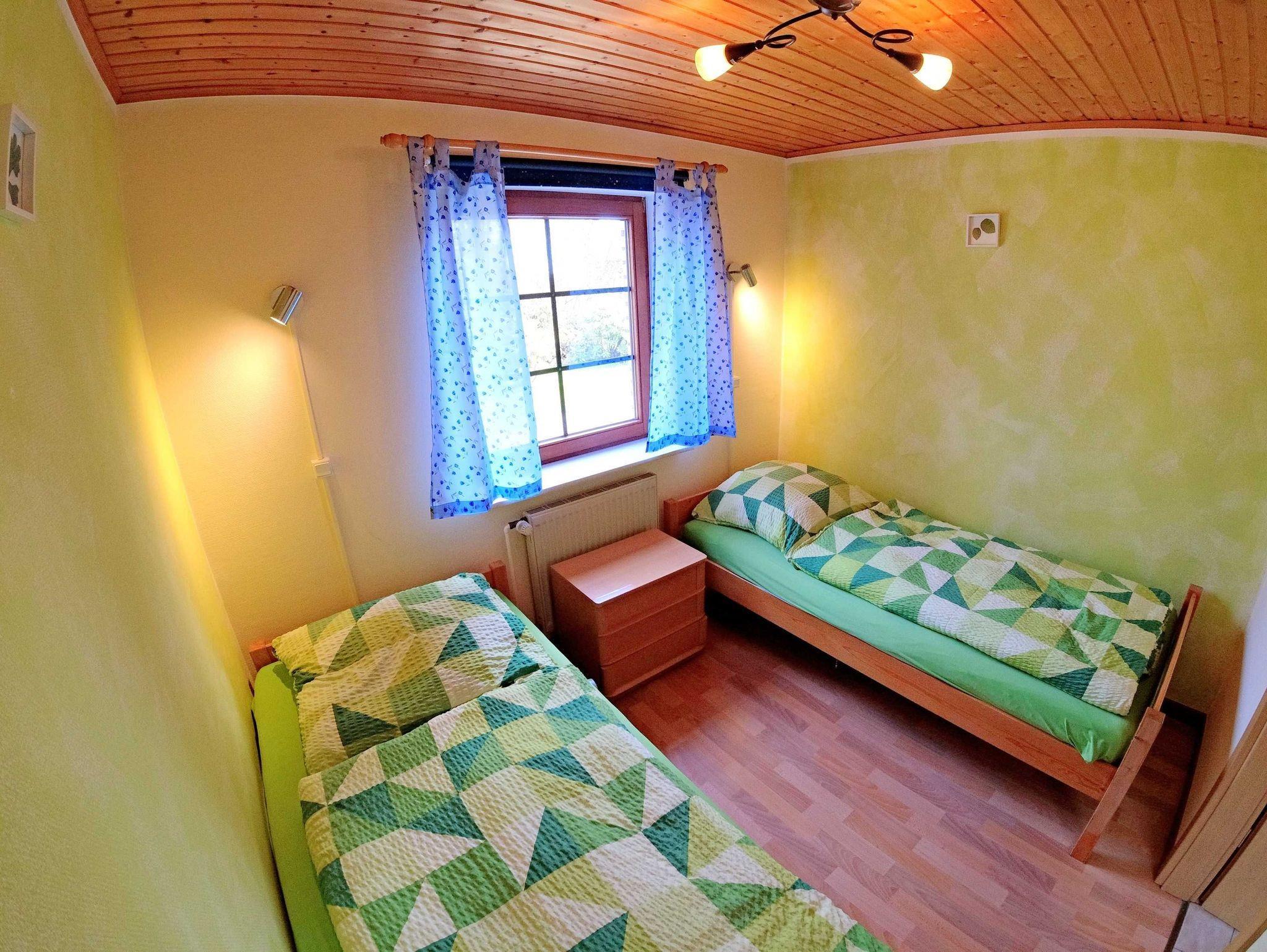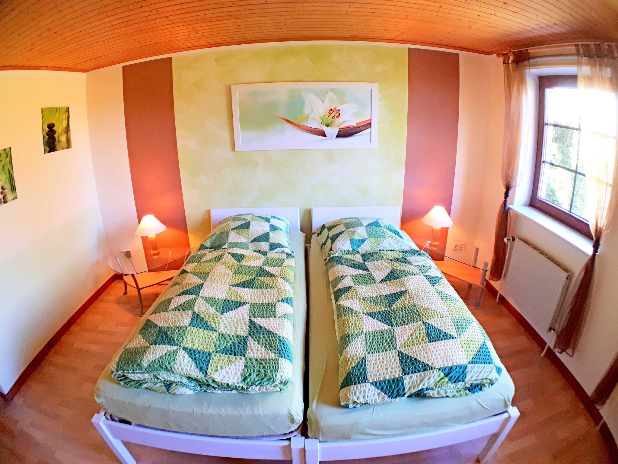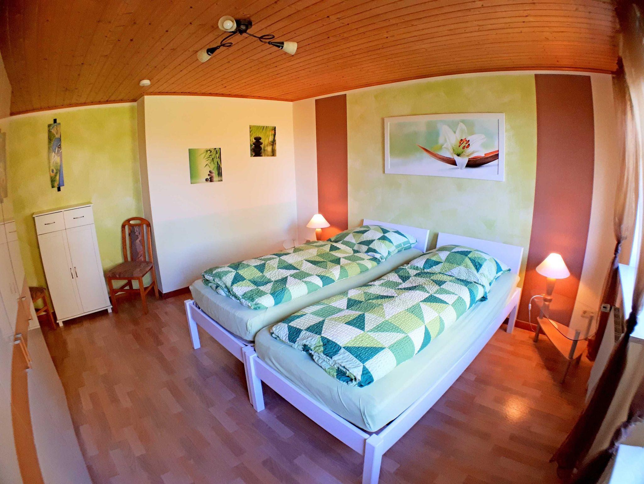 ¦Schlafzimmer mit Ehebetten, ein Bett ist mit einem hydraulischem Heberahmen ausgestattet, mit Aufrichtefunktion, Nachtschränke und Kleiderschrank, ein Kinderbett kann auf Wunsch aufgestellt werden. Es ist Platz für das Umsteigen vom Rollstuhl in das Bett.