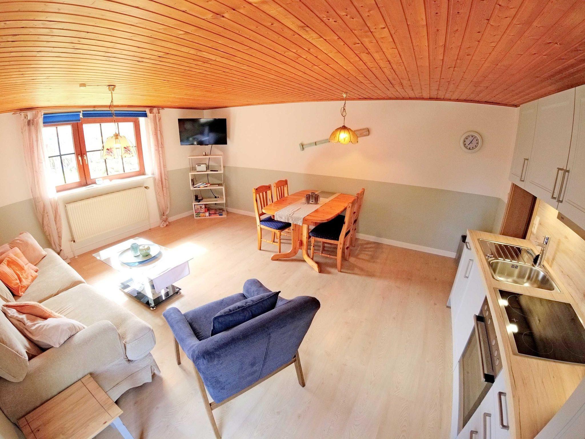 ¦Wohnküche mit Einbauküchenzeile, eine Sitzecke und ein Esszimmertisch mit vier Stühle, Radio und TV.