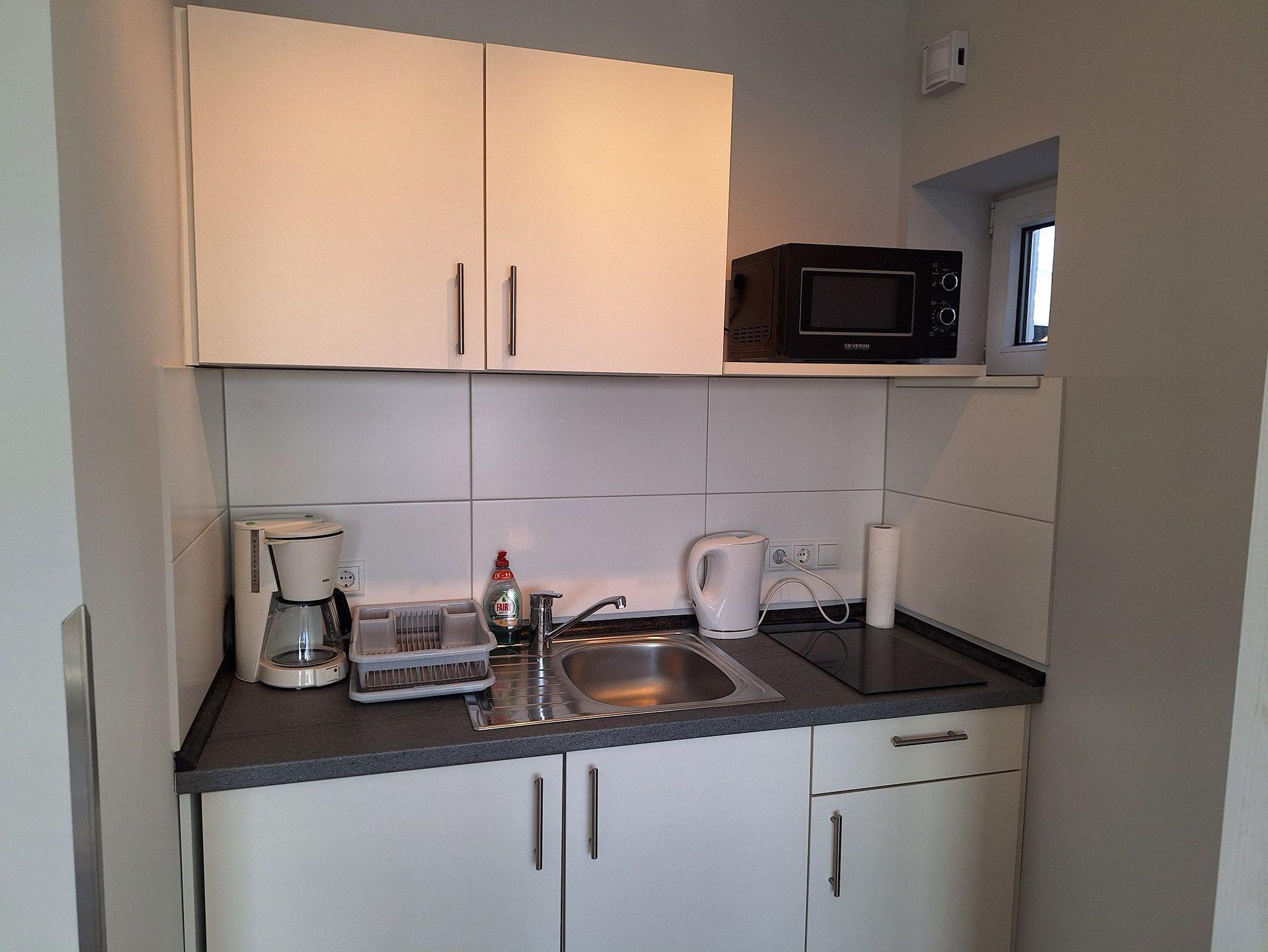 Das Appartement ist hell und mit viel Liebe zum Detail eingerichtet. Sie finden hier alles, was Ihnen Ihren Aufenthalt zu einem angenehmen Erlebnis macht. Die integrierte, neuwertige Pantry-Küche ist großzügig ausgestattet, u.a. mit Kaffeemaschine, Toaster und Mikrowelle.