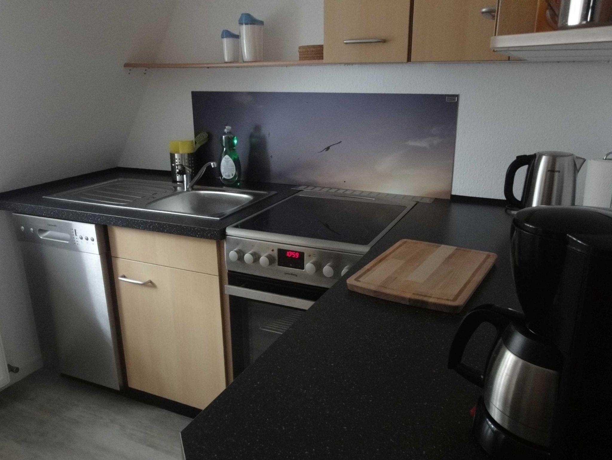 Die Küche ist mit E-Herd und Backofen, Mikrowelle, Kühlschrank, Gefrierfach, Spüle, Spülmaschine, Kaffeemaschine und Wasserkocher ausgestattet.