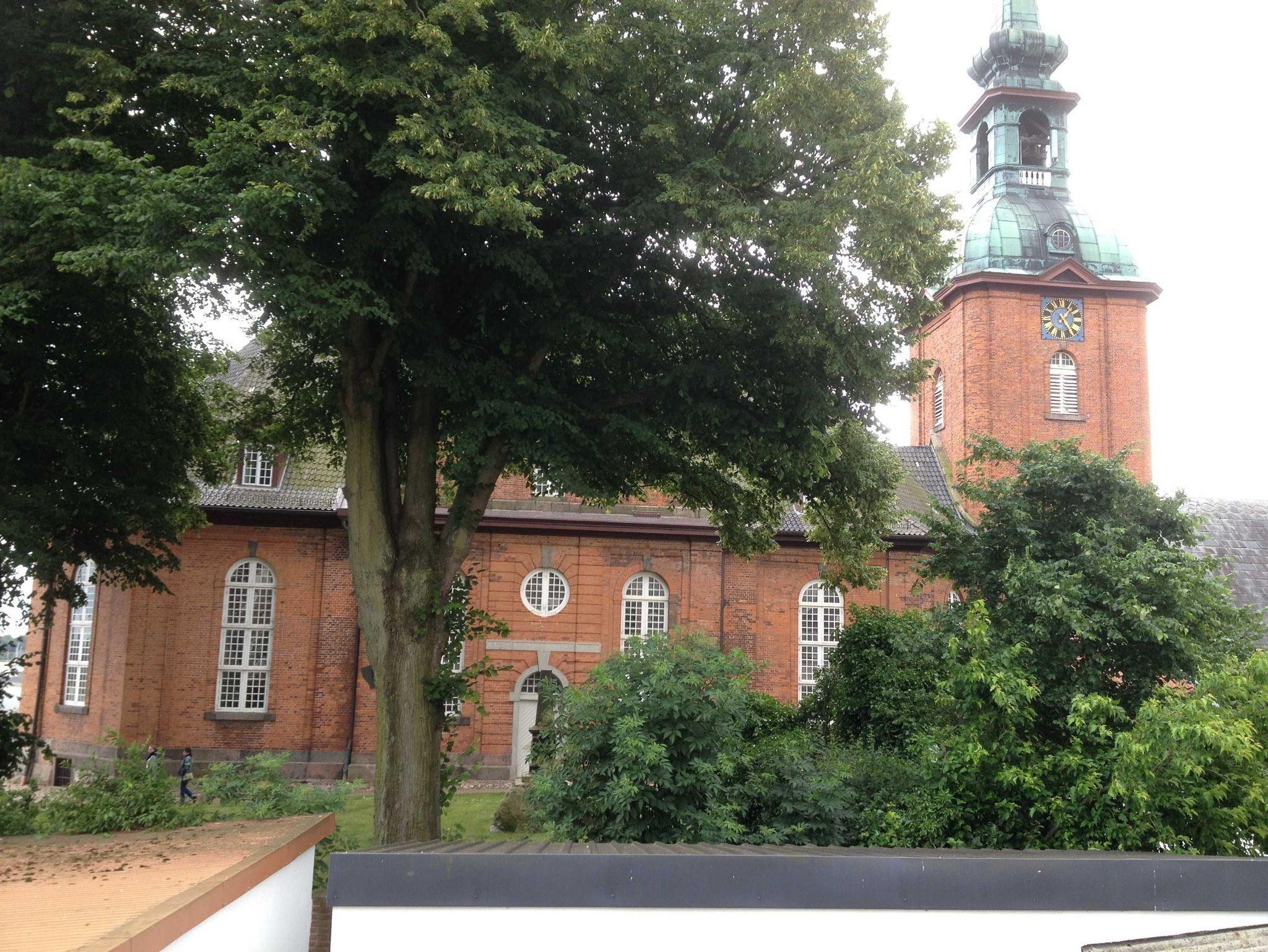 Der Balkon ist mit zwei Stühlen, Tisch, und Sonnenschirm ausgestattet mit einem wunderschönen Blick auf die Nicolai Kirche und auf die Schlei.
