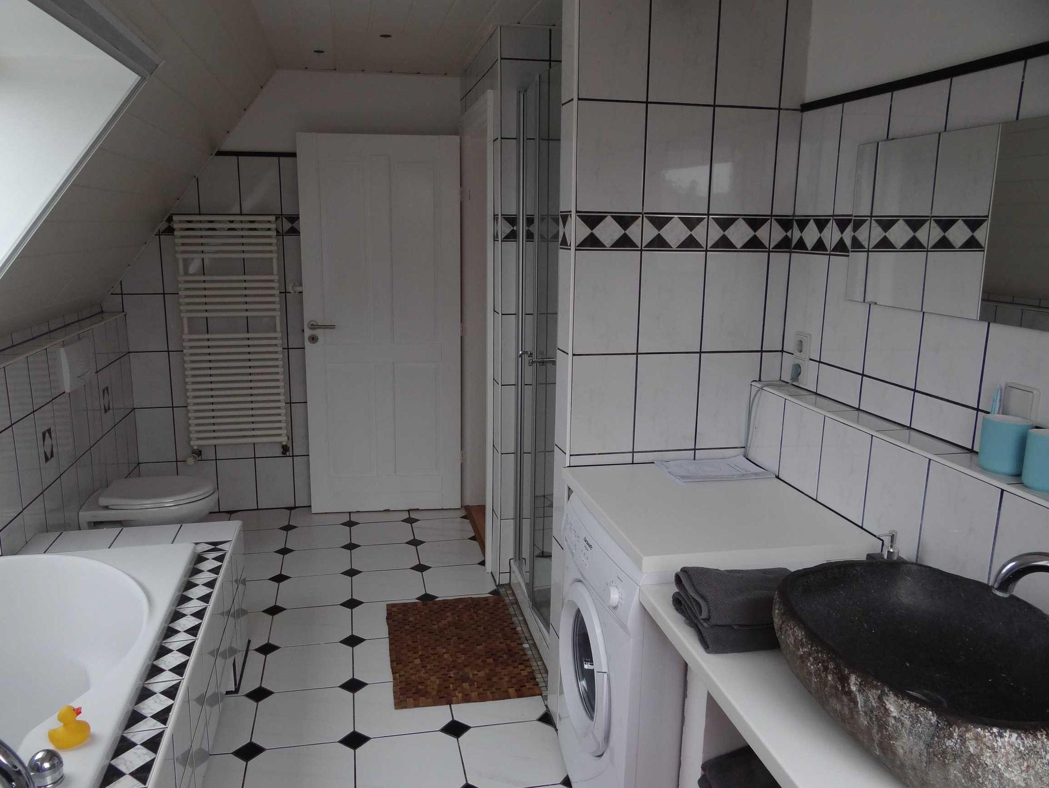 Das Bad ist groß und geräumig mit Duschkabine, Badewanne (gegen Aufpreis). Handtuchwärmer und Fußbodenheizung sorgen für noch mehr Wohlbefinden.. Hier befindet sich auch die Waschmaschine.
