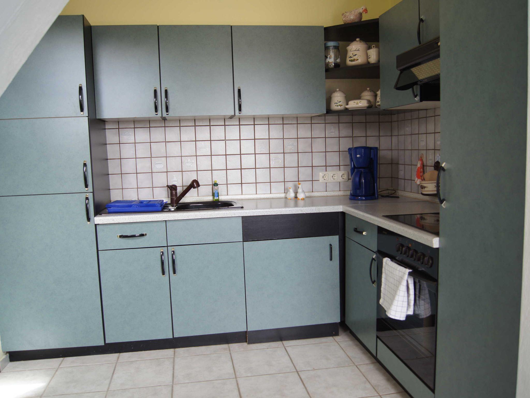 Kombinierter Wohn/Essbereich mit Sitzgruppe 3-2-1 und Flat-TV sowie Esstisch. Zum Essbereich geöffnete Küche. Küchenzeile mit Kühlschrank und Gefrierfach, Backofen, Cerankochfeld und Spülbecken. Ebenso sind vorhanden Kaffeemaschine, Wasser-und Eierkocher sowie Mikrowelle. Geschirrhandtücher sind bitte mitzubringen.