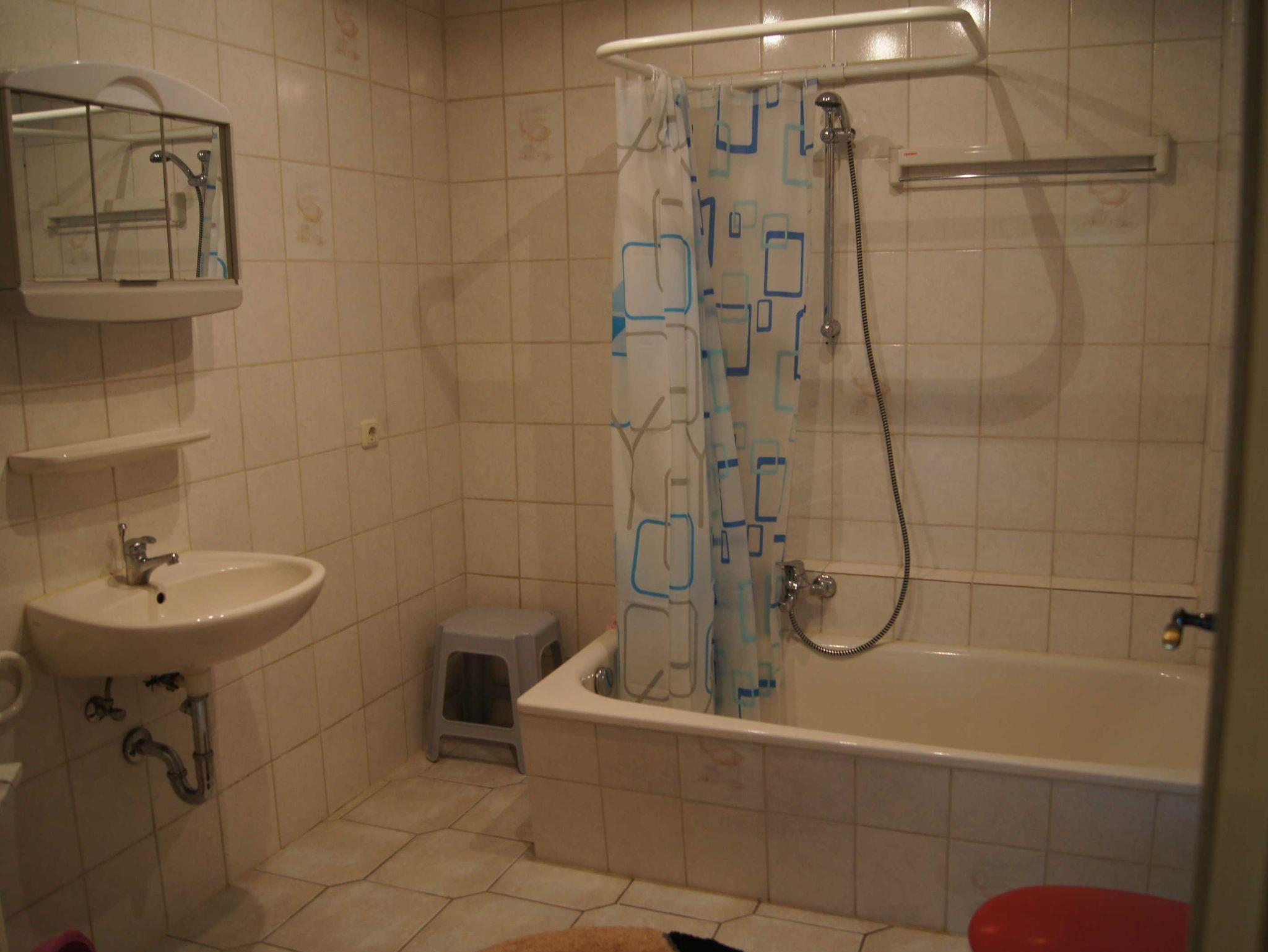 Im Badezimmer eine Badewanne mit Duschvorhang.