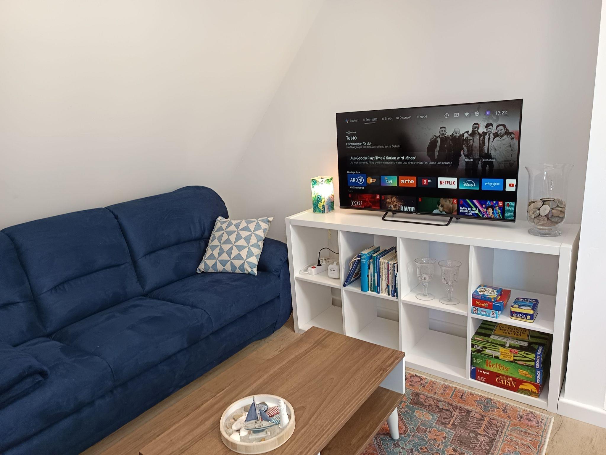 Der Wohn-, Ess- und Küchenbereich bilden einen lichtdurchfluteten, sich bis in den Giebel öffnenden Raum mit Ausblick auf den Garten. Von der Küche und der Empore aus können Sie einen kleinen Blick bis an die Schlei ergattern. Die Küche ist mit Ihrer Halbinsel und den Barhockern ein gemütlicher Treffpunkt um gemeinsam zu kochen oder einen Kaffee zu genießen. Der ausziehbare Esstisch bietet genügend Platz zum Essen oder für Spielabende. Auf zwei Sofas können Sie die Abende mit einem Smart-TV oder plaudernd bei einem Glas Wein ausklingen lassen.