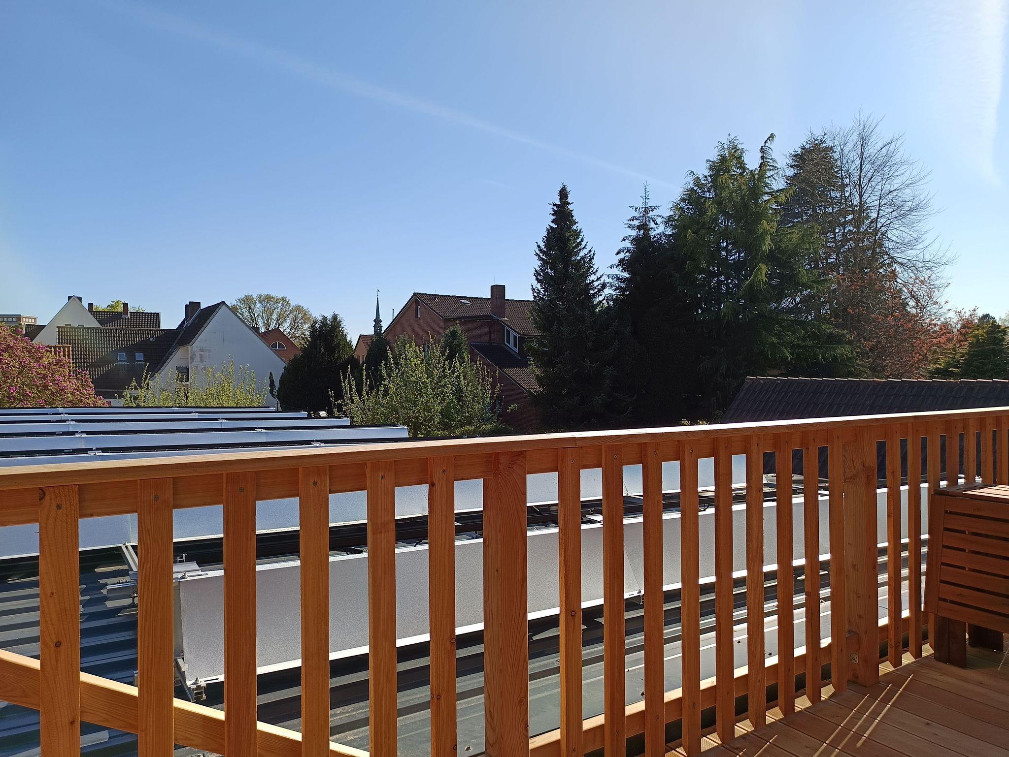 Der Holzbalkon mit Tisch und Stühlen, einer Süd-Westlage mit Blick auf den Garten mit altem Baumbestand und die beiden Kirchen, lädt bei trockenem Wetter den ganzen Tag zum Verweilen ein.