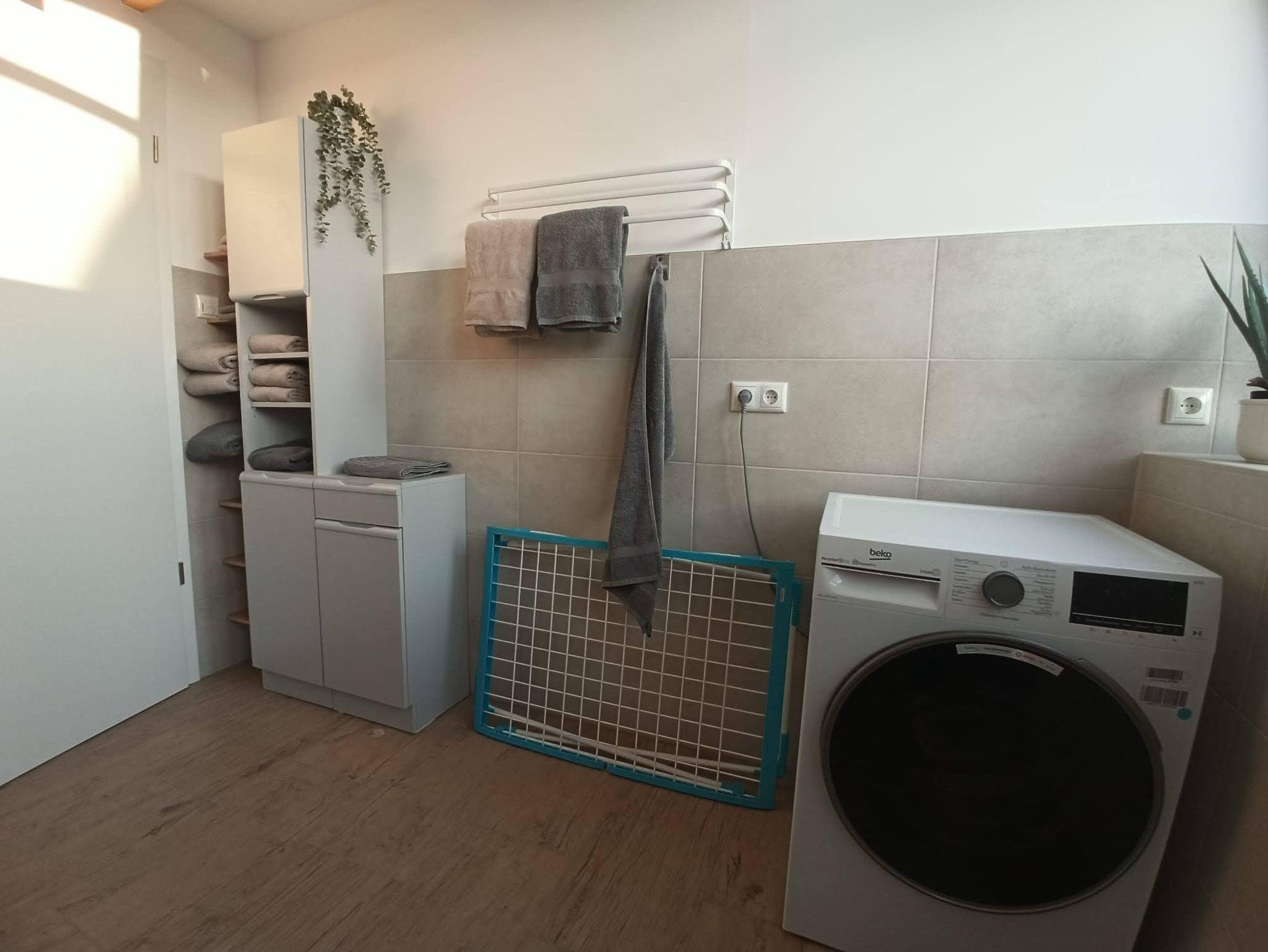 Das großzügige Duschbad - ca 9m² - ist ausgestattet mit einer Waschmaschine, Sichtschutzplissees, Trockenständer und Stauraum für Kulturtaschen, Handtücher etc.
