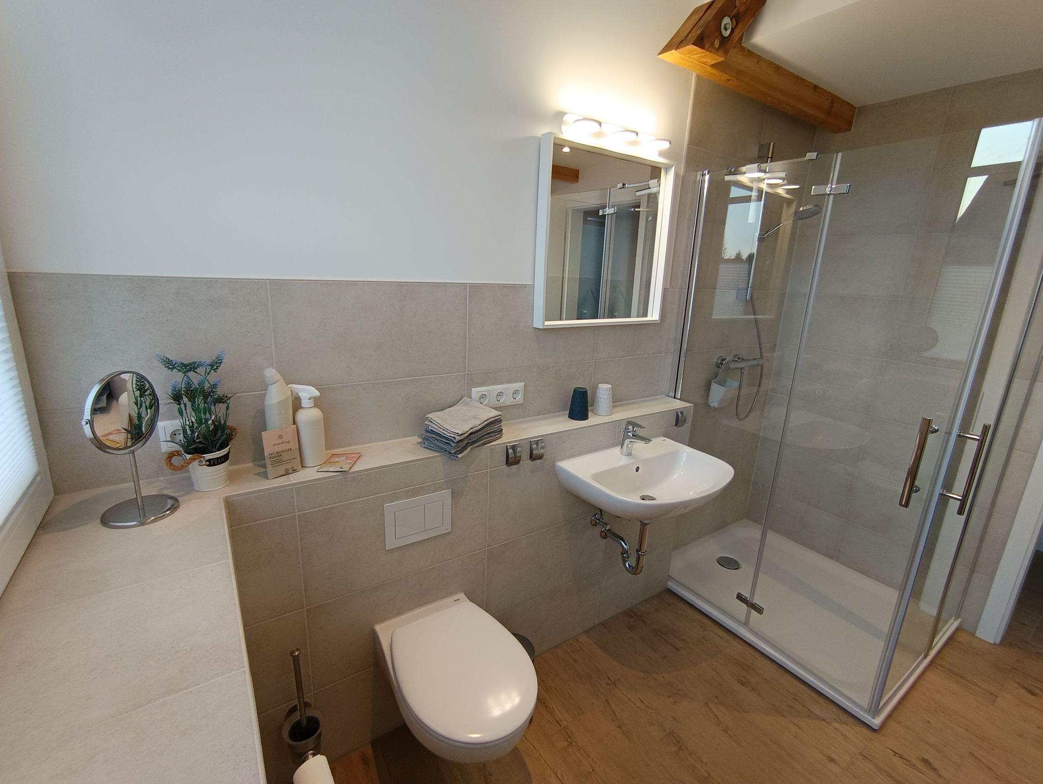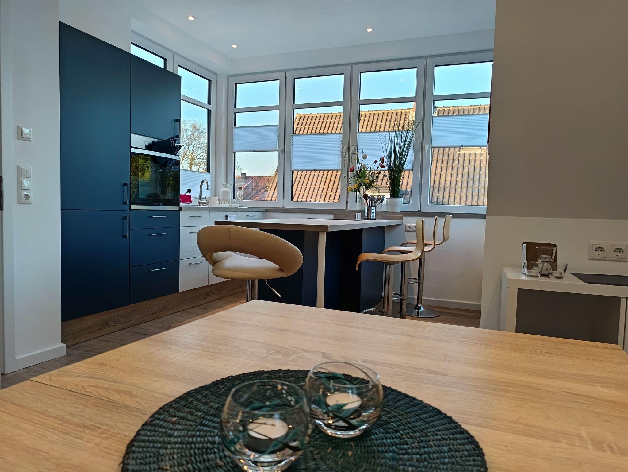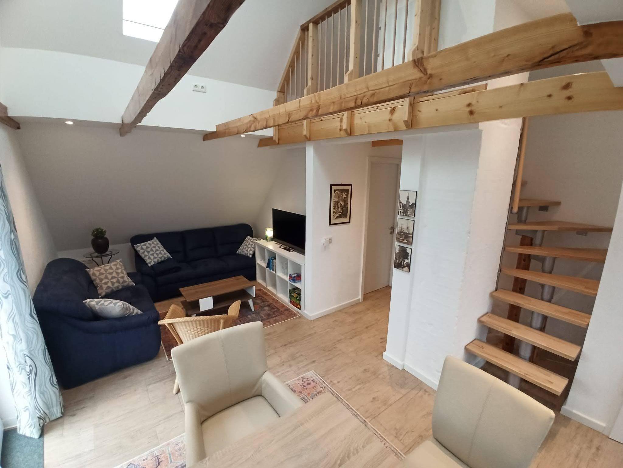 Diese neu entstandene, modern eingerichtete Ferienwohnung ist auf der unteren Ebene mit Fußbodenheizung und Fliesen ausgestattet und auf der Empore mit Holzdielen belegt.
