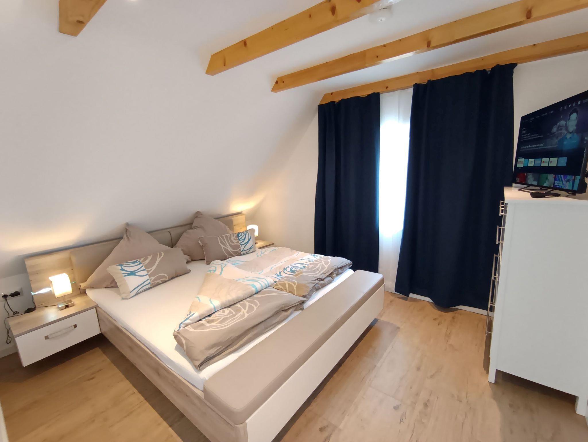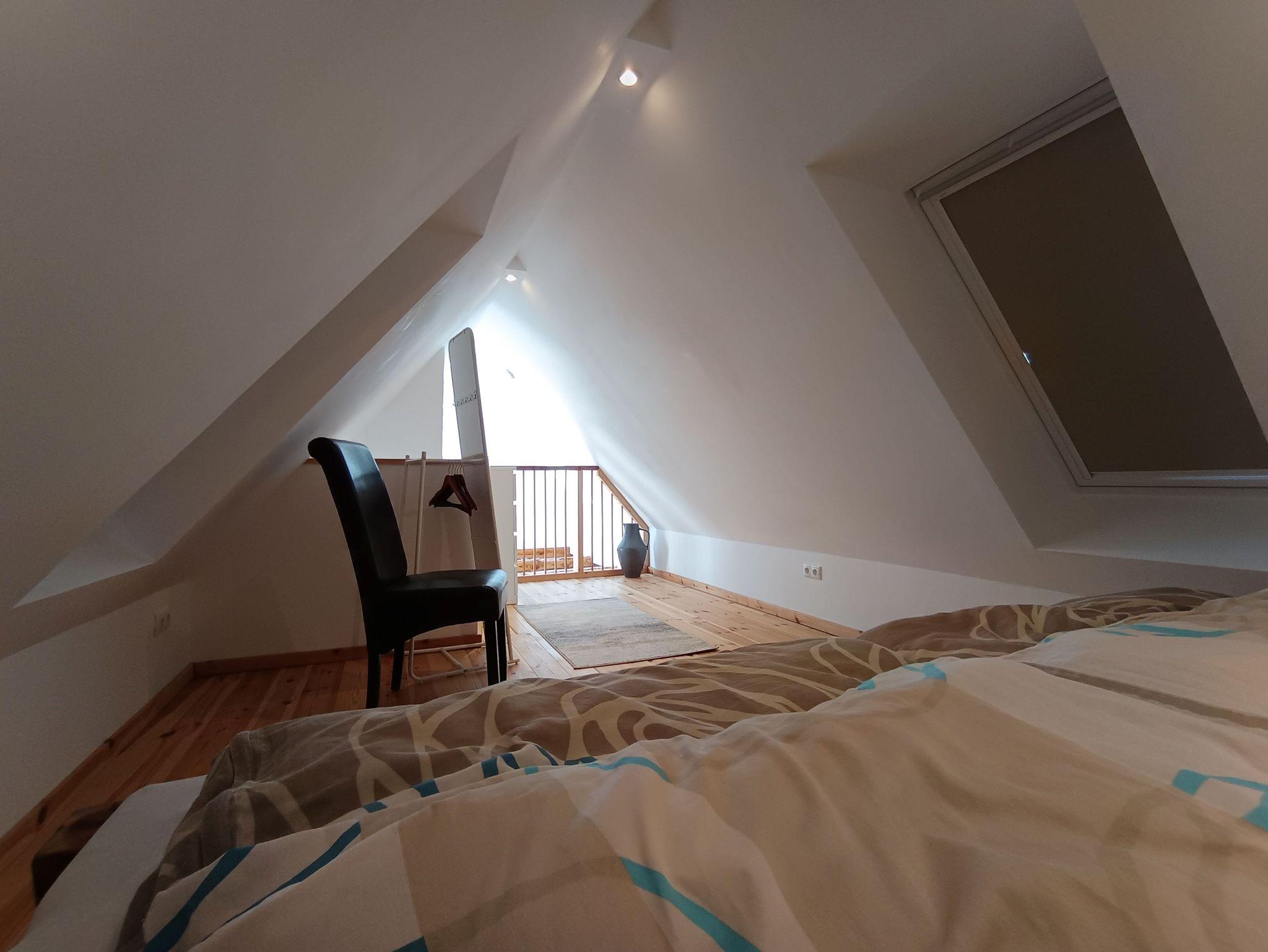 Die Schlafzimmer befinden sich zum einen auf der Empore mit einem großen 200x200cm Bett, Nachttischen, Kommode, Spiegel mit kleiner Kleiderstange erreichbar über eine Treppe vom Essbereich ausgehend - und in den nach Norden gerichteten Räumen mit einem 180x200cm Bett und verlängertem Bettkasten ideal bei Gästen über 190cm, großer Kommode mit Smart-TV, Verdunklungsvorhängen und einen direkten Durchgang zum Zimmer mit Jugend-Einzelbett (90x200cm), Schreibtisch, Verdunklungsvorhang und 170x200cm Kleiderschrank.