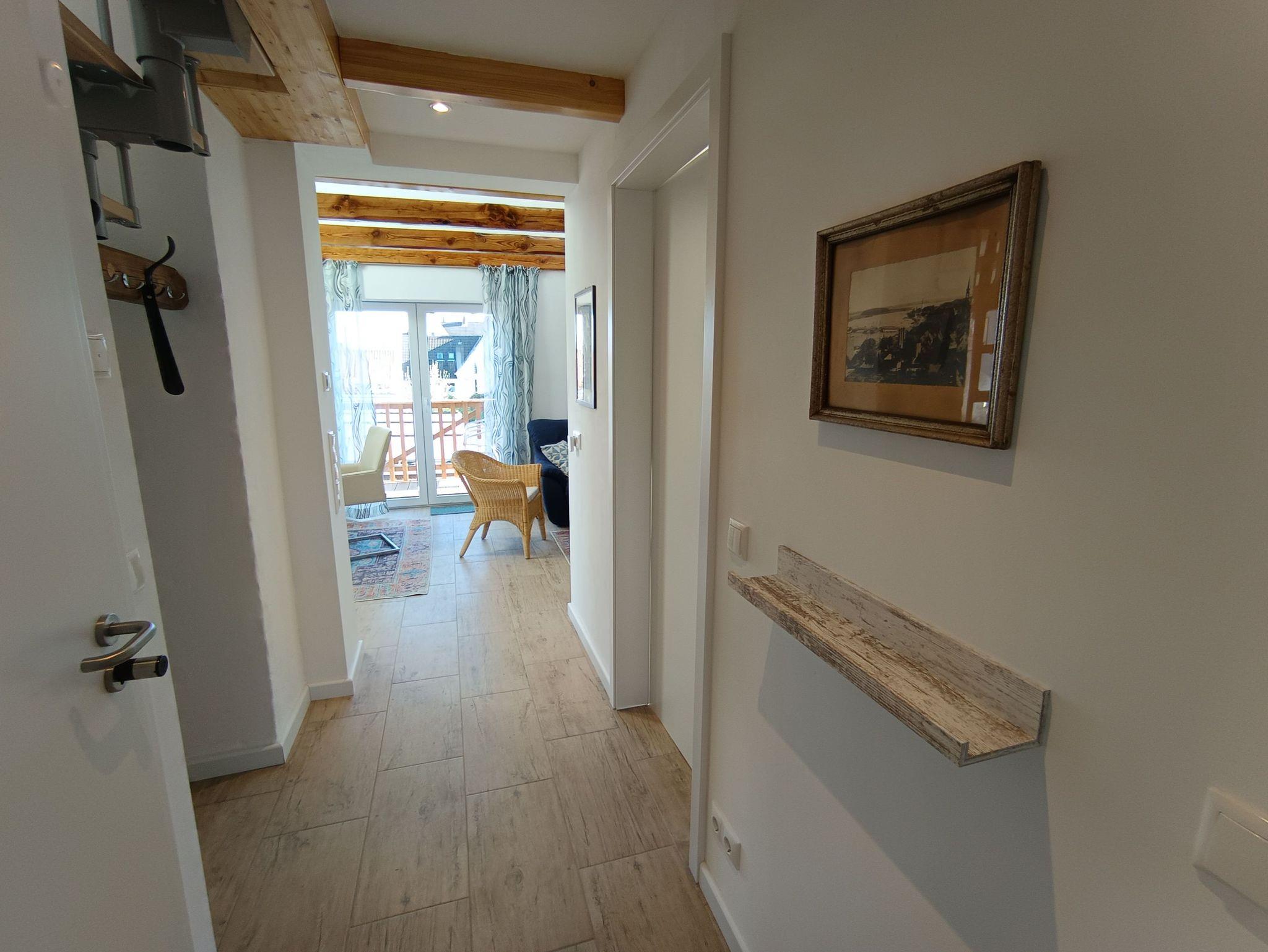 Unsere Ferienwohnung - bi Hugo, im ausgebautem Dachgeschoss - liegt in einer ruhigen Seitenstraße ca. 400 m von Kappelns Hafen entfernt. Sie bietet Ihnen mit einem offenen Wohnkonzept Platz für 4 Personen auf zwei Ebenen. Vor dem Haus befindet sich, der Parkplatz für die Ferienwohnung bi Hugo. Durch die Haustür und ein Treppenhaus, mit der original erhalten viertel gewendeten Treppe, erreichen Sie die Wohnung im neu ausgebauten Dachgeschoss. Vor der Wohnungstür finden Sie Platz für Schuhe und Garderobe. Dieser Treppenabsatz wird lediglich von unseren Gästen benutzt.