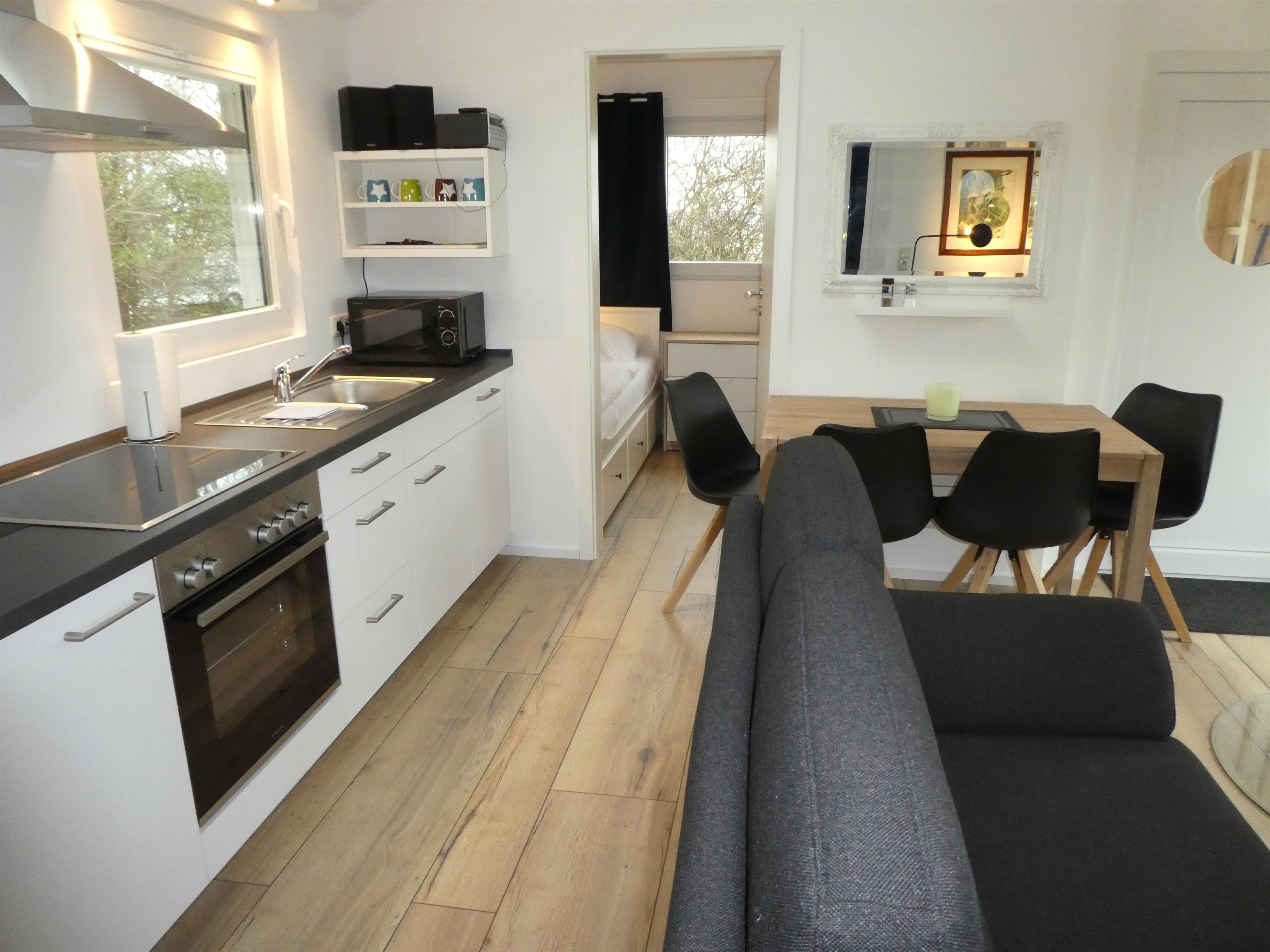 Ein offener Vorraum stellt den Eingangsbereich des Ferienhauses dar .Hier können Schuhe, Jacken und Mäntel..... abgelegt werden. Er führt in einen Wohnbereich, ausgestattet mit einer modernen Küchenzeile (Geschirrspüler, Backofen, Kühlschrank,...) einer gemütlichen Sitzecke(Sofa und 2 kl. Sessel) und einem Tisch mit 4 Stühlen, der zum gemeinsamen Essen und Spielen einlädt , ein Flachbildfernseher und eine kleine Musikanlage runden das Bild ab.