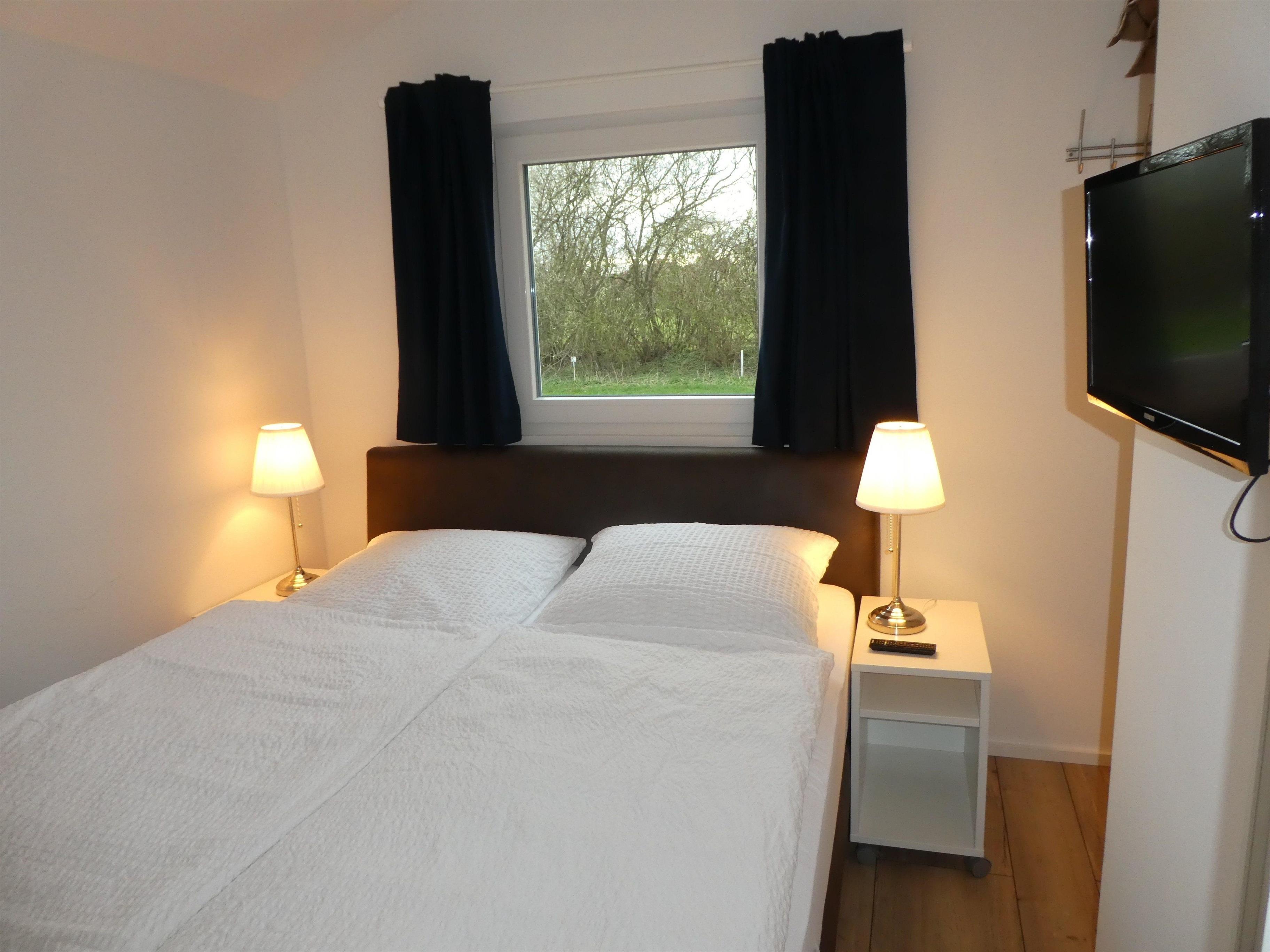 - 1 Schlafzimmer mit 1,80 m breitem Boxspringbett, Schrank, Nachtschränken und Flachbildfernseher