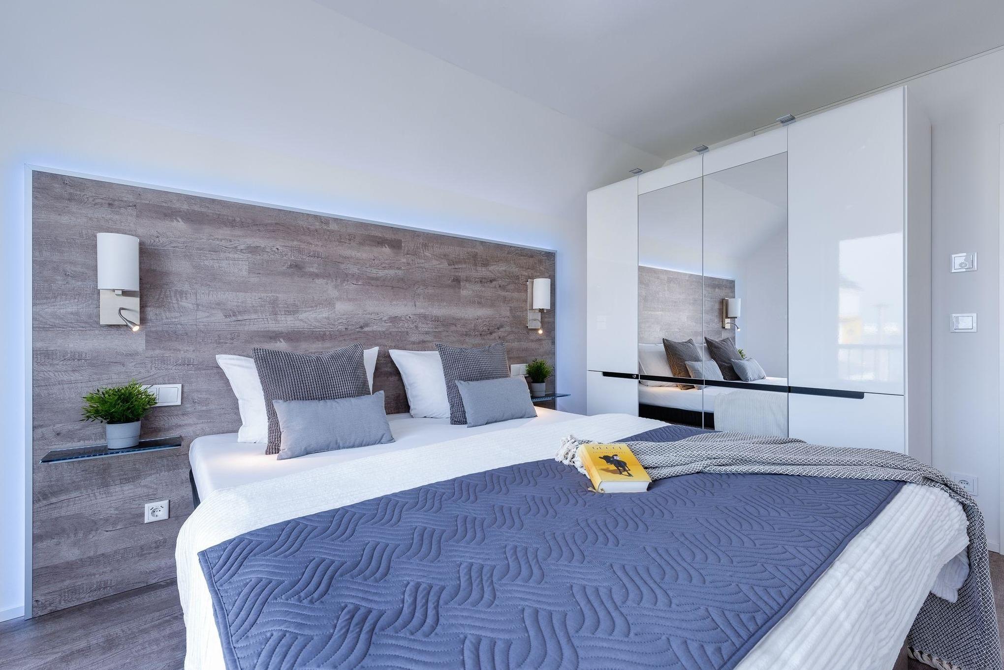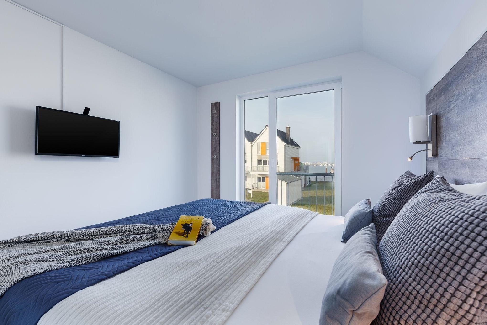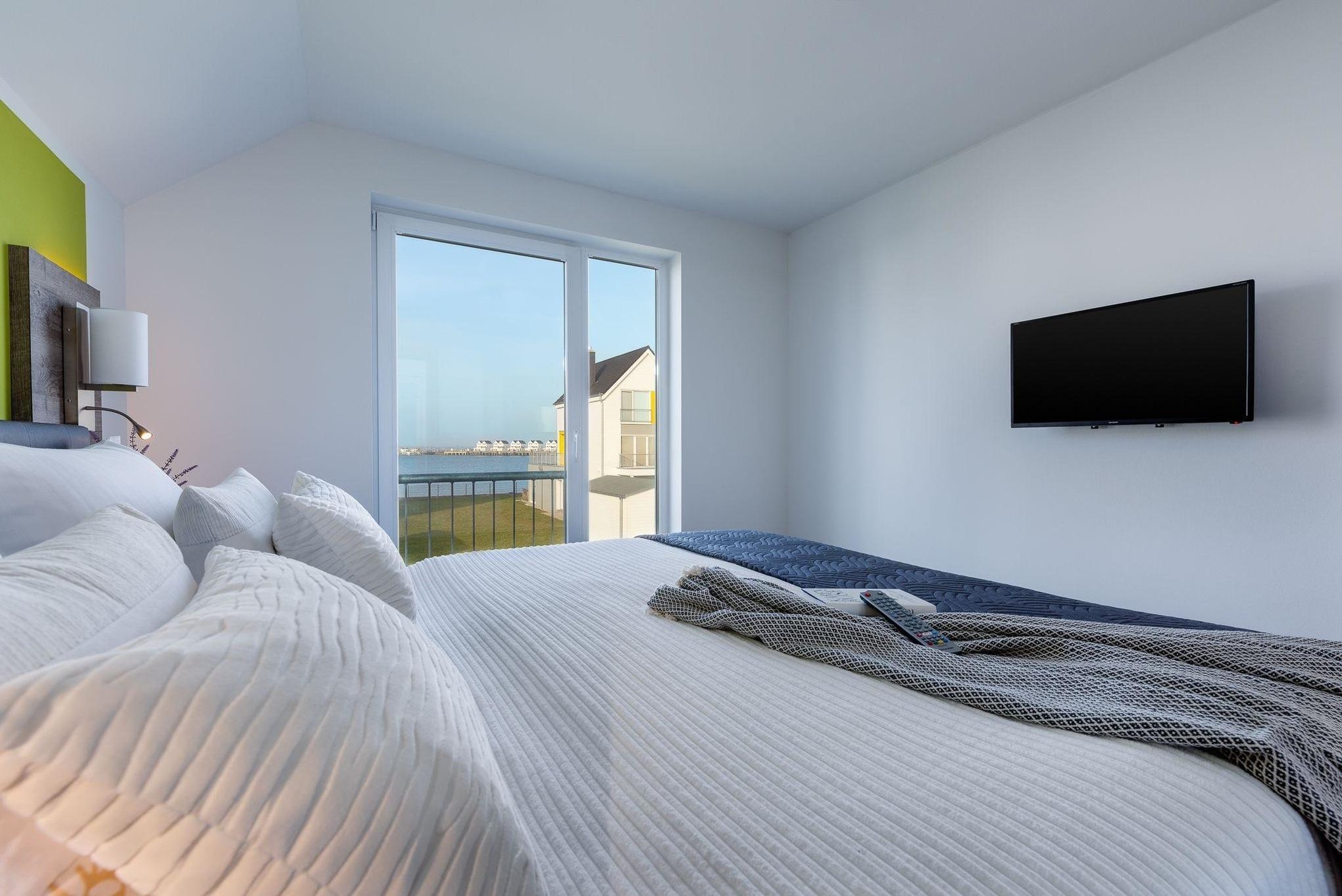 Wasserbett, hochmodern eingerichtet, XXL- Wellnessdusche, E-Ladesäule, Infrarotsauna, Blick auf Hafenbecken und Ostsee.