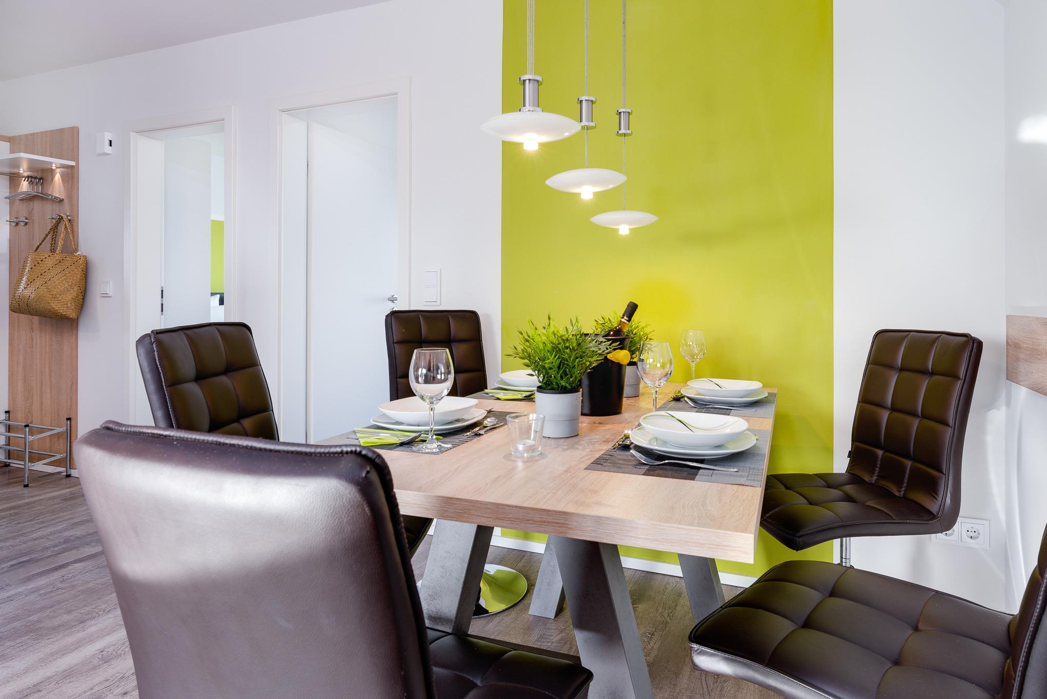 Im Fokus steht aber der perfekt umgesetzte lichtdurchflutete Wohn- und Essbereich mit Holz befeuertem Kaminofen, bodentiefen Fenstern, durch die sich der Wohnbereich mit der Natur verbindet. Die Integration der offenen Küche mit hervorragender Ausstattung und funktionalem Design, steht dem gemütlichen Beisammensein auch beim zubereiten von allerlei Köstlichkeiten nichts im Wege. Der runde Kaminofen zwischen Wohnzimmer und Essbereich verleiht dem Raum eine besondere Atmosphäre. Dem faszinierenden Flammenspiel kann man durch das große Panoramaglas sowohl vom Sofa als auch vom Essbereich zuschauen. Vor allem in den kalten Wintertagen verbreitet der Ofen ein kuscheliges Wohlfühlambiente mit angenehmer Wärme. Den großzügigen zweiten Balkon (Südbalkon14m²) betritt man über den Wohnbereich, hier können es sich unsere Gäste auf einer bequemem Bestuhlung gemütlich machen und die Sonne so zu jeder Tageszeit genießen oder sich etwas leckeres auf dem Elektrogrill zubereiten.