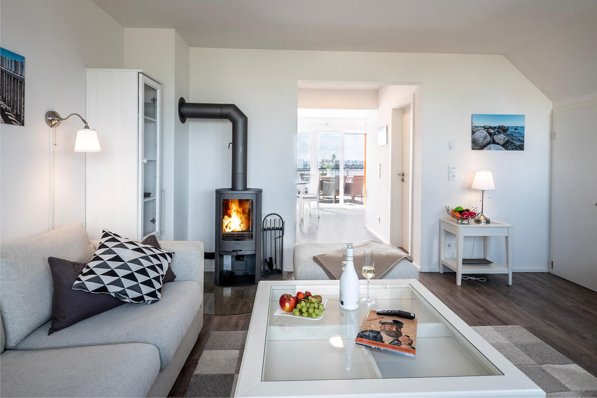 Im Fokus steht aber der perfekt umgesetzte lichtdurchflutete Wohn- und Essbereich mit Holz befeuertem Kaminofen, bodentiefen Panoramafenstern, welcher loftartig gestaltet ist, sodass alle Räume fließend ineinander übergehen und sich der Wohnbereich mit der Natur verbindet. Die Integration der offenen Küche mit hervorragender Ausstattung und funktionalem Design, steht dem gemütlichen Beisammensein auch beim Zubereiten von allerlei Köstlichkeiten nichts im Wege. Die Wasserkulisse vor dem Essbereich mit 180 Grad Panoramablick auf den gesamten Hafen und die Ostsee ist hierbei zum Greifen nah – das ist Ostseeflair. Den zweiten Nordbalkon (ca. 8m²) betritt man über den Wohnbereich, hier können es sich unsere Gäste auf einer zusätzlichen Bestuhlung gemütlich machen und bei einem Sundowner mit Abendsonne den Tag ausklingen lassen.