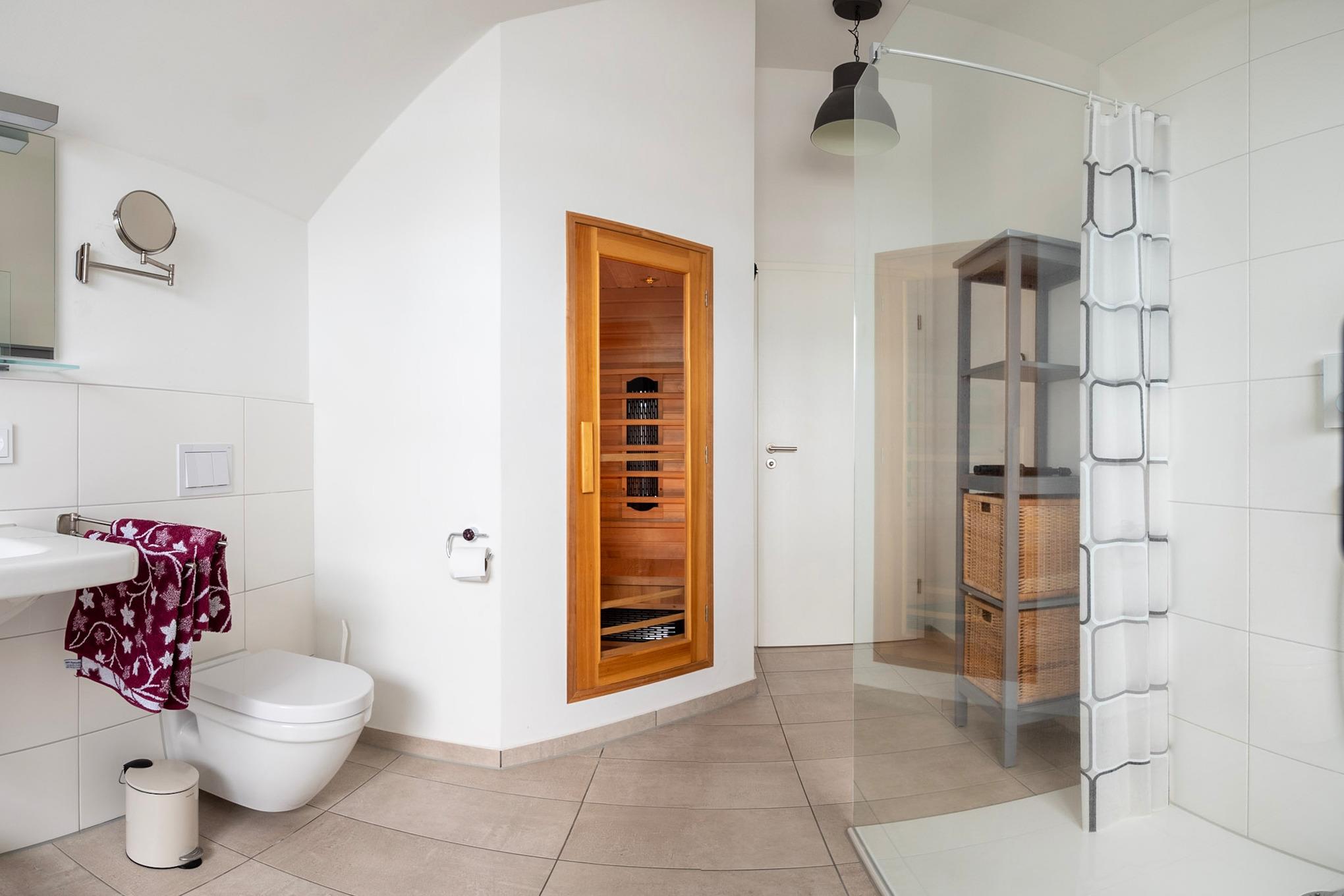 Die gesamte Ferienwohnung lässt sich über die Fußbodenheizung einfach temperieren und bietet dank des Kaminofens und der Sauna das ganze Jahr über eine angenehme Wärme und eine gemütlich-wohlige Atmosphäre. Für Unterhaltung sorgen im Wohnbereich ein 55 Zoll Smart TV mit Bluetooth und Samsung Soundbar, eine Playstation, Blu-ray-Player, ein separates Internet Radio sowie eine Spielesammlung.