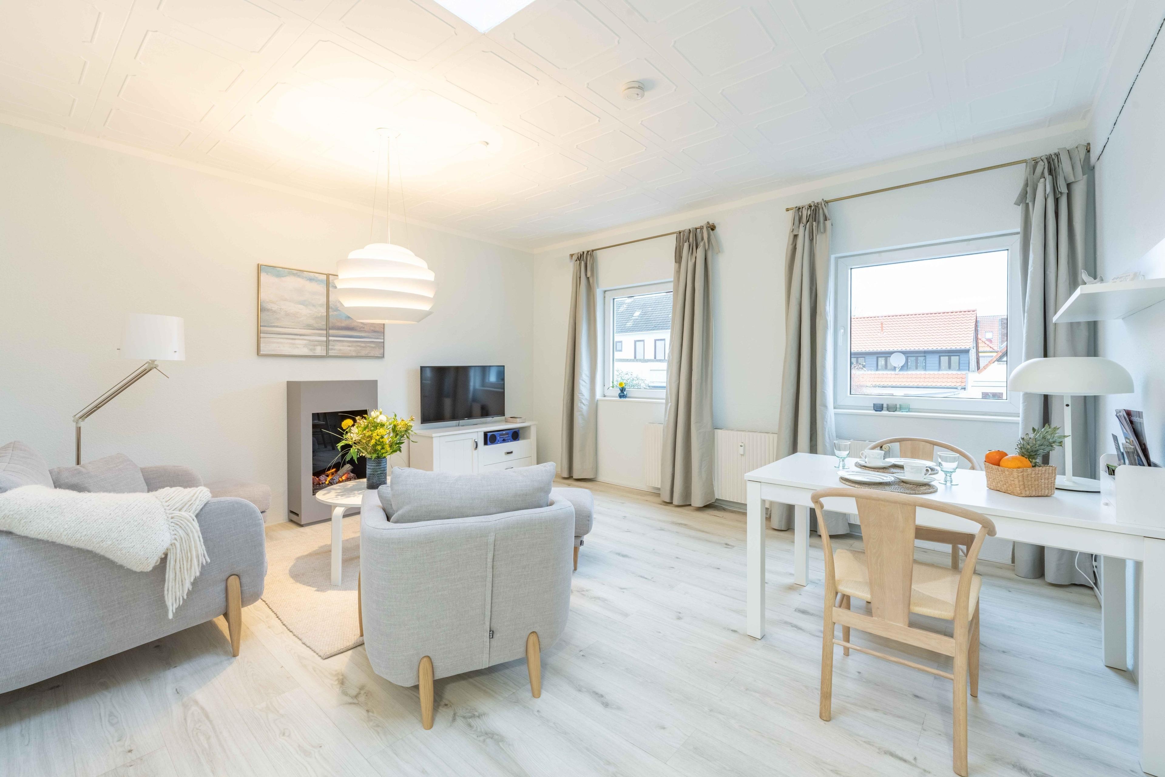 Sehr schöne helle charmante Wohnung mit 76 Quadratmetern. Breiter, eigener Wohnungsaufgang vom Innenhof zu betreten, helles Wohnzimmer mit offener Küche (Herd mit Ceranfeld und Backofen, Kühl-Gefrier-Kombination, Geschirrspülmaschine, Wasserkocher, Toaster, Kaffeemaschine) und 2 Fenstern zur sehr ruhigen Straße "Schanze", Wohnzimmer mit Essbereich, Sitzecke mit hochwertigem Lovechair und einem bequemen Sessel und Fußhockern, HD TV und Beistelltischen sowie einem Kamin für gemütliches Ausspannen. WLAN. Badezimmer mit bodentiefer Dusche, WC sowie Waschbecken mit hinterleuchtetem Spiegel und genügend Platz zum Ablegen von Kosmetika und anderen Utensilien. Großzügiger Flur mit Spiegel und Konsole sowie ein geräumiges Schlafzimmer mit hochwertigem Boxspringbett von 1,80 mal 2,00 Metern sowie einem 3-teiligen Kleiderschrankschrank und einem Standspiegel. Die 2 Fenster sind zum Innenhof gerichtet, sodass der Blick vom Bett aus geradewegs in den norddeutschen Himmel fällt. Sichere, abschließbare Unterstellmöglichkeiten für Fahrräder ist vorhanden.