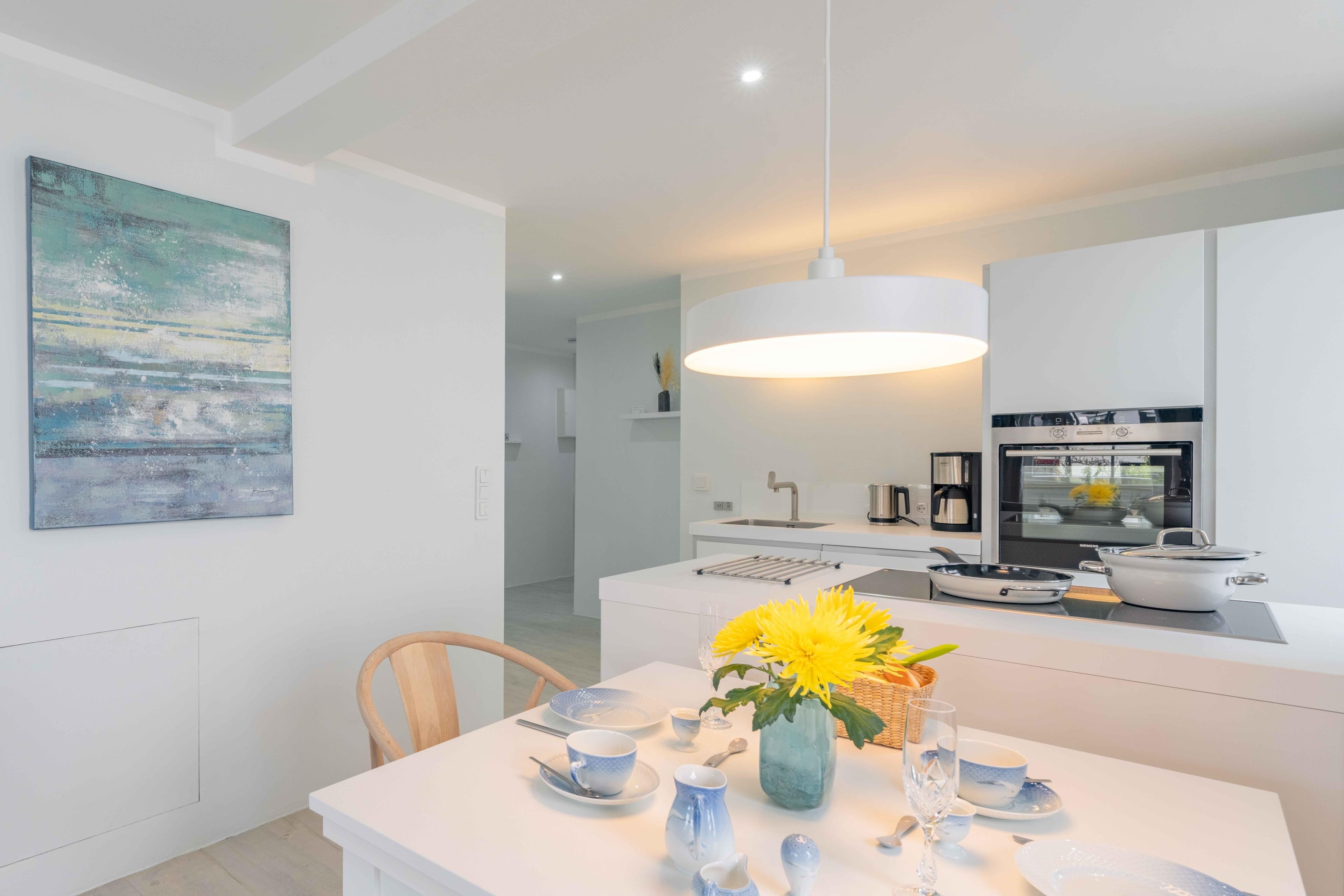 Die Küche der Luxusmarke Bulthaup besteht aus einer Küchenzeile, in der sich Spüle, Geschirrspülmaschine sowie der Kühlschrank mit Fresh-Funktion und der Multifunktionsofen befinden. Die Insel bietet ein Induktionsfeld und über Soft-Close-Schubladen jede Menge Stauraum. Sämtliche Geräte sind von hochwertigen Markenherstellern wie Miele, Siemens oder NEFF. Kaffeemaschine, Wasserkocher plus Toaster machen die Küche komplett.
