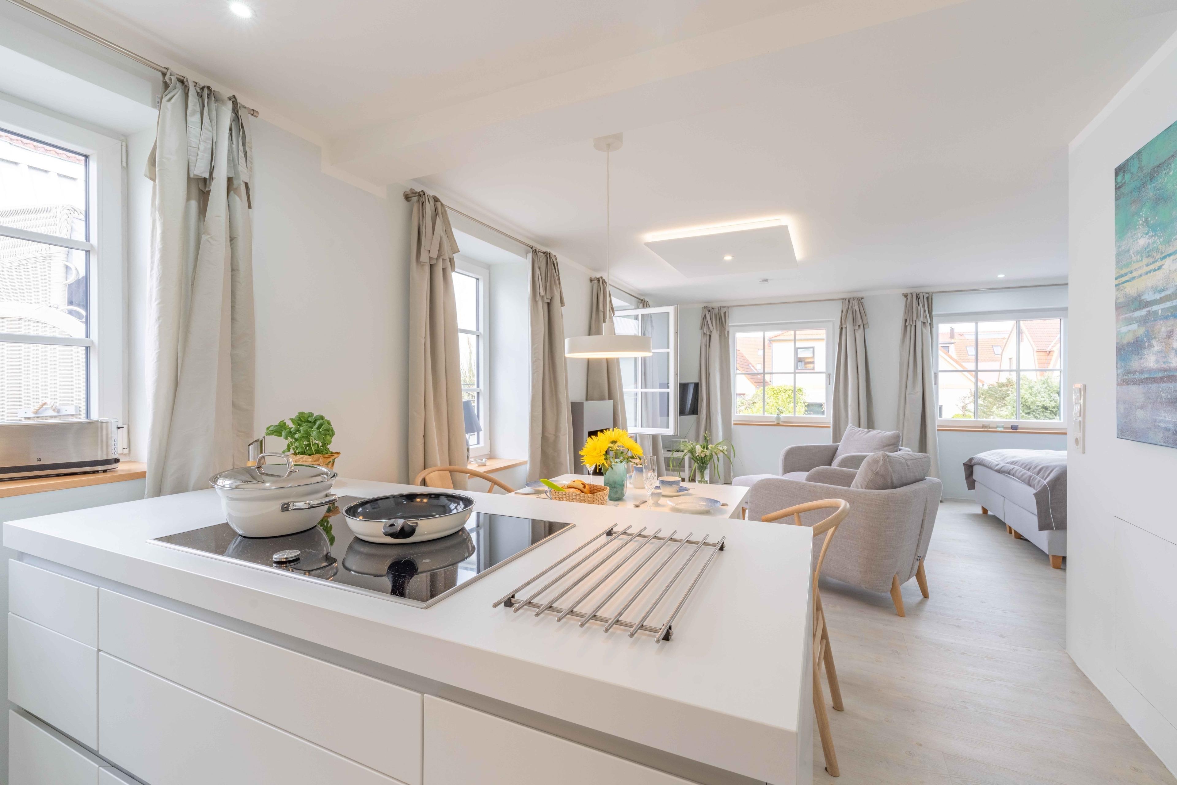 Die Dachterrasse ist über die angefertigte Terrassentür des Wohnbereiches zu erreichen und bietet mit Strandkorb plus weiteren Outdoor-Möbeln ein perfekt geschütztes, nicht einsehbares Wellnesserlebnis – ideal zum Entspannen in der Schlei-Ostsee-Region. Das Loft besteht aus einem großzügigen offenen Wohn-Küchen-Schlafbereich sowie einem modernen Bad.