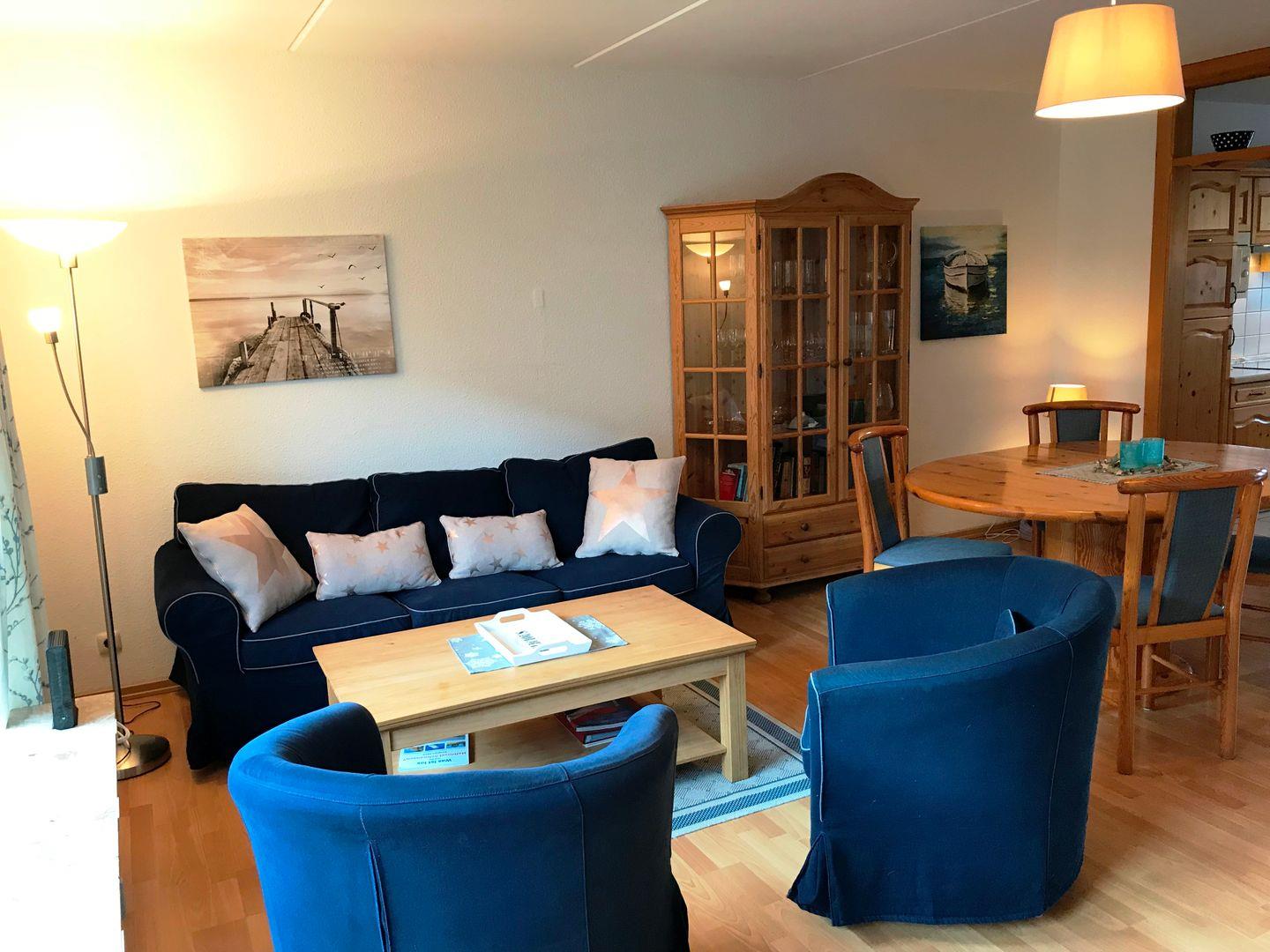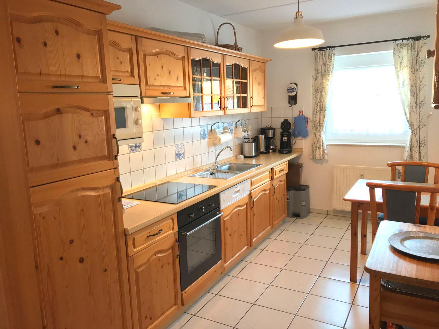 Der große Wohn- und Essbereich verfügt über eine gemütliche Sofaecke mit TV und einen großen Esstisch. Hier können Sie Ihre Urlaubsabende entspannt ausklingen lassen. Die Küche ist komplett ausgestattet und verfügt über alle Annehmlichkeiten, die Sie im Urlaub benötigen (z.B. Geschirrspüler). Es gibt 3 Schlafzimmer: Zwei haben ein großes Doppelbett (2x 90x200cm), eines ein etwas kleineres Doppelbett (2x 70x200cm). Ein WC im Erdgeschoss, sowie ein großes Badezimmer mit Dusche, Badewanne und Waschmaschine im 1. Stock runden dieses schöne Ferienhaus ab.