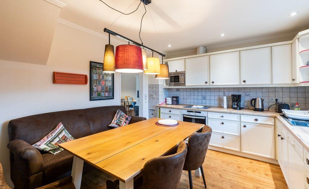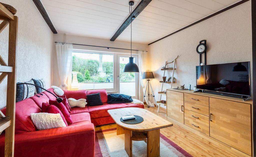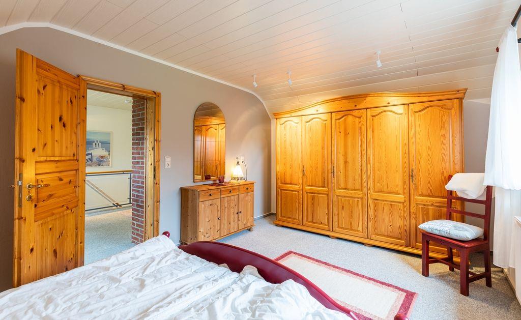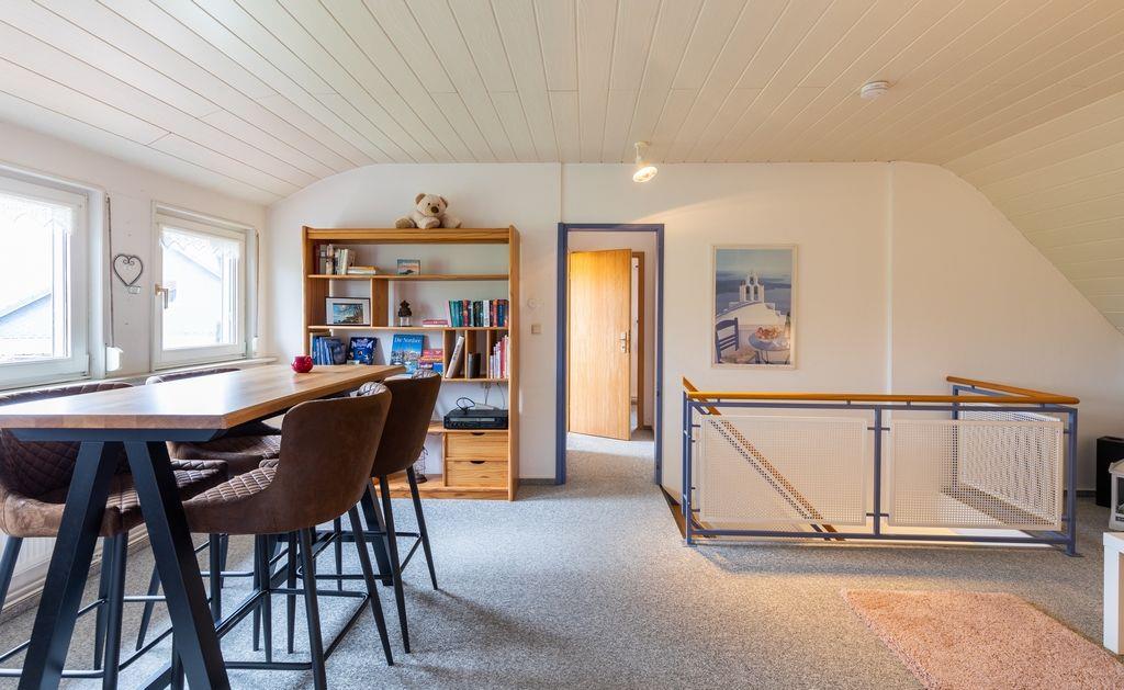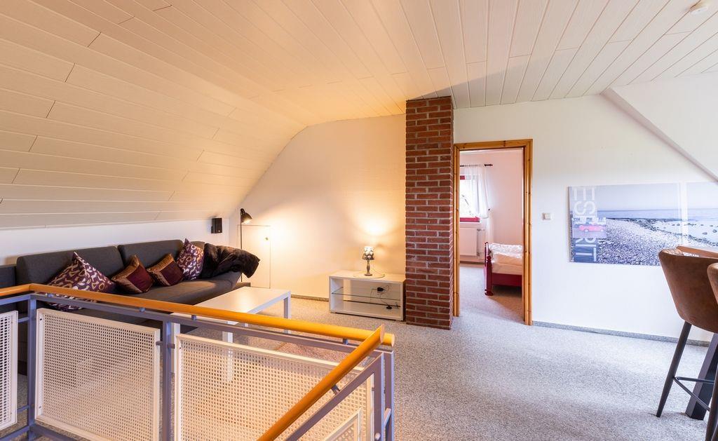Im Obergeschoss des Hauses gelangen Sie durch einen offen gestalteten Raum, in welchem das Schlafsofa für eine mögliche 5te Person steht, u.a. in die eigentlichen Schlafräume: