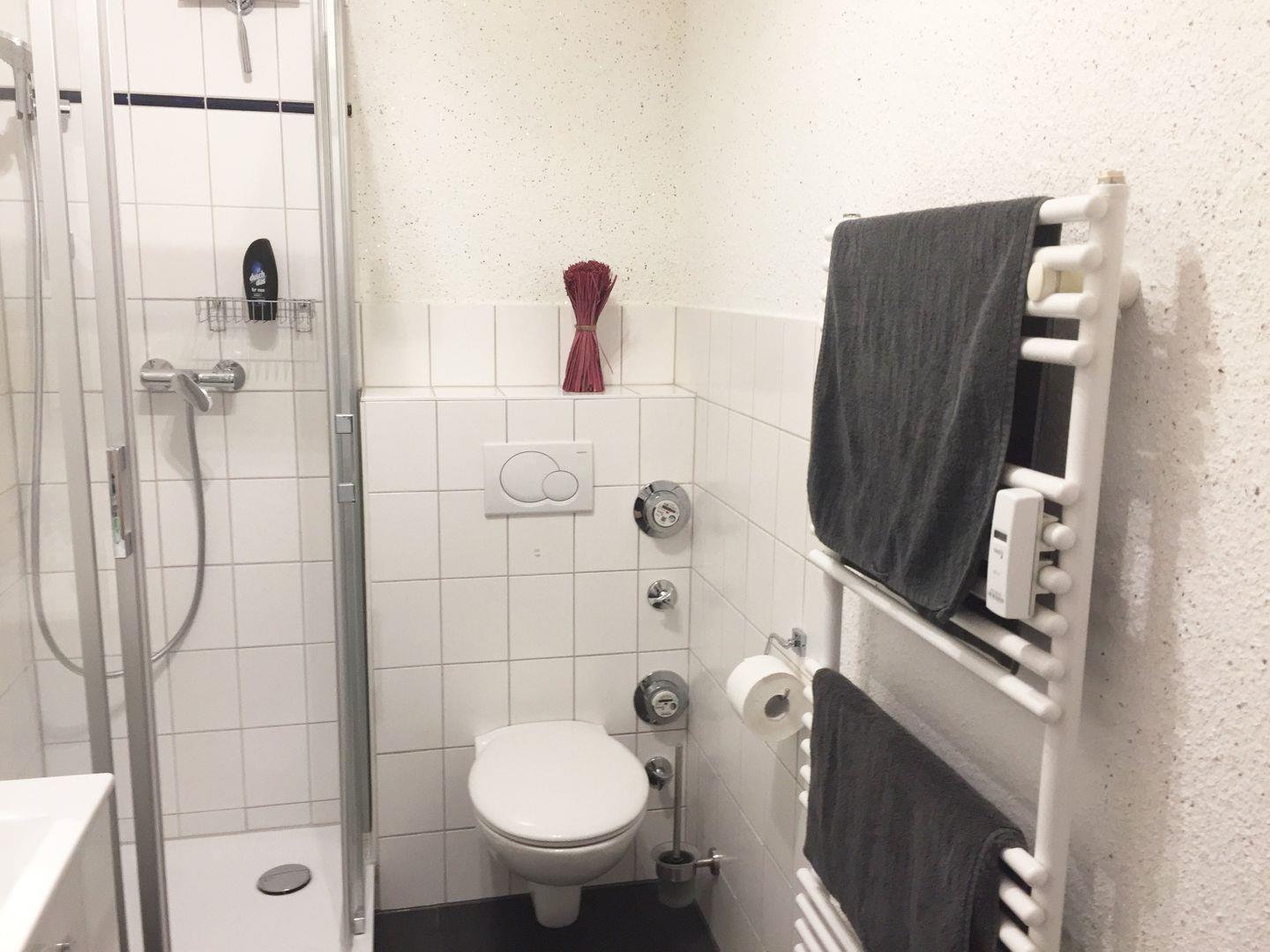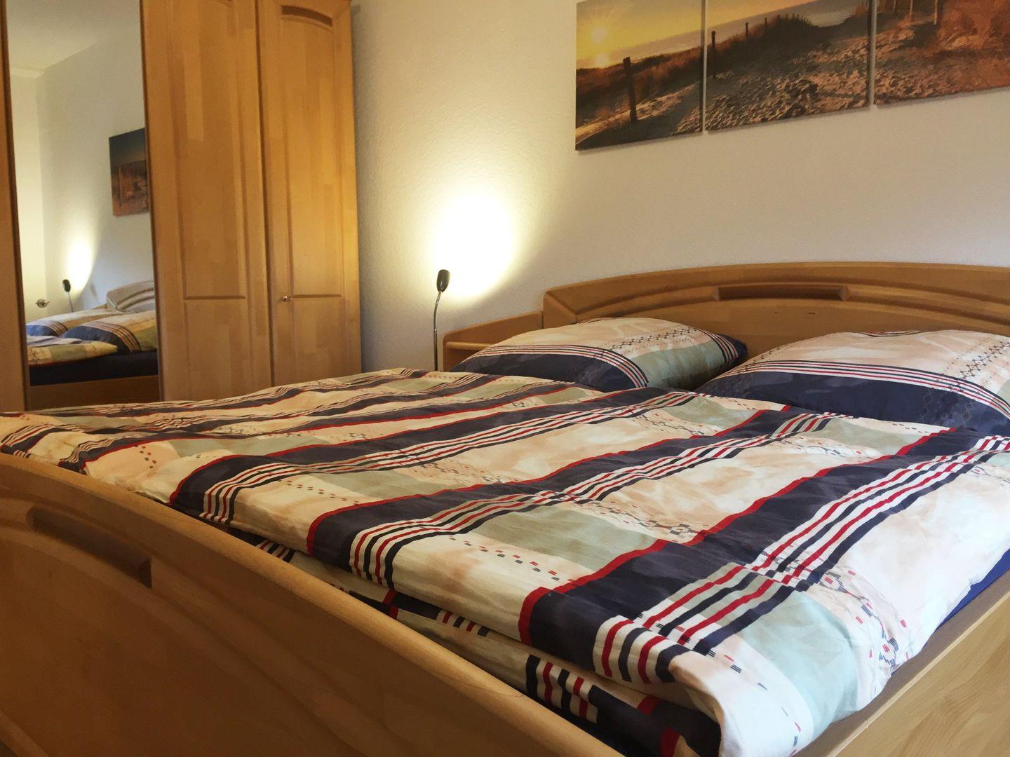 Das Schlafzimmer ist mit Doppelbett (180x200 cm), das Badezimmer mit Dusche, Handtuchtrockner, Waschmaschine und Trockner ausgestattet.