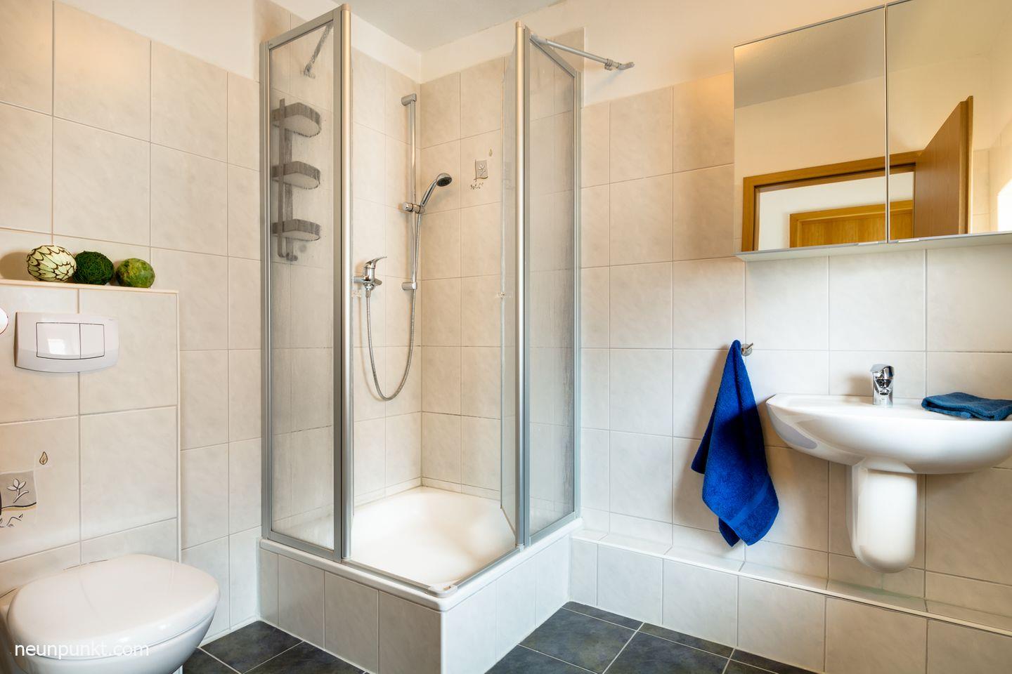 Der Wohnbereich verfügt über ein gemütliches Sofa, einen Esstisch und eine gut eingerichtete, offene Küche. Das Schlafzimmer ist mit einem Doppelbett und einem Kleiderschrank ausgestattet. Ein Badezimmer mit einer Dusche rundet die schöne Ferienwohnung ab.