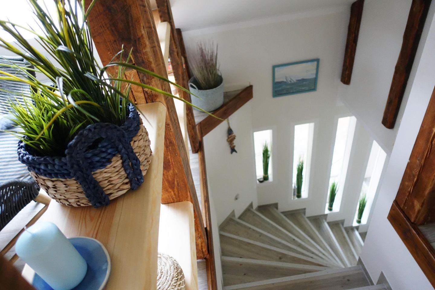 Über eine Treppe kommen Sie in die modern und gemütlich eingerichtete Ferienwohnung.