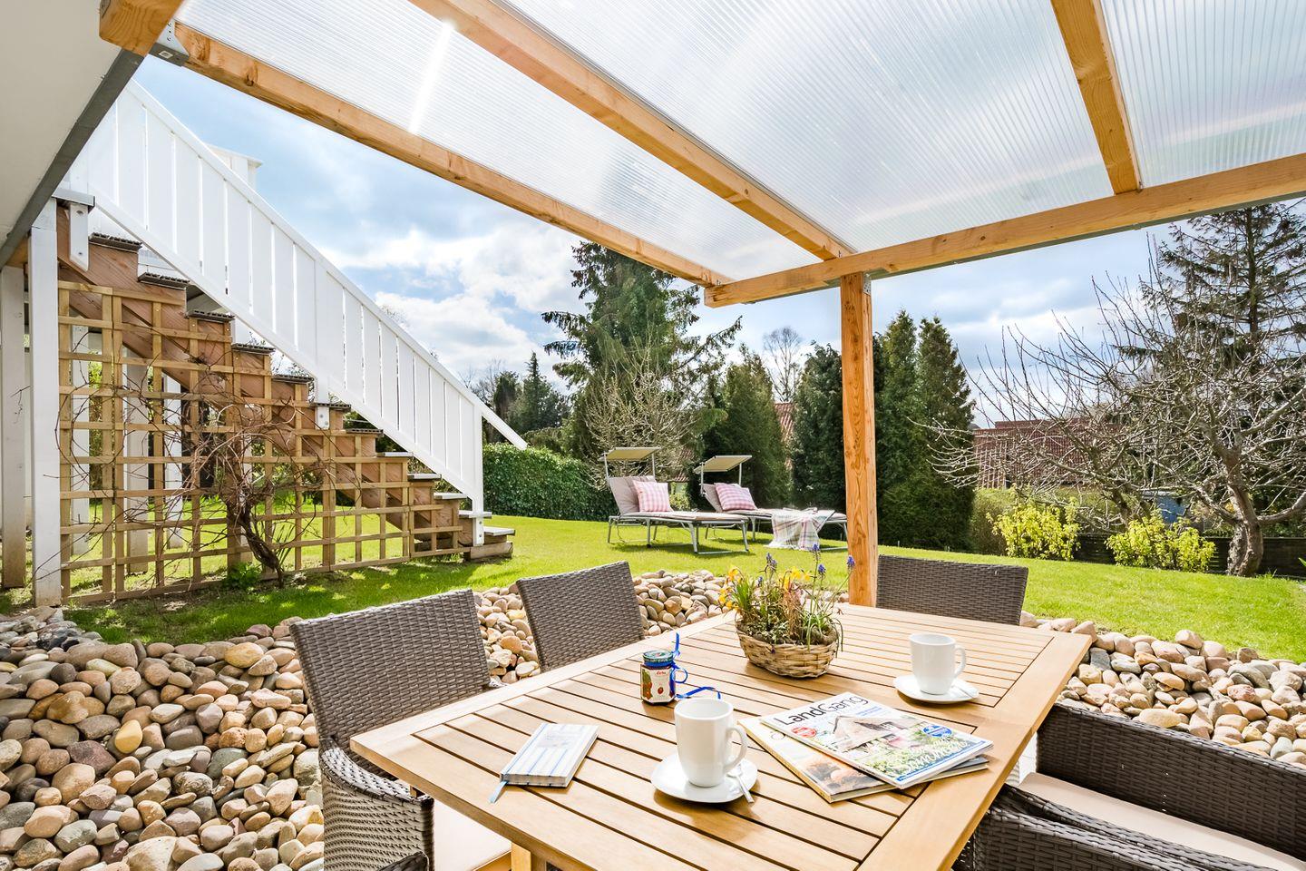 Im Außenbereich finden Sie eine überdachte Terrasse mit Gartenmöbel & Grill und ein schöner Garten zum Spielen.
