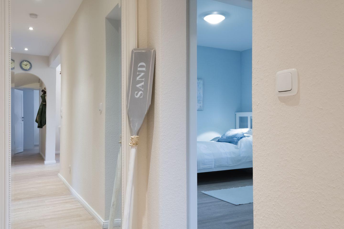 Die Ferienwohnung befindet sich im Souterrain mit separatem Eingang und teilt sich auf in ein gemütliches Wohn-/ Esszimmer mit offener Küche (Ceranfeld, Geschirrspüler) und Terrassenzugang, ein Schlafzimmer mit einem Doppelbett (2x 90x200cm) inklusive TV, ein Schlafzimmer mit 2 Einzelbetten (jeweils 90x200 cm), ein Schlafzimmer mit Etagenbett (jeweils 90x200 cm), ein modernes Duschbad und ein zusätzliches Gäste-WC.