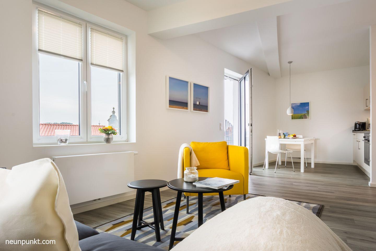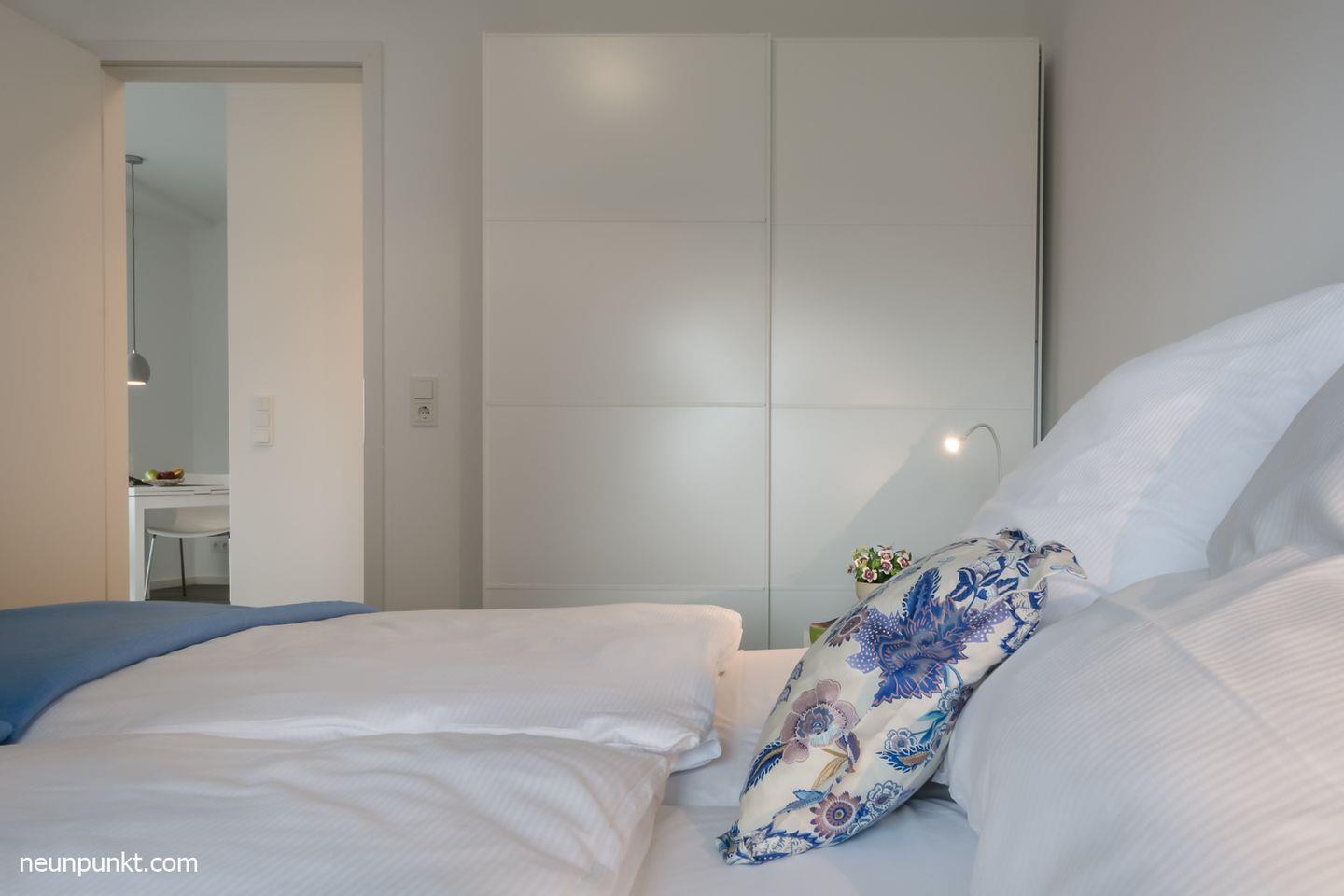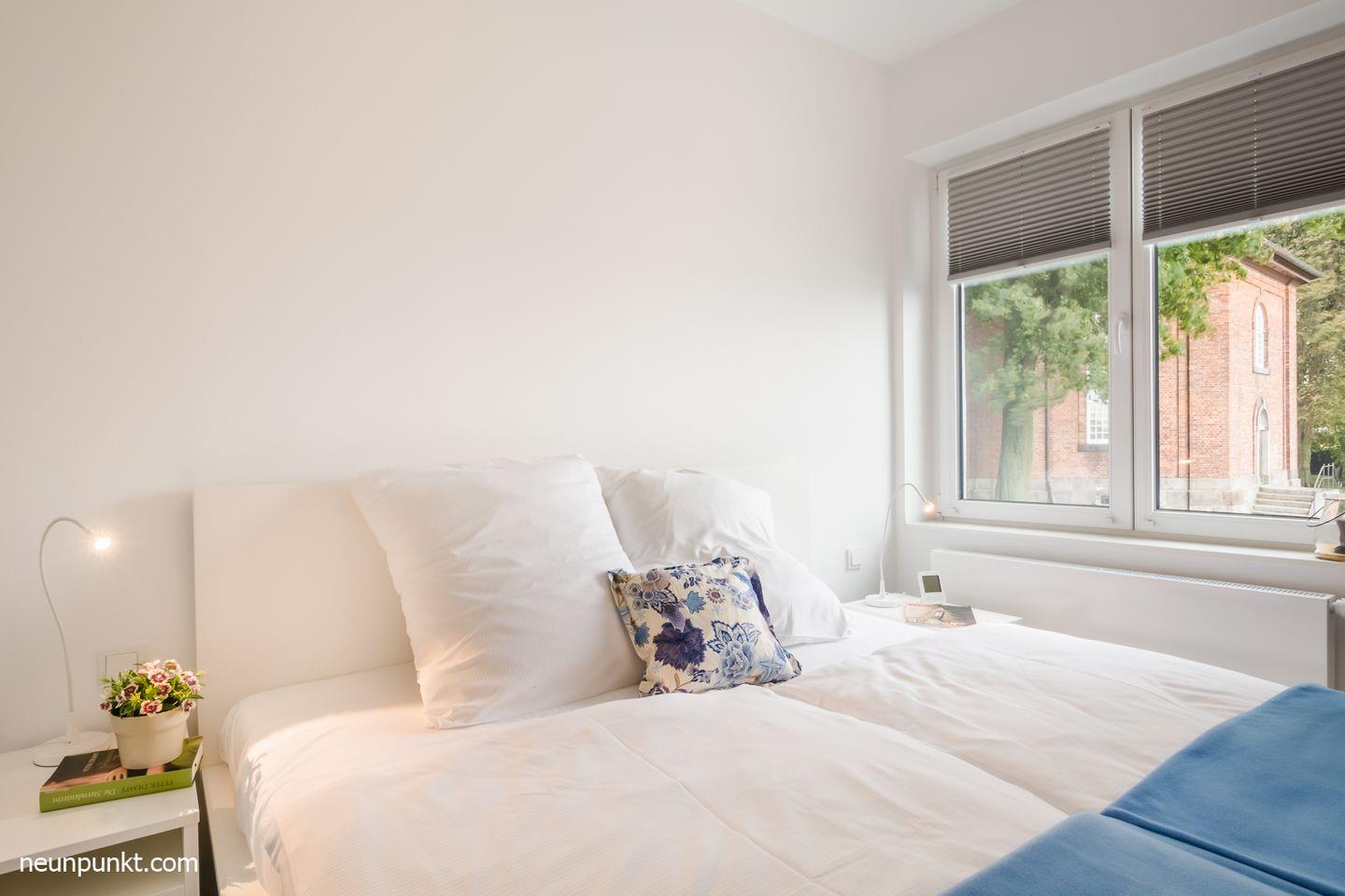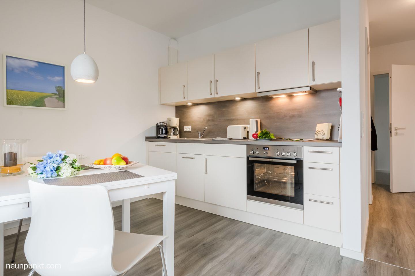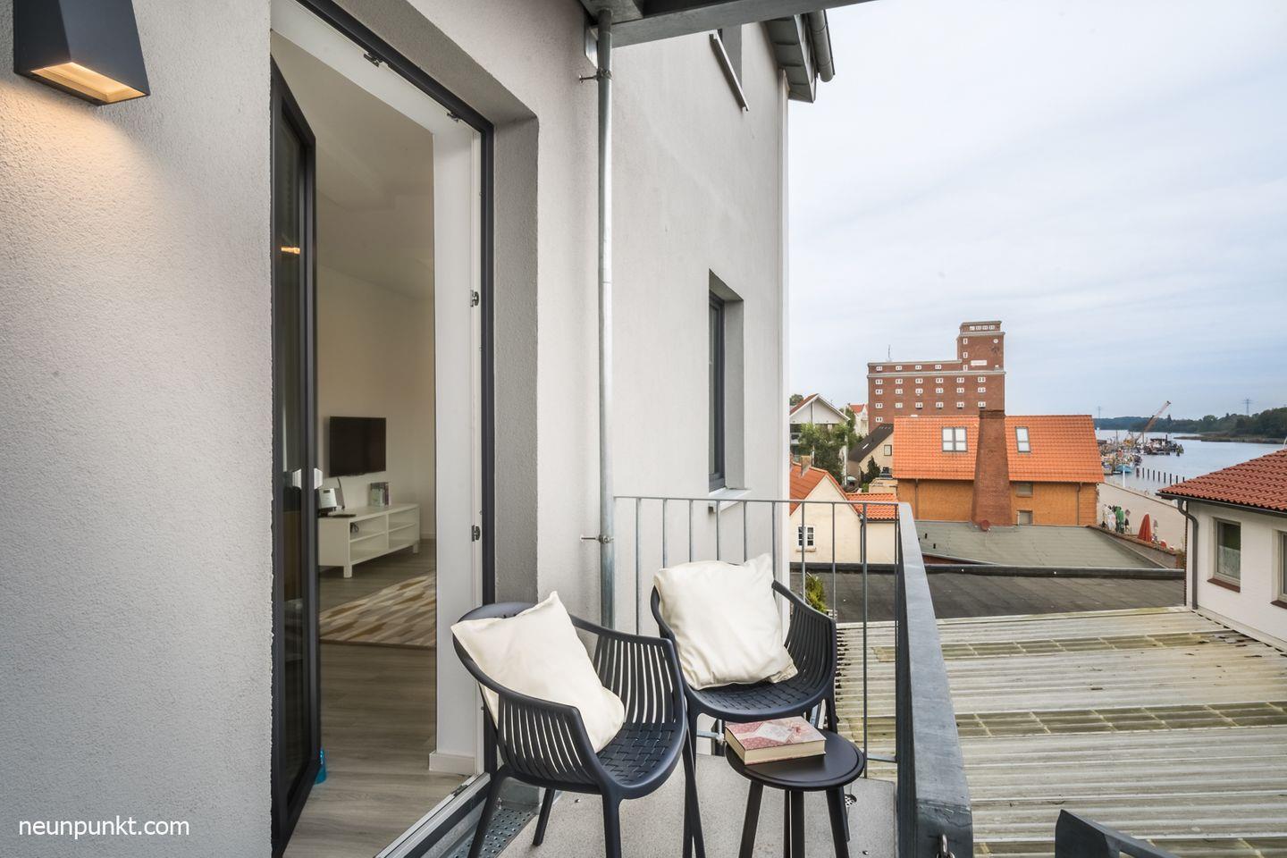 Die Ferienwohnung teilt sich auf in einen Flur mit Garderobe, ein Badezimmer mit einer Dusche und einem Handtuchtrockner, ein Schlafzimmer mit Doppelbett (2x 90x200cm) mit verstellbaren Lattenrosten, ein Wohn-/ Esszimmer mit offener, voll ausgestatteter Küche, kleinem Balkon und Blick auf die Schlei.