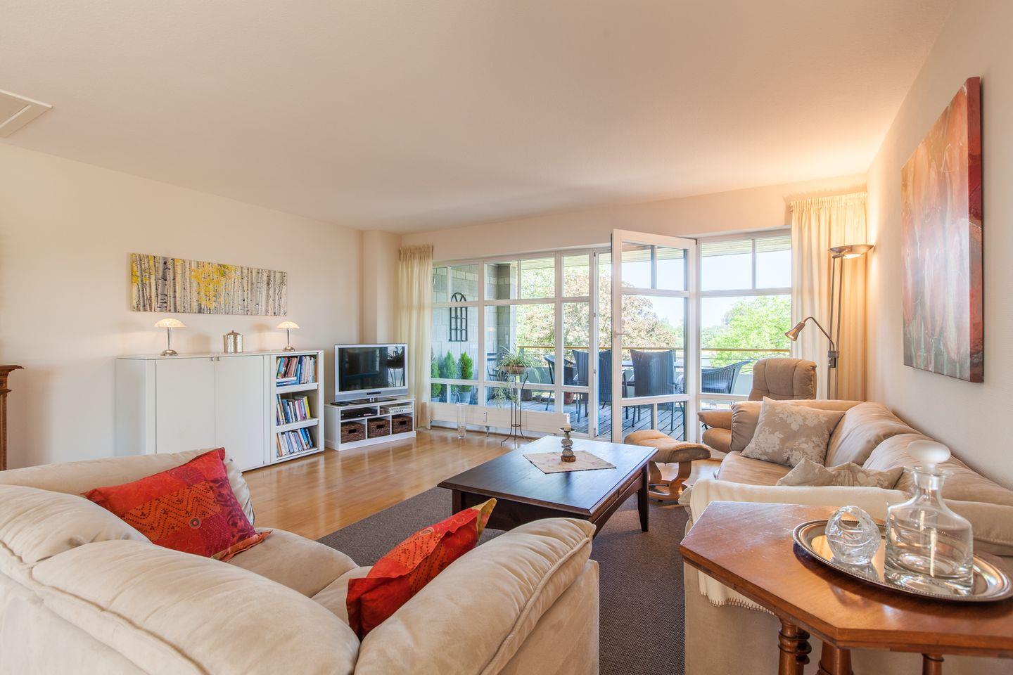Glücksgefühle werden durch den großen, überdachten Balkon mit traumhaftem Schleiblick ausgelöst. Dieser bietet neben modernen Gartenmöbeln ebenfalls einen Elektrogrill und Sonnenliegen.