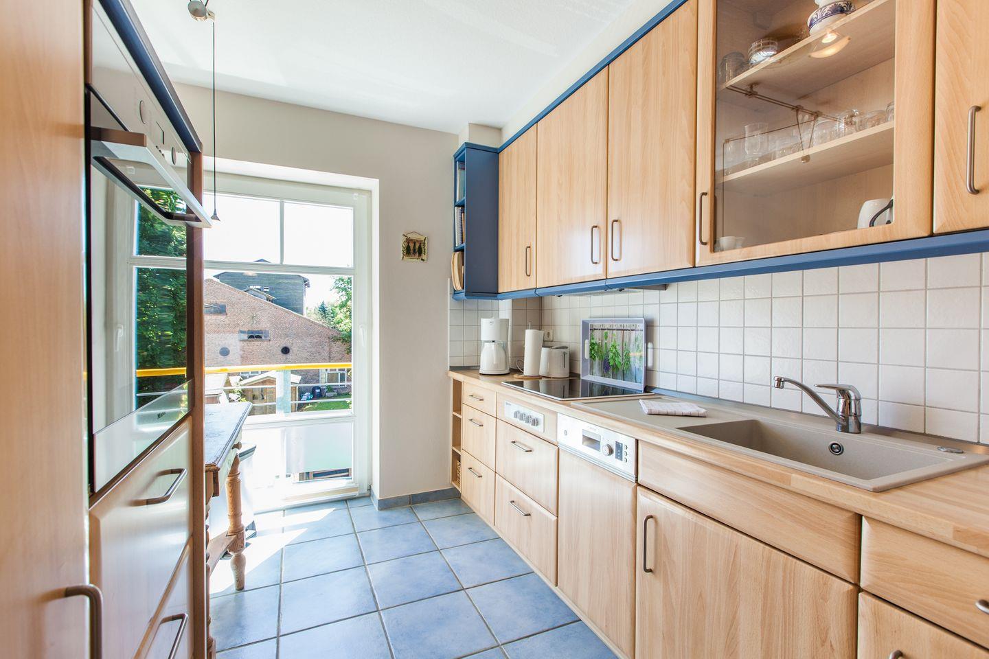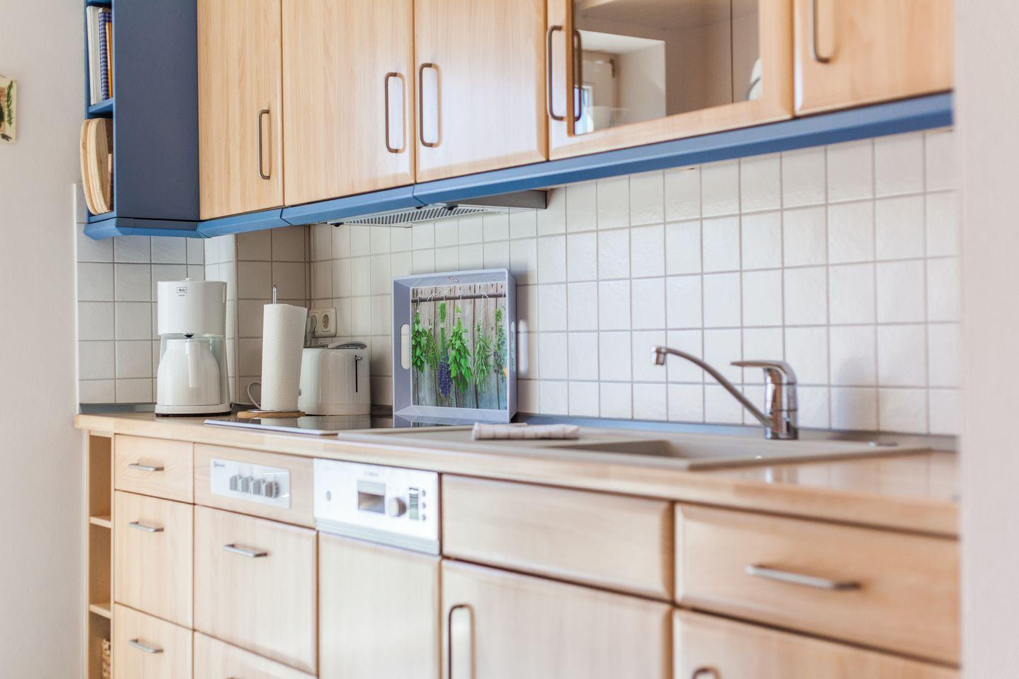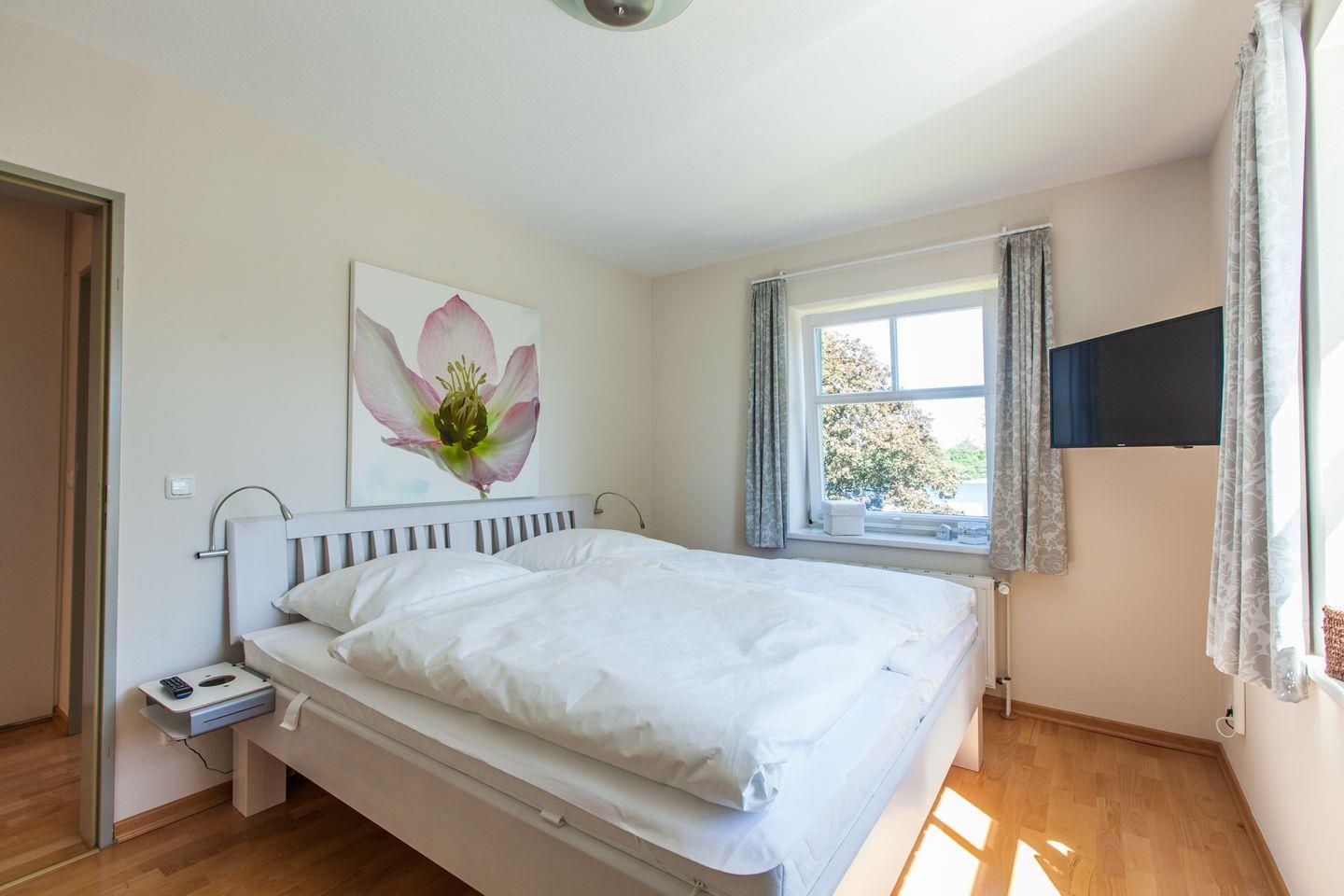 Das gemütliche Schlafzimmer mit Doppelbett (2x 90x200 cm) mit Fliegengitter vor einem Fenster und Flat-TV, sowie die voll ausgestattete Küche lassen keine Wünsche offen.