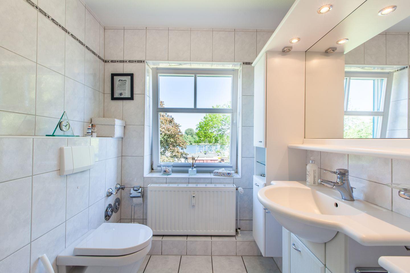 Das hell geflieste Tageslichtbad mit Schleiblick verfügt über eine Dusche.