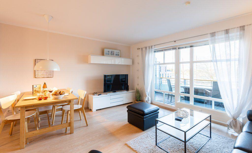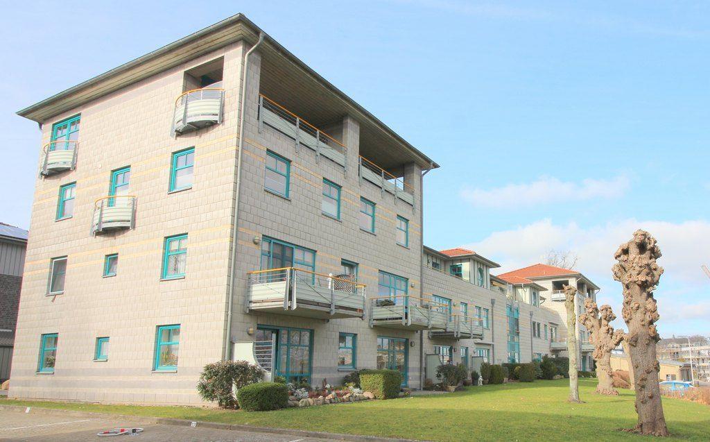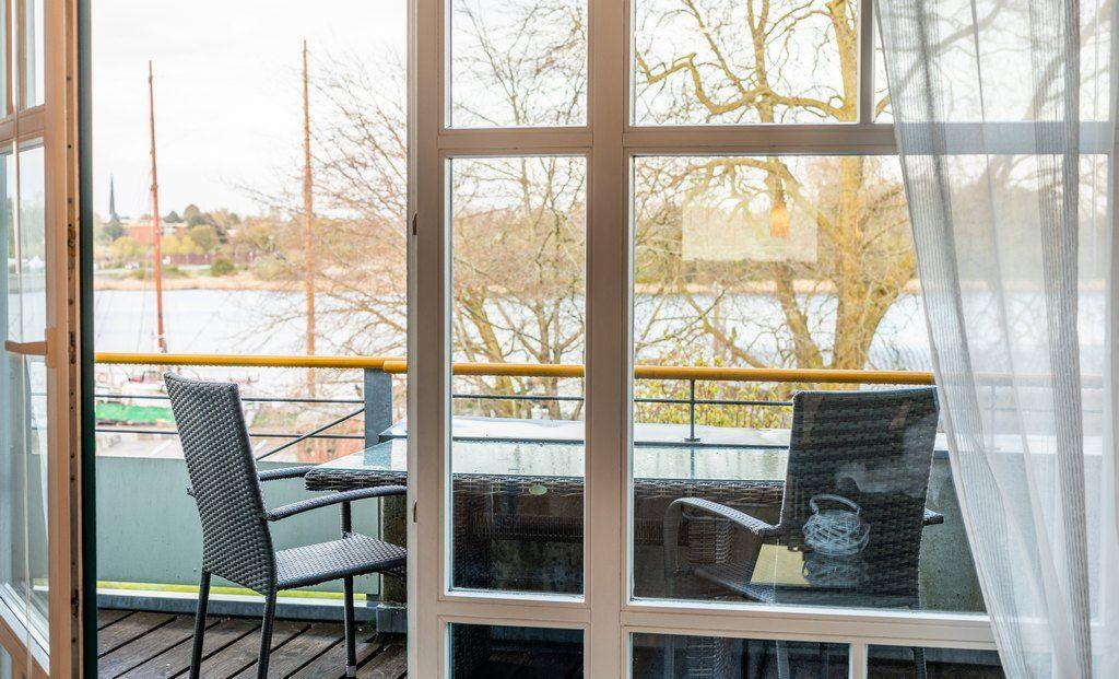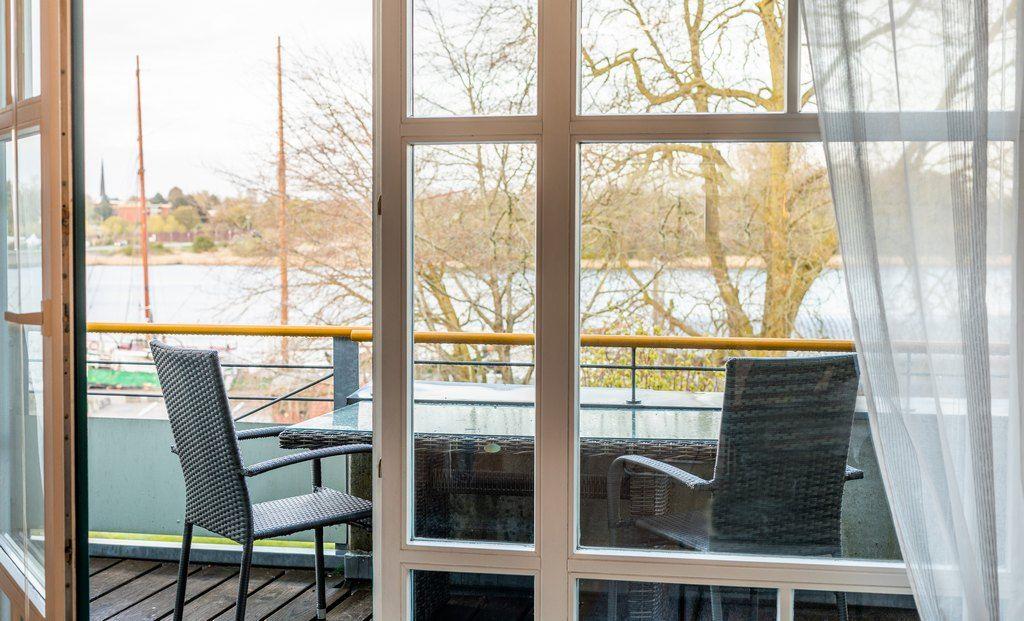 Die Ferienwohnung „Zeitlos“ erstreckt sich über das 1. und 2te Stockwerk eines Mehrfamilienhauses am Südhafen von Kappeln.