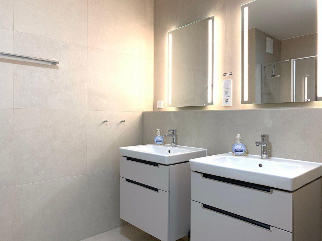 Das zeitgemäße Badezimmer ist mit einer ebenerdigen Dusche ausgestattet.