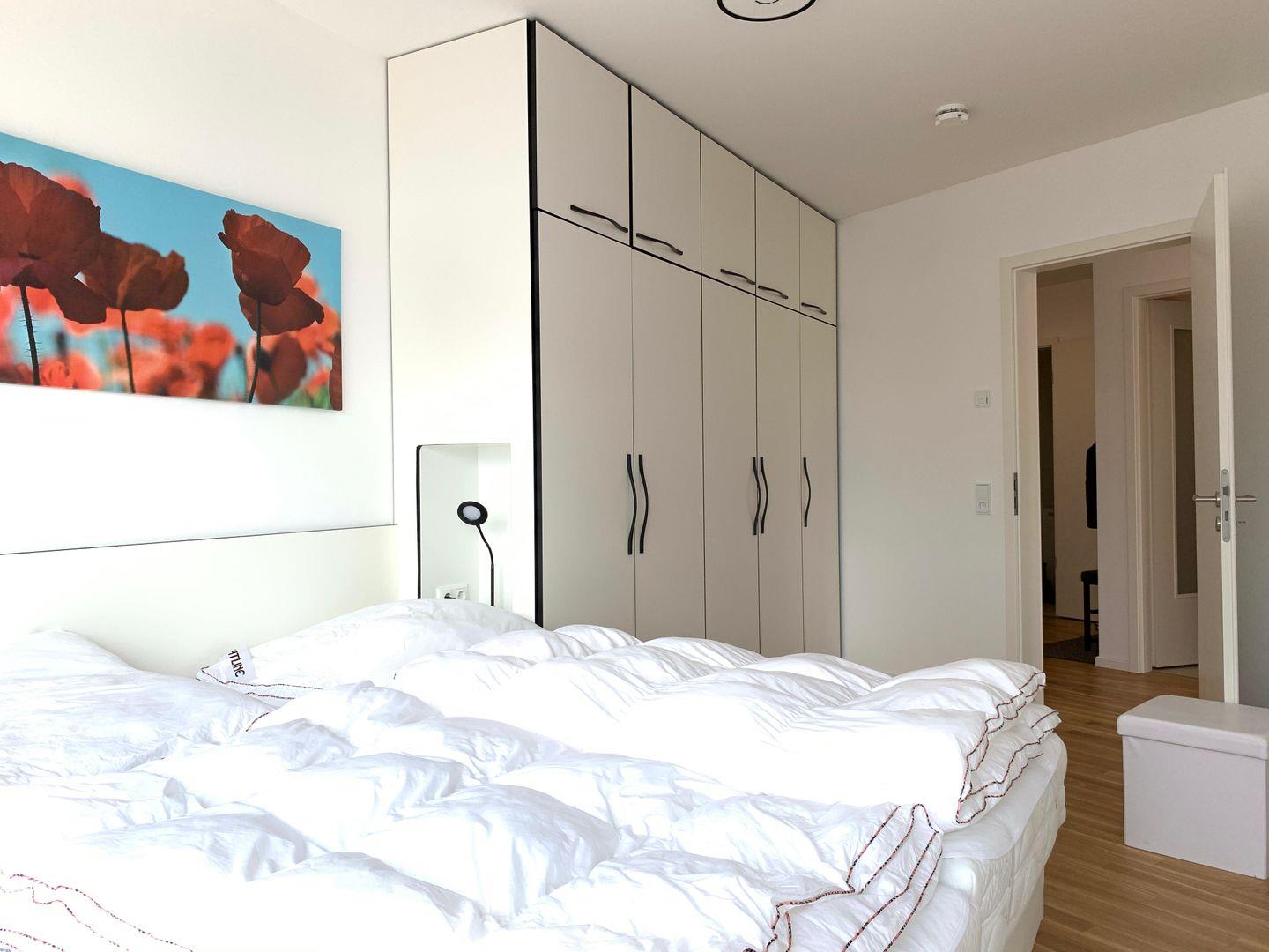 In der Wohnung sind zwei Schlafzimmer vorhanden: Ein Schlafzimmer ist mit einem Doppelbett der Maße 2x 80x200 cm ausgestattet und das andere mit einem Schlafsofa der Maße 160x200 cm. Beide Schlafzimmer verfügen über elektrische Verdunklungsmöglichkeit, Kleiderschränke und Fernsehgeräte.
