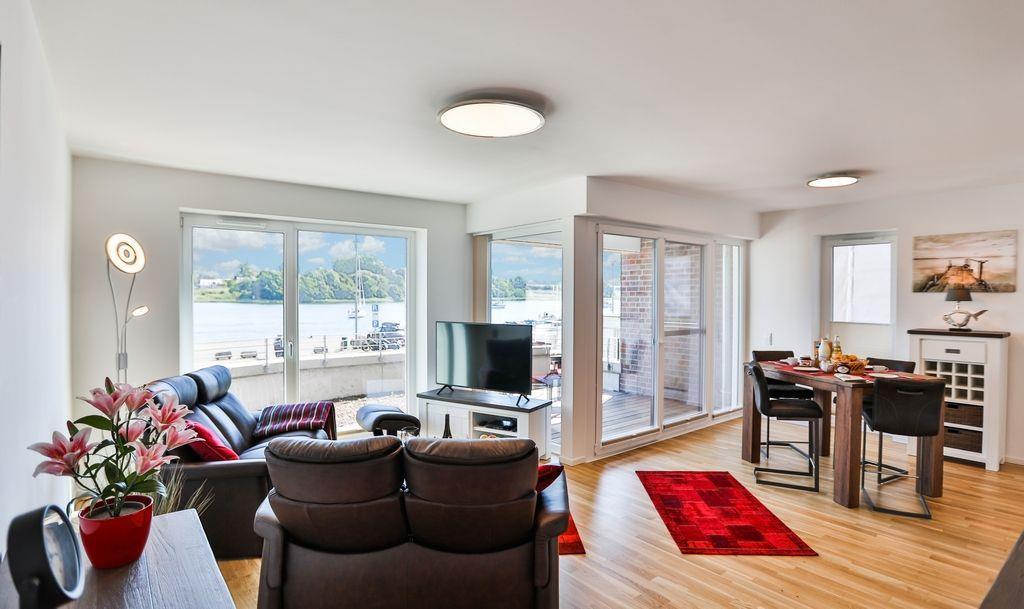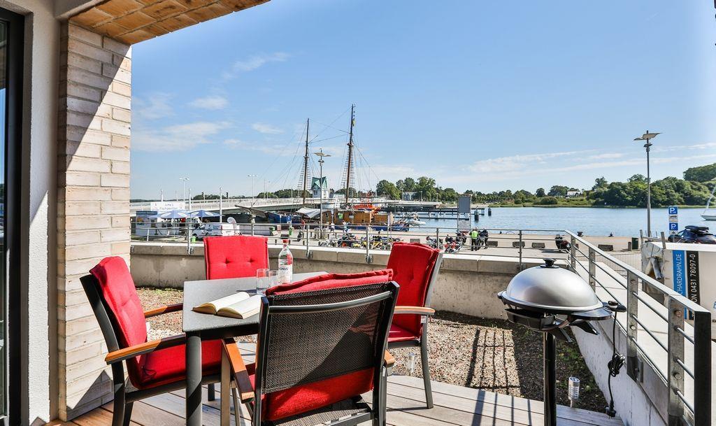 Komfortable Ferienwohnung in Stadtnähe, mit Terrasse und Blick auf die Schleibrücke.