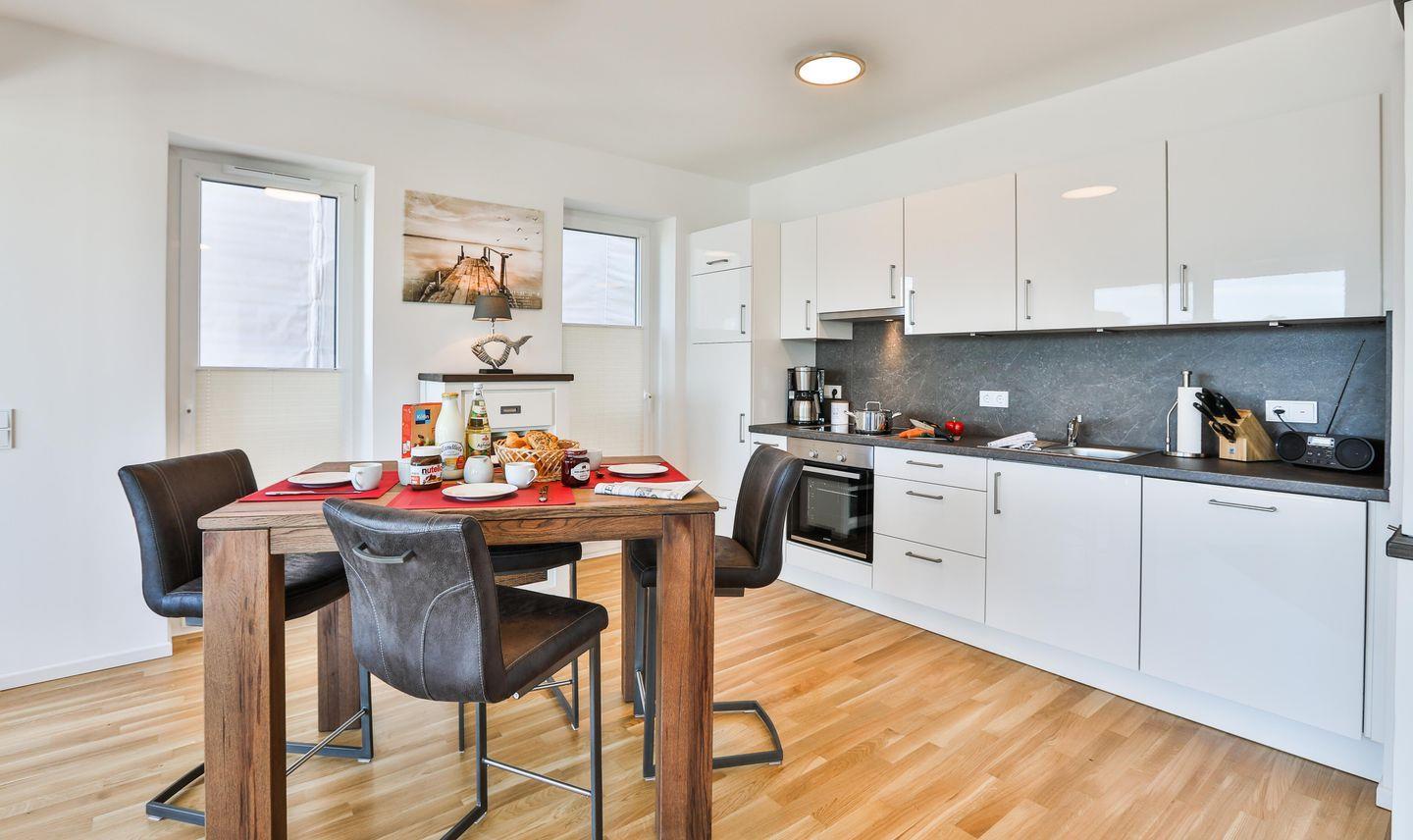 Der großzügige Wohn-/ Essbereich bietet eine moderne Einbauküche, einen großen Esstisch und eine komfortable Sofaecke mit Fernsehgerät. Des Weiteren befindet sich hier der Zugang zur Terrasse, welche mit Gartenmöbeln und einem Elektrogrill bestückt ist.