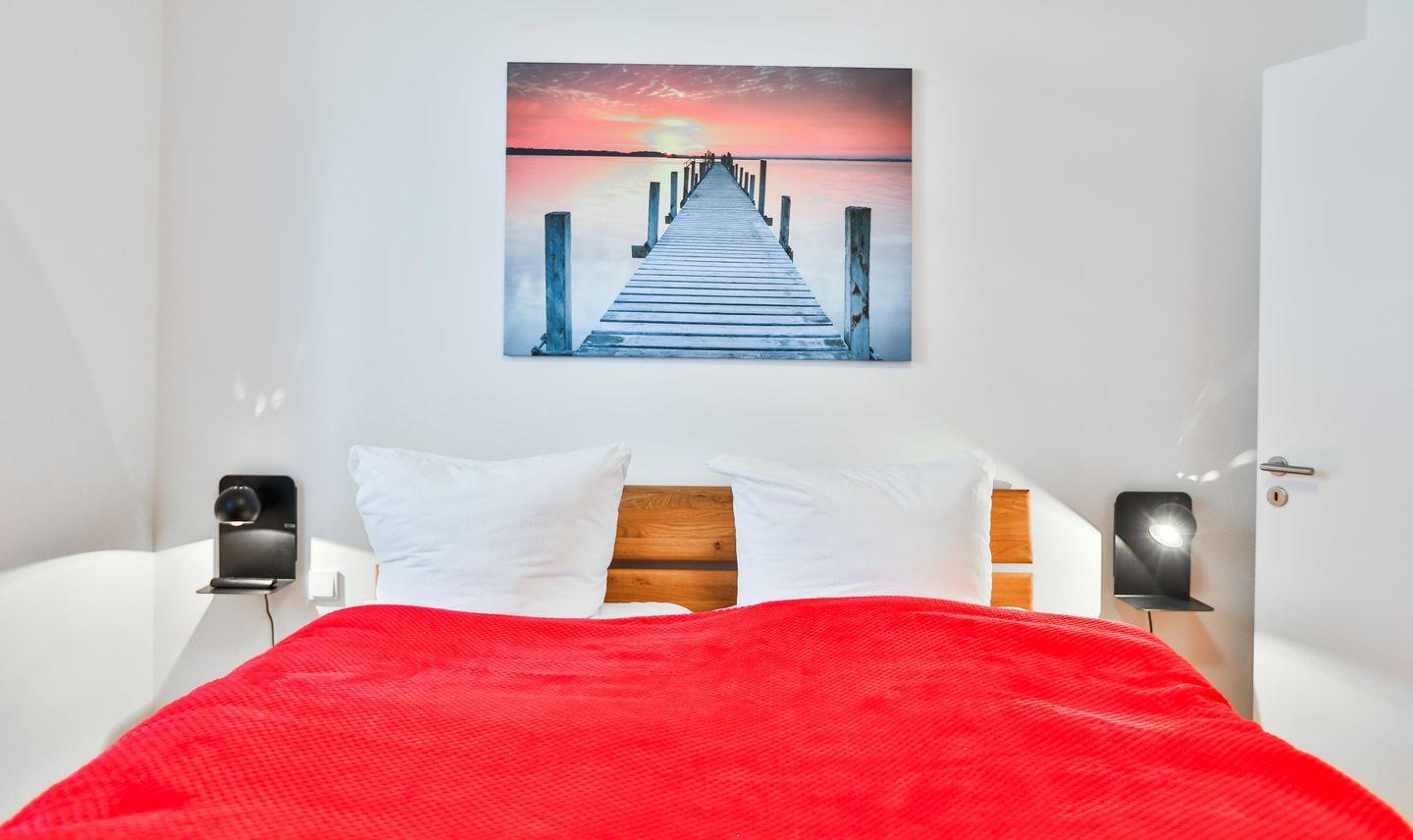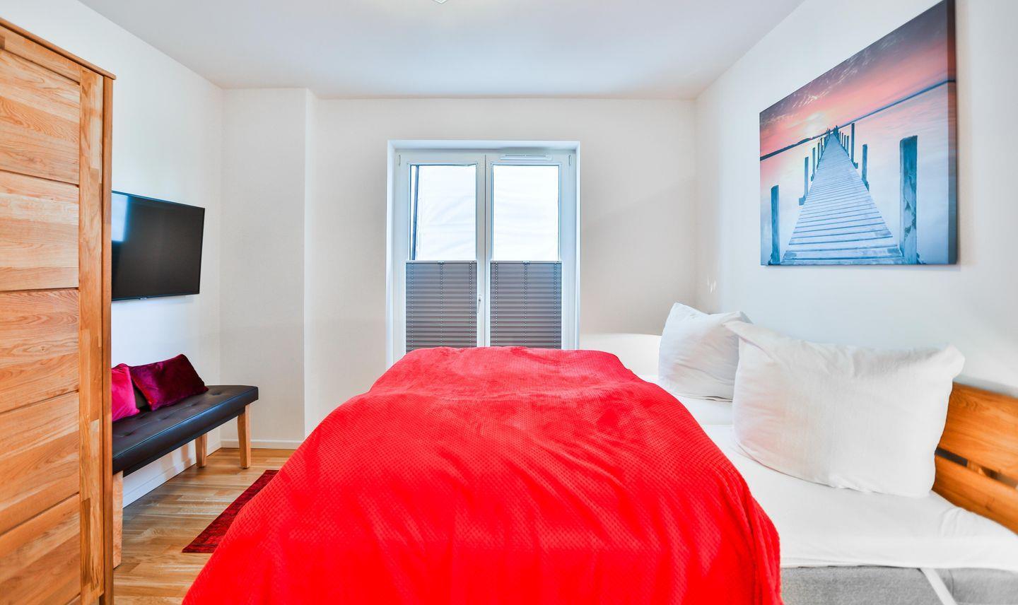 Die gemütlichen Schlafzimmer der Wohnung verfügen über Doppelbetten der Größe 2x 90x200cm und 140x200cm, Kleiderschränke, Fernsehgeräte und Verdunklungsplissees.