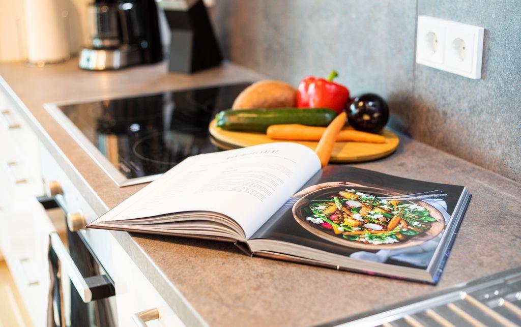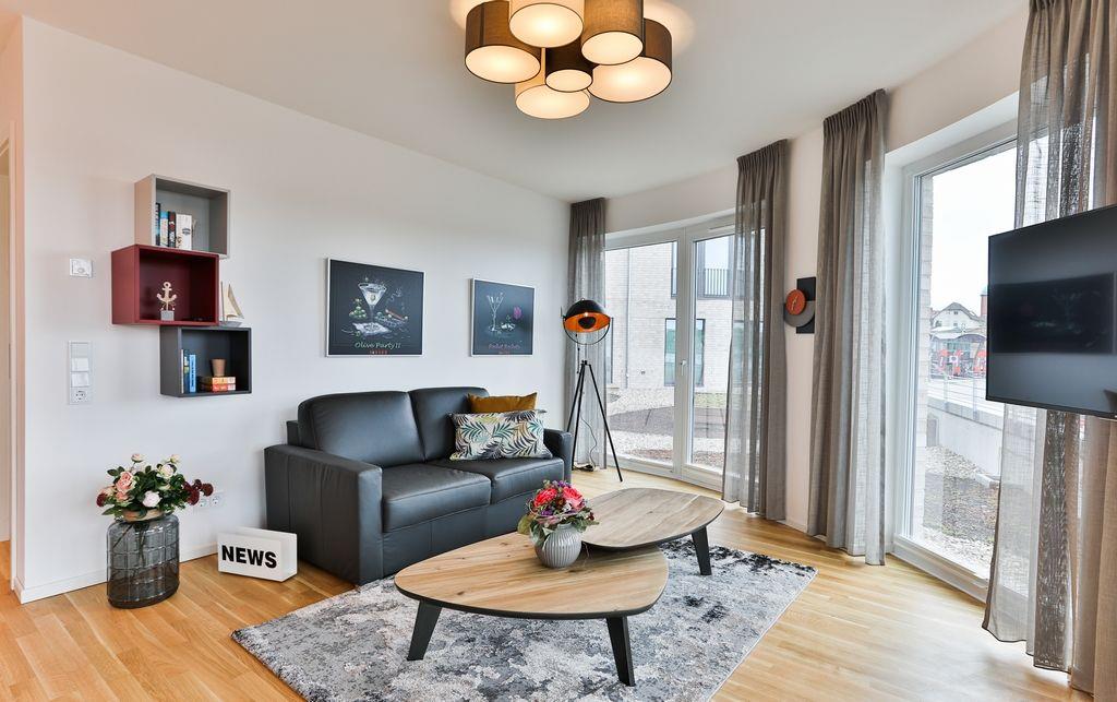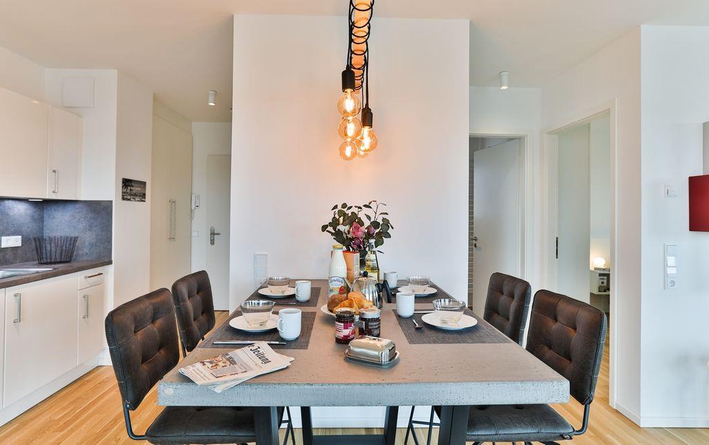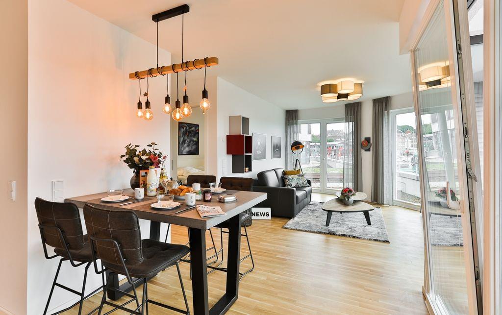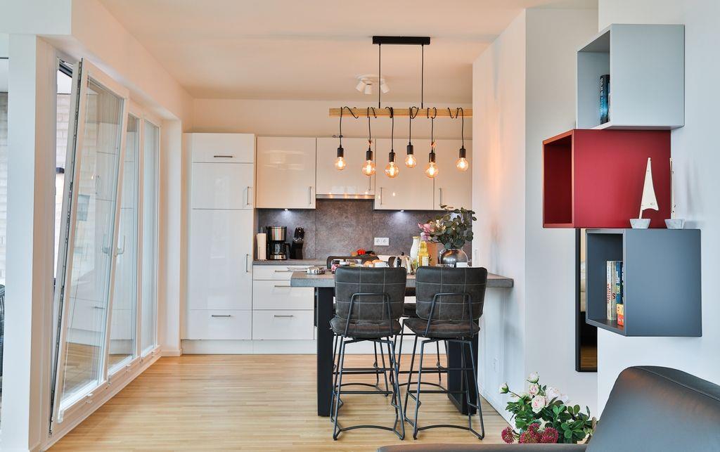 Durch den Eingangsbereich der Wohnung gelangt man zunächst in den hellen, offenen Wohn-/ Essbereich, welcher mit einer modernen Einbauküche, einem Esstisch und einer gemütlichen Sofagarnitur ausgestattet ist. Über den Wohn-/ Essbereich gelangt man außerdem auf die Terrasse. Diese ist mit Gartenmöbeln und einem Elektrogrill versehen.