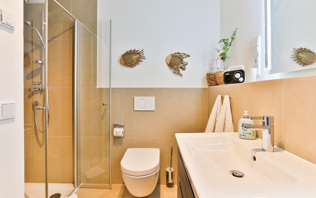 Gegenüber vom Schlafzimmer befindet sich das Badezimmer, welches über eine ebenerdige Dusche und weiteren Ausstattungen des täglichen Bedarfs verfügt.